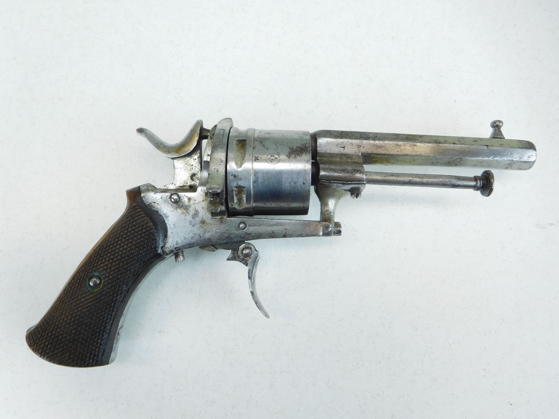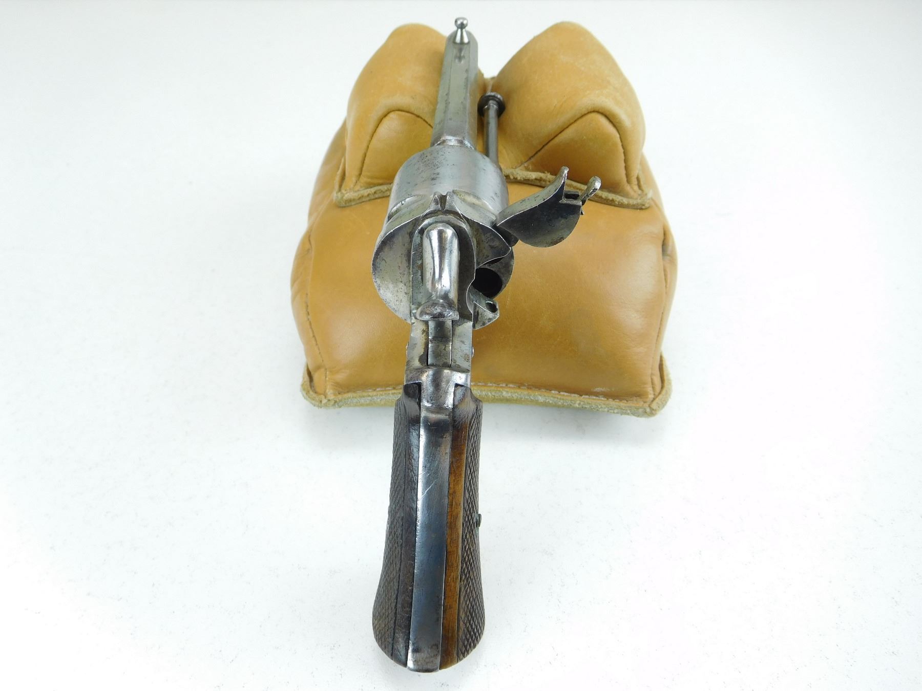 PRE 1893 PROOF ON THE BARREL, RAISED BEAD FRONT AND V NOTCH REAR SIGHT, SINGLE ACTION, COCKS AND HOLDS, BORE IS DARK, TWO PIECE CHECKERED WOOD GRIPS , ACTION: REVOLVER , BARREL LENGTH: 82MM , STOCK # P1878 , SERIAL # 722 , CONDITION: 6/10 , CLASS: CANADIAN PROHIBITED CLASS