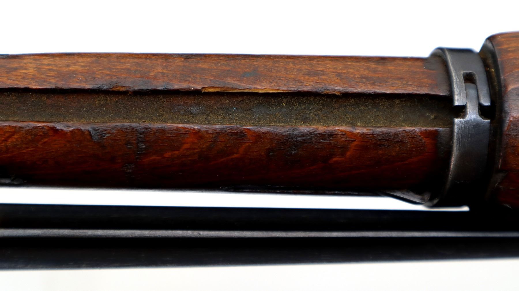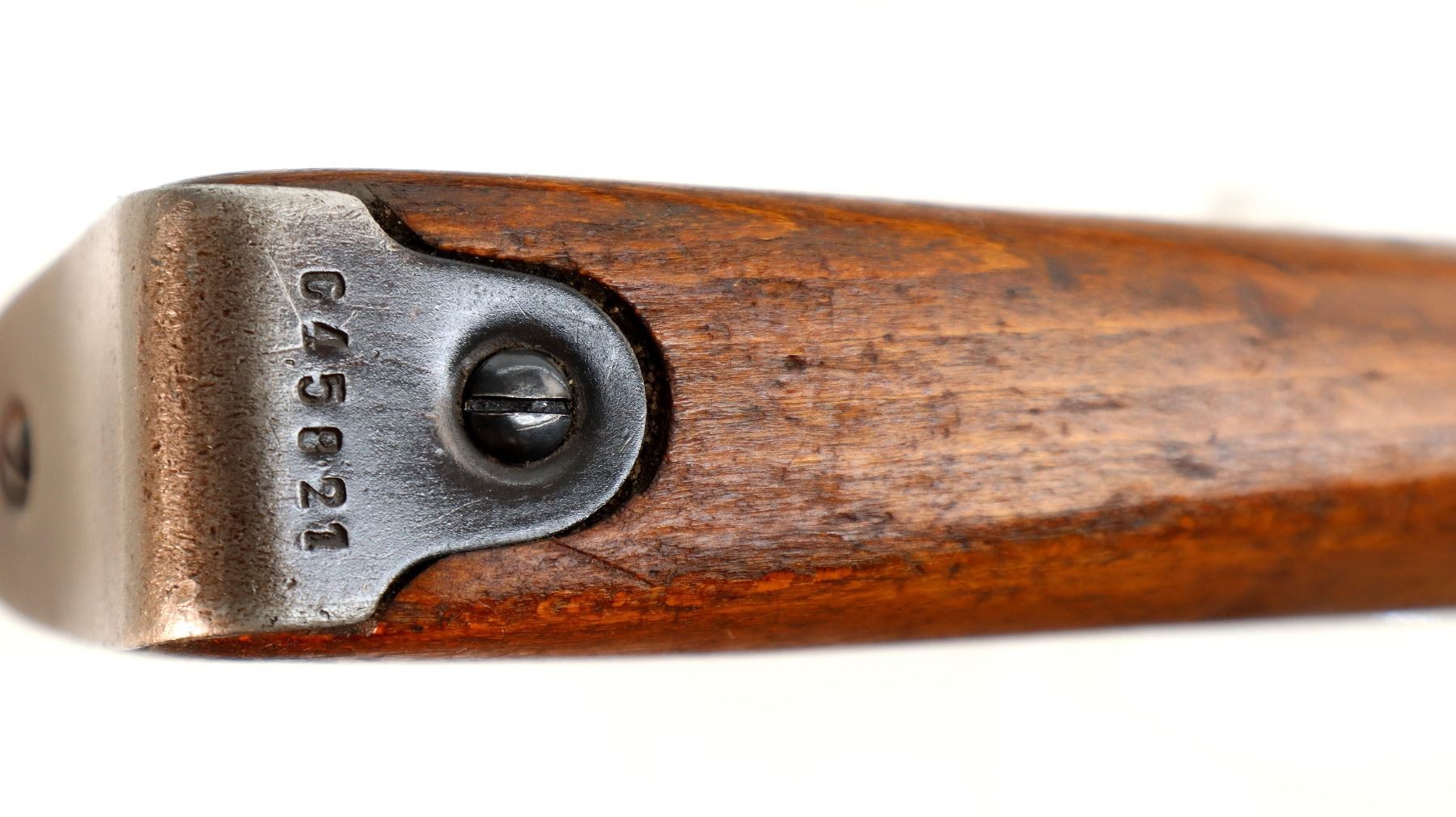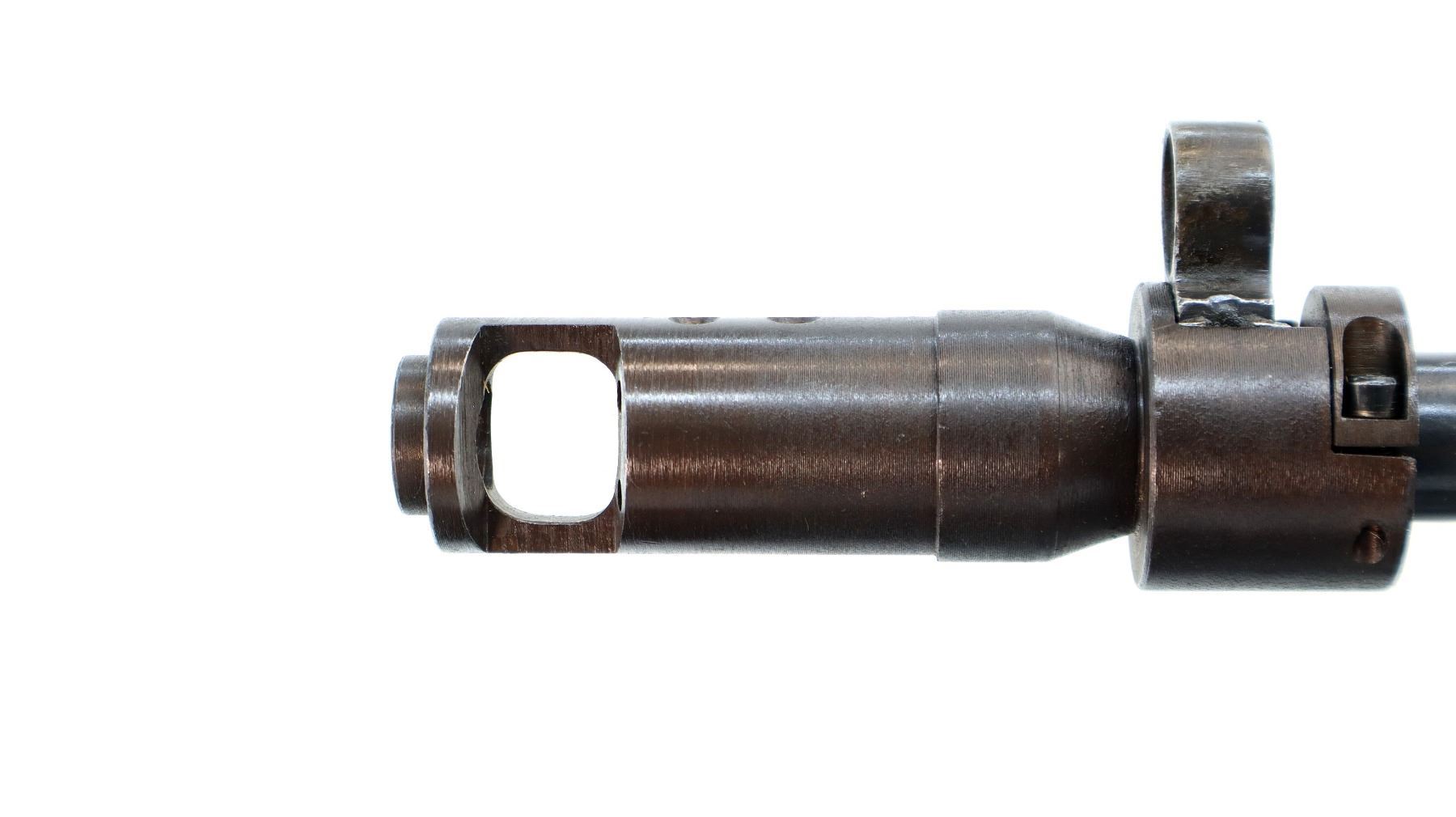 Main Description: Bolt and magazine match, butt plate does not. Post front sight with hood and ramp, adjustable u notched rear sight, blued finish, round receiver, silver bolt with straight handle. Two piece full military wood stocks, finger grooved forearm, straight grip, smooth steel butt plate, sling slots, attached folding cruciform bayonet, Muzzle has a clamp on aftermarket ported brake installed, missing cleaning rod.