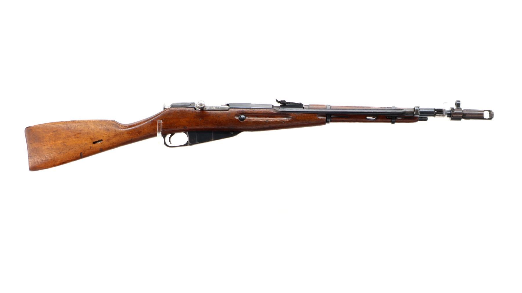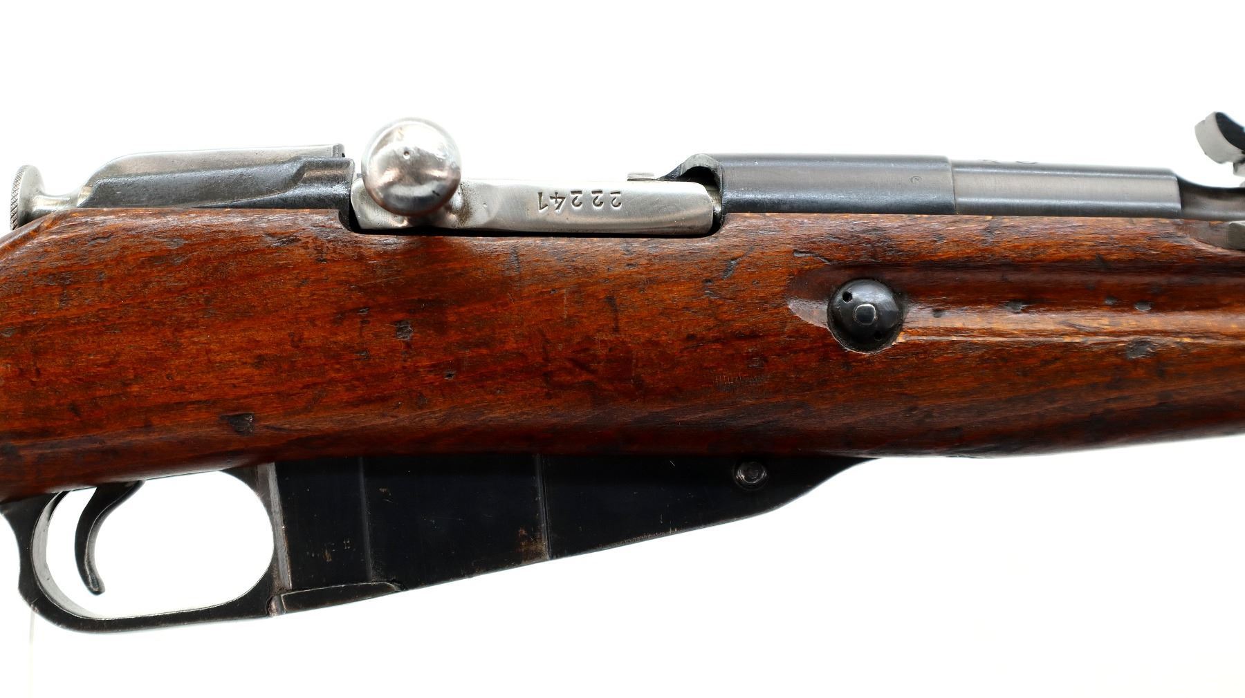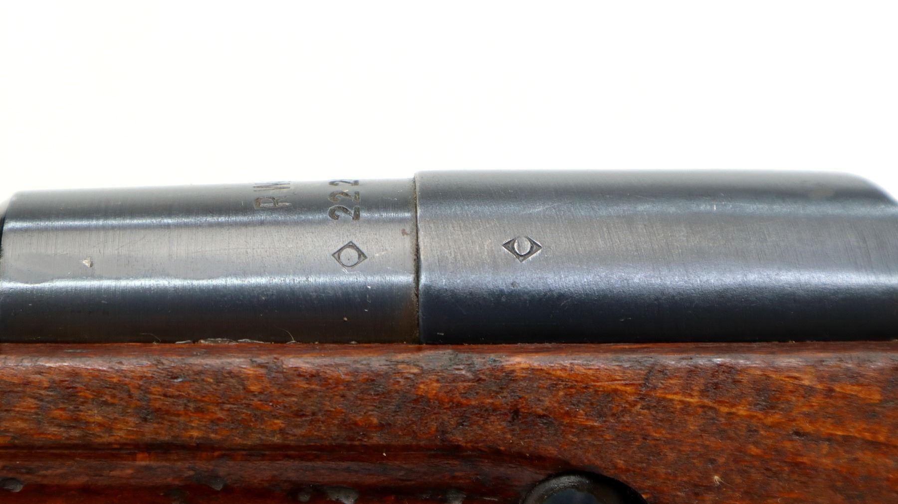 Main Description: Bolt and magazine match, butt plate does not. Post front sight with hood and ramp, adjustable u notched rear sight, blued finish, round receiver, silver bolt with straight handle. Two piece full military wood stocks, finger grooved forearm, straight grip, smooth steel butt plate, sling slots, attached folding cruciform bayonet, Muzzle has a clamp on aftermarket ported brake installed, missing cleaning rod.