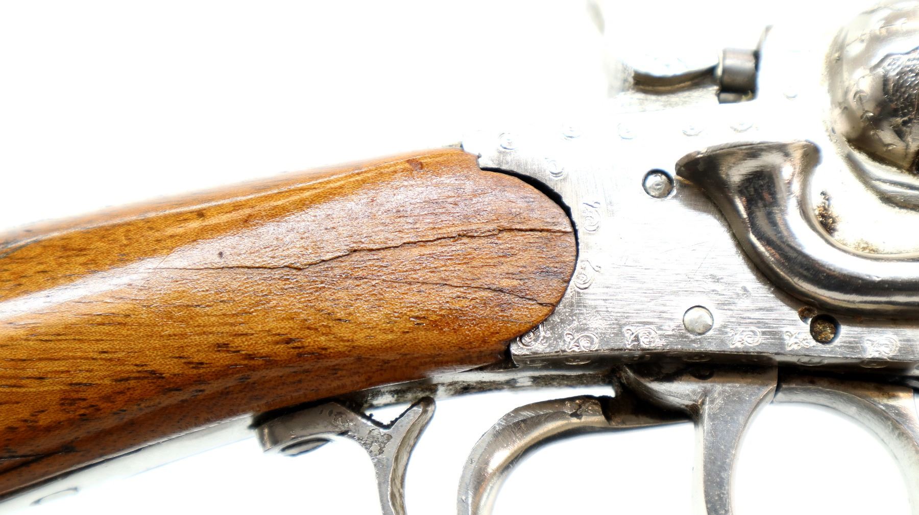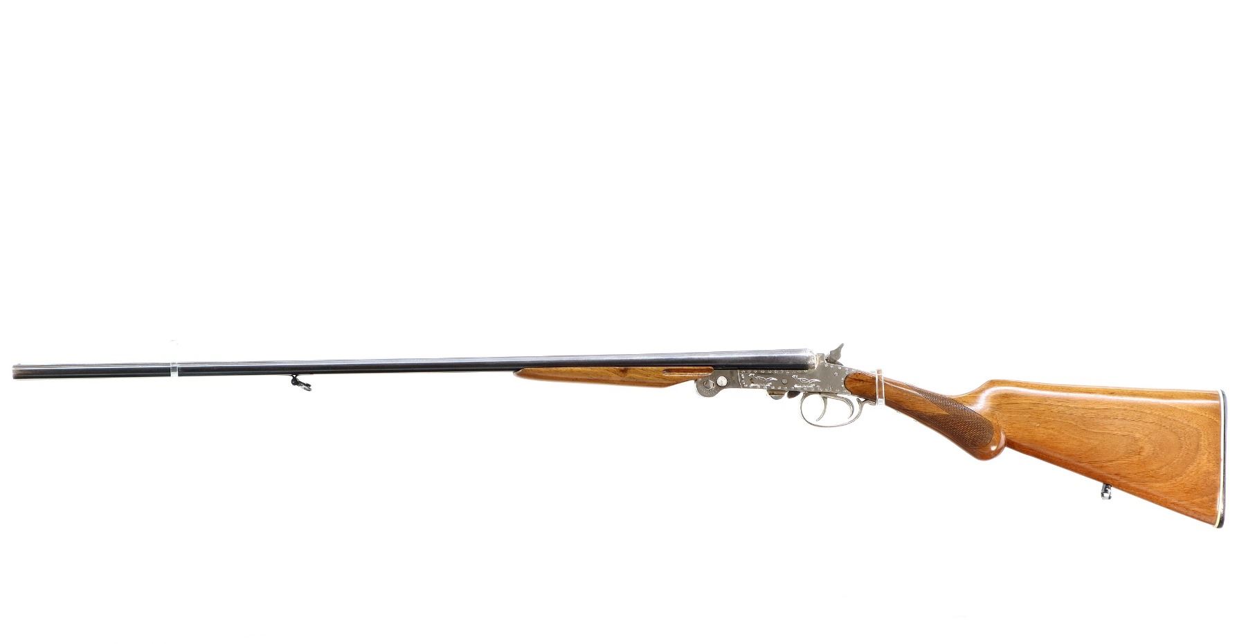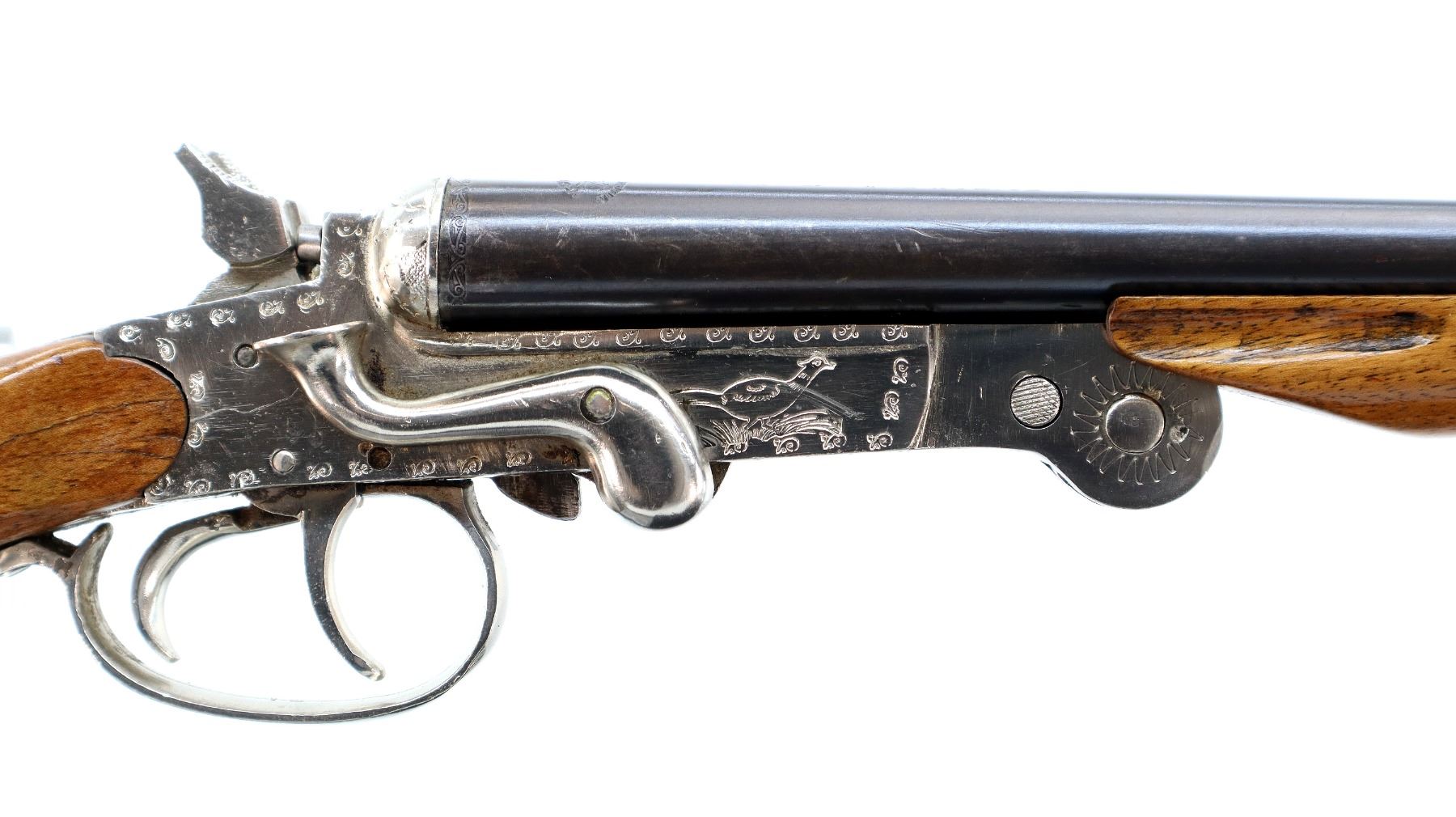 Main Description: Silver bead, blued barrels, engraved Nickel receiver, grooved spur hammers that function, extractor, double triggers. Two piece wood stocks, checkered pistol grip, cracked behind receiver both sides, Basket weave textured black polymer butt plate, sling swivels. Note: barrel opening lever spring is weak, barrel slightly loose require adjustment or repair.