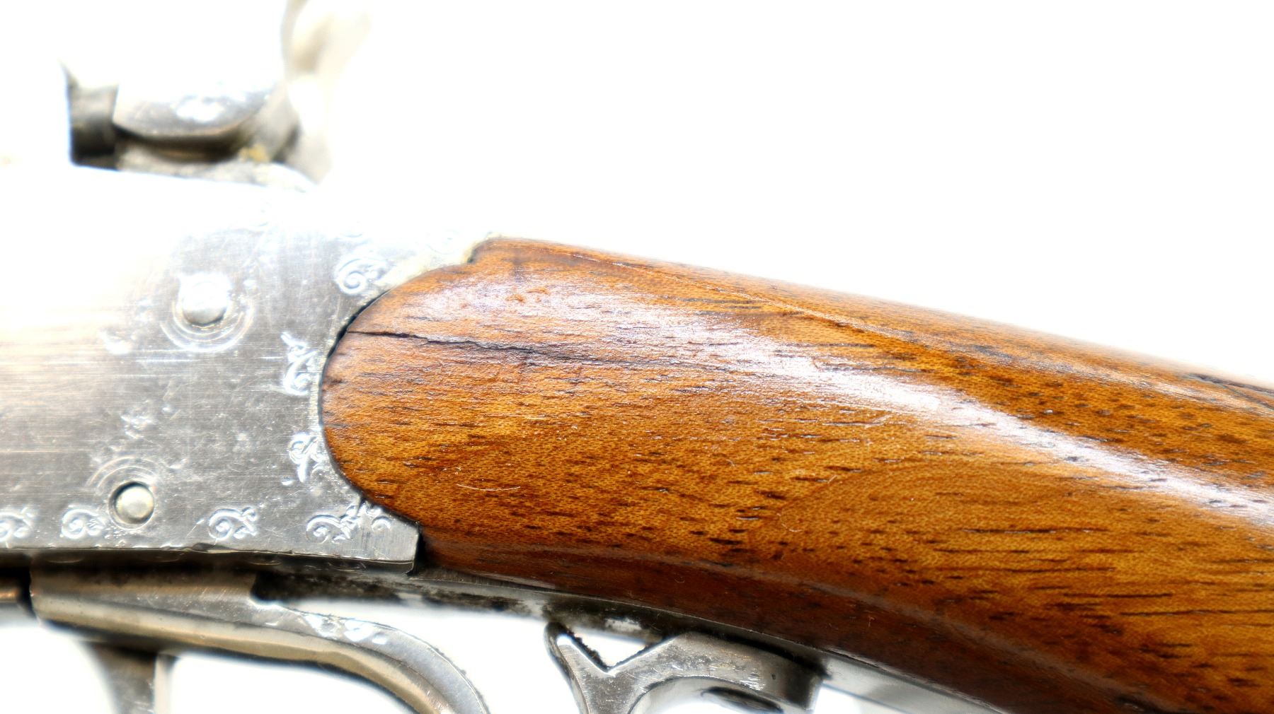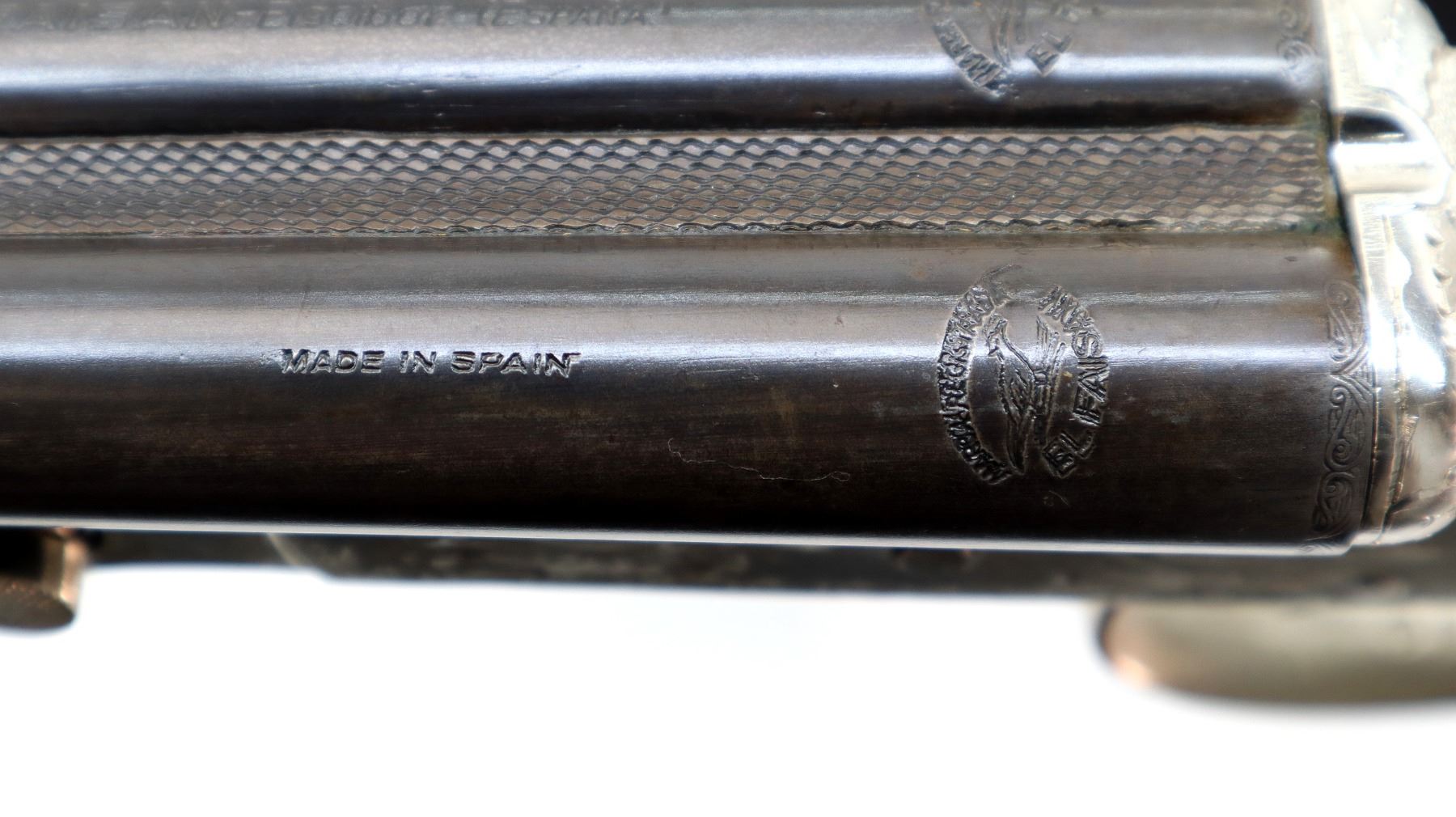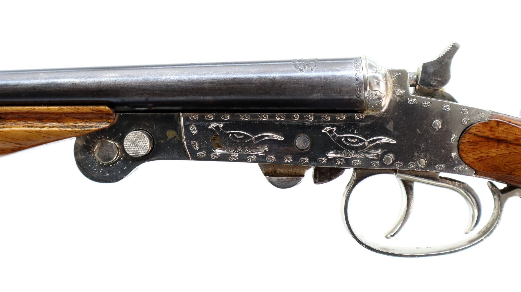 Main Description: Silver bead, blued barrels, engraved Nickel receiver, grooved spur hammers that function, extractor, double triggers. Two piece wood stocks, checkered pistol grip, cracked behind receiver both sides, Basket weave textured black polymer butt plate, sling swivels. Note: barrel opening lever spring is weak, barrel slightly loose require adjustment or repair.