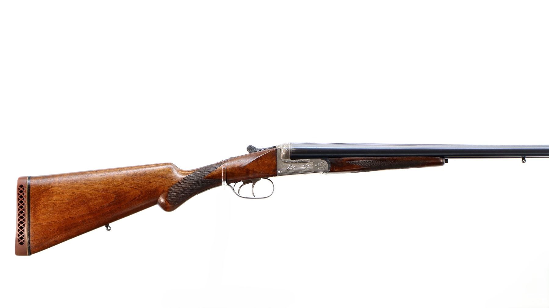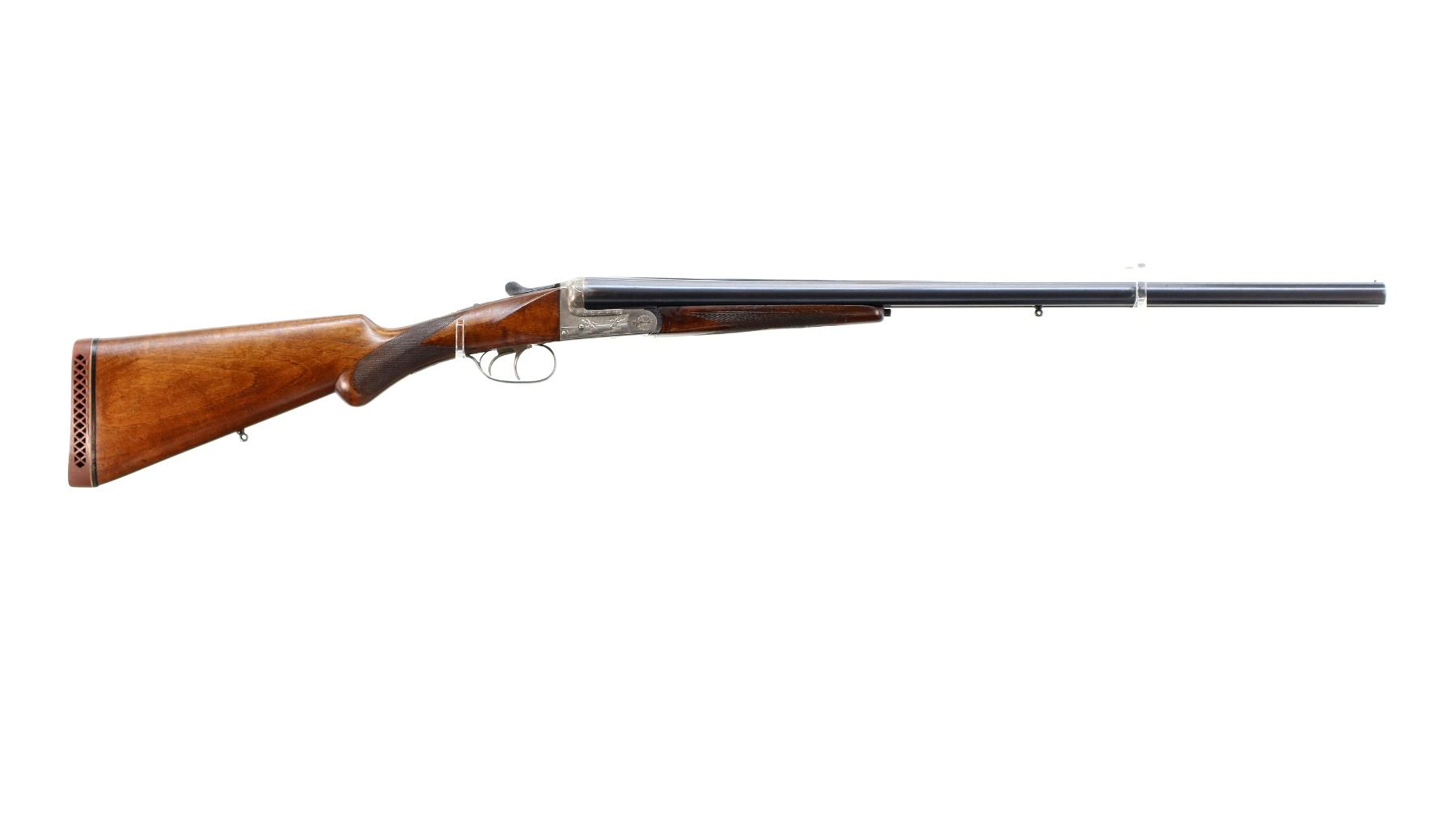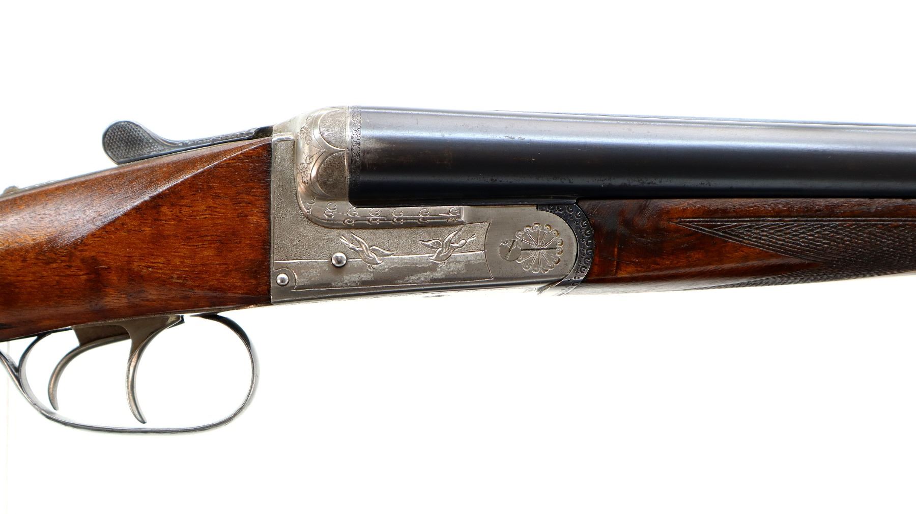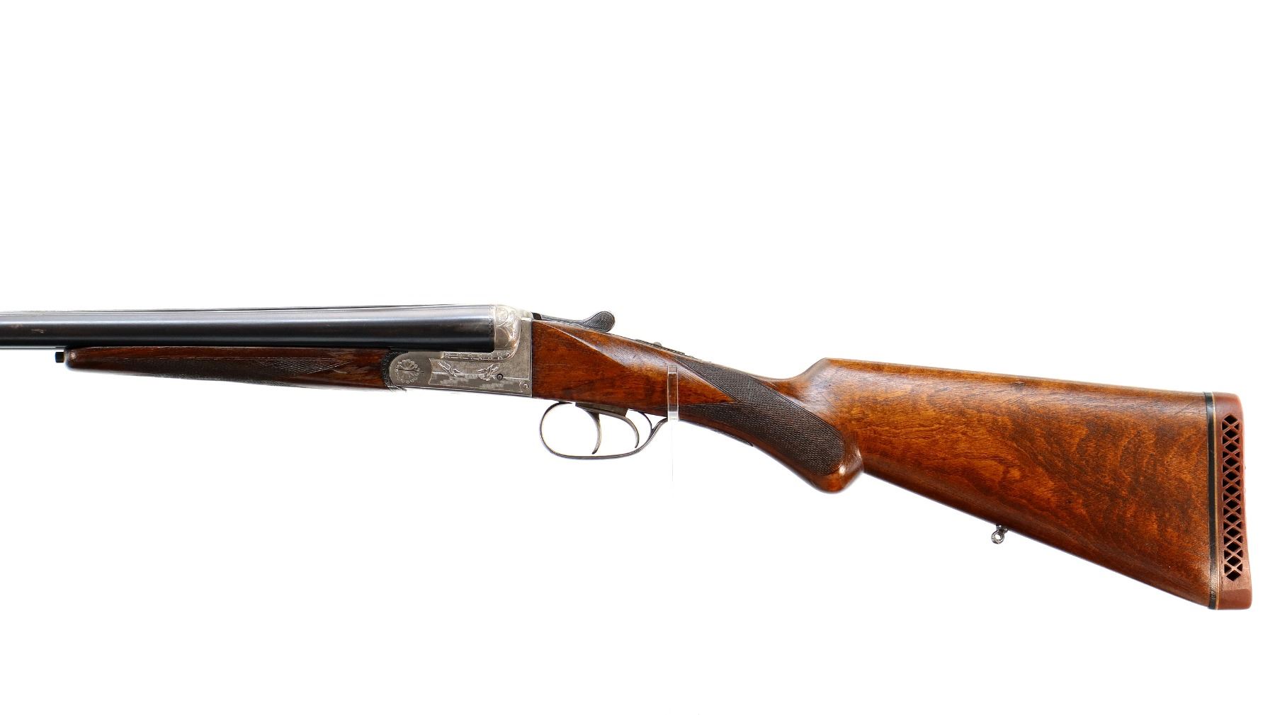 Main Description: Brass bead, blued barrels with raised solid rib, silver engraved receiver pin protruding on right side, automatic safety, extractor, double triggers. Two piece wood stocks, checkered forearm and pistol grip chipped and cracked behind upper tang, brown vented rubber recoil pad, swivel studs.