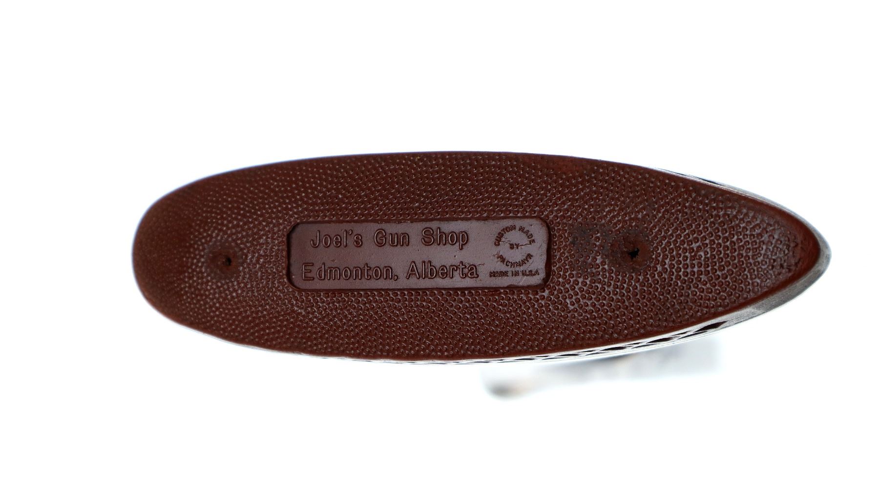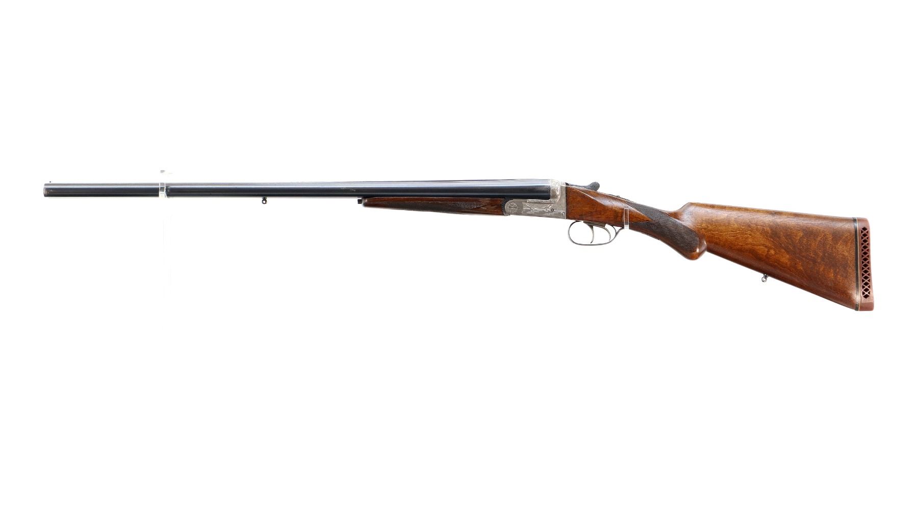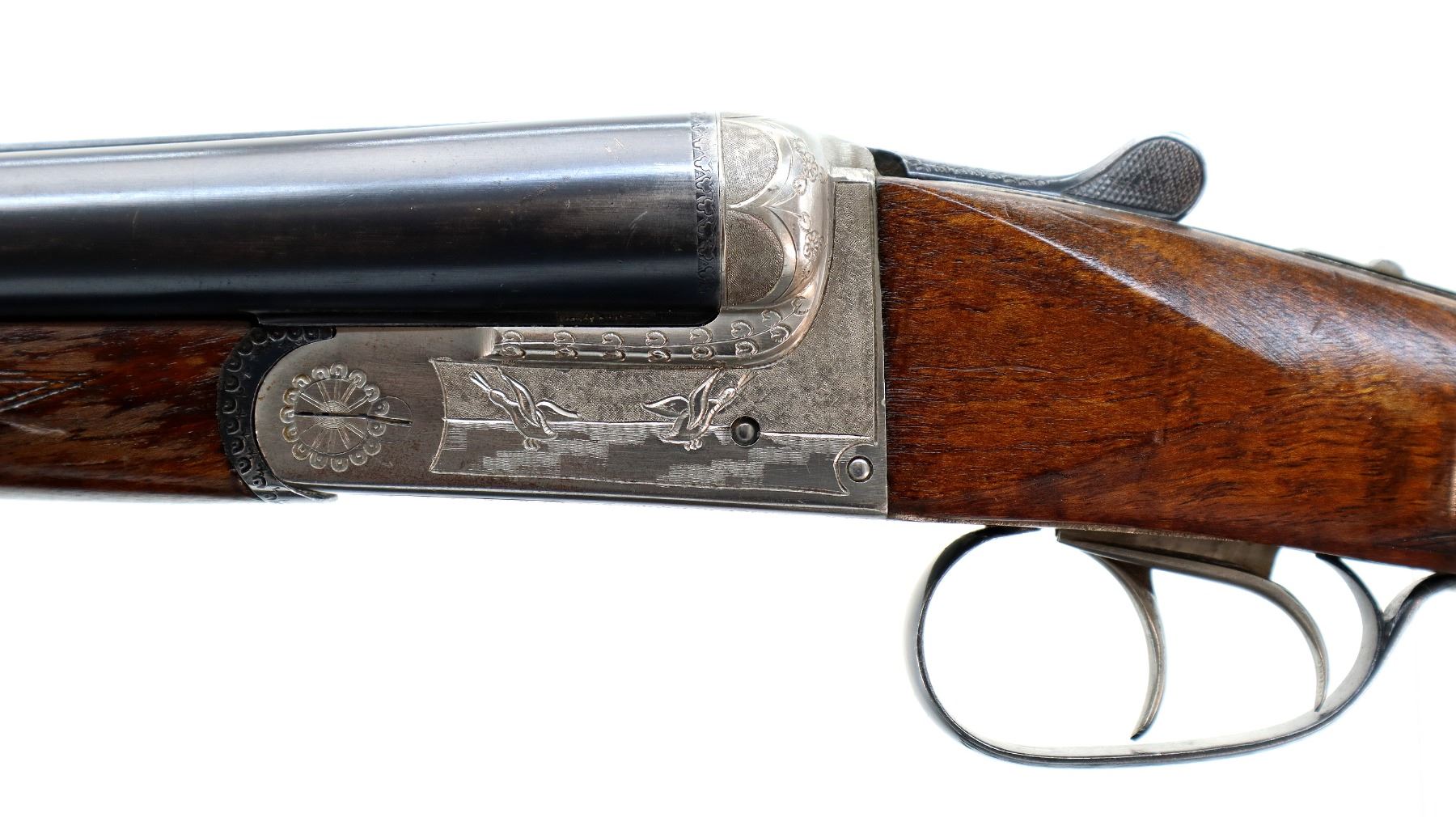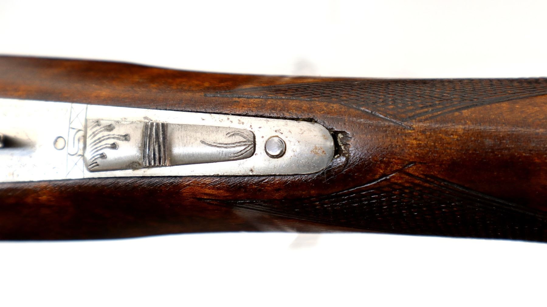 Main Description: Brass bead, blued barrels with raised solid rib, silver engraved receiver pin protruding on right side, automatic safety, extractor, double triggers. Two piece wood stocks, checkered forearm and pistol grip chipped and cracked behind upper tang, brown vented rubber recoil pad, swivel studs.