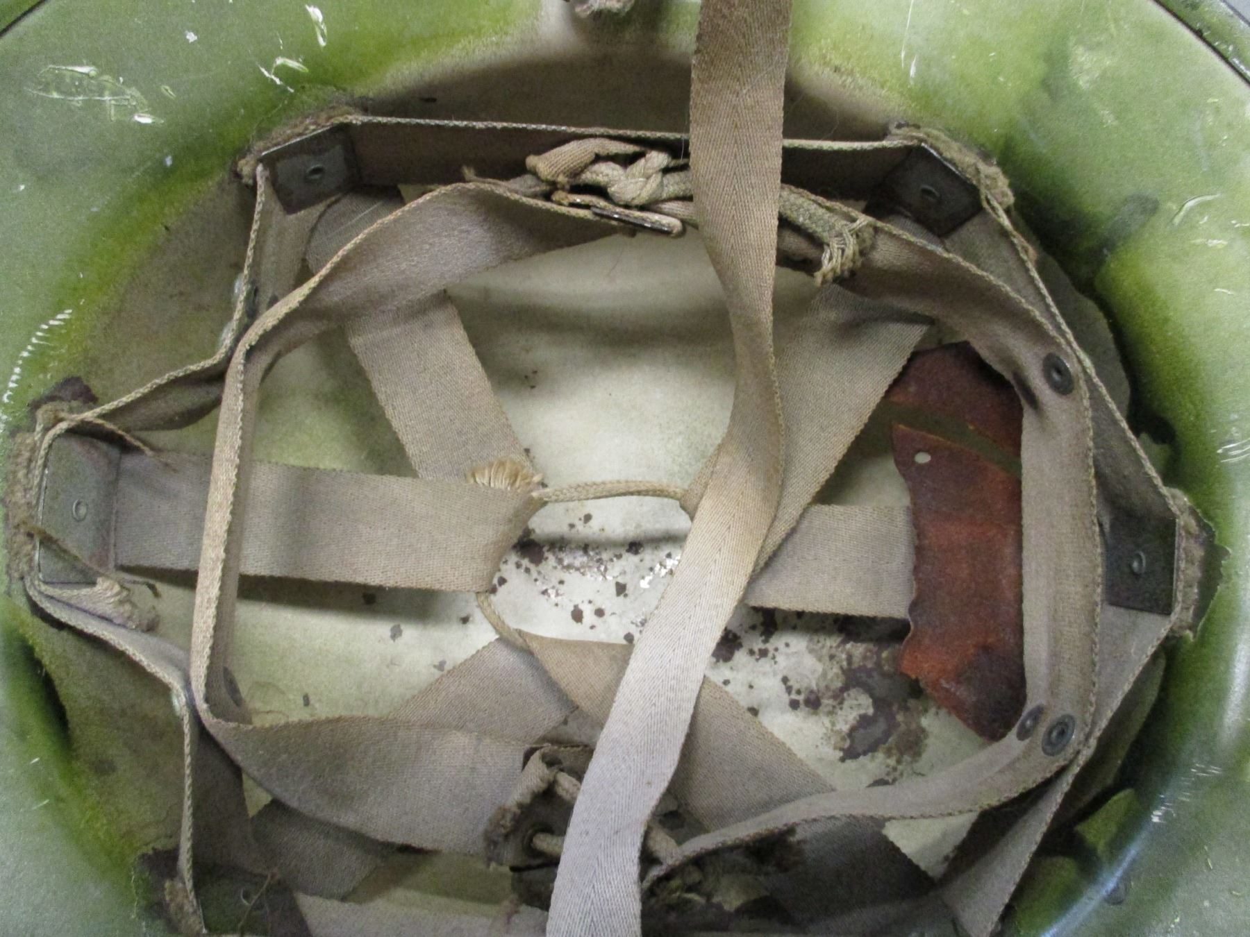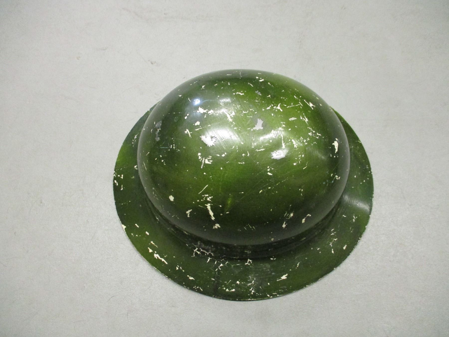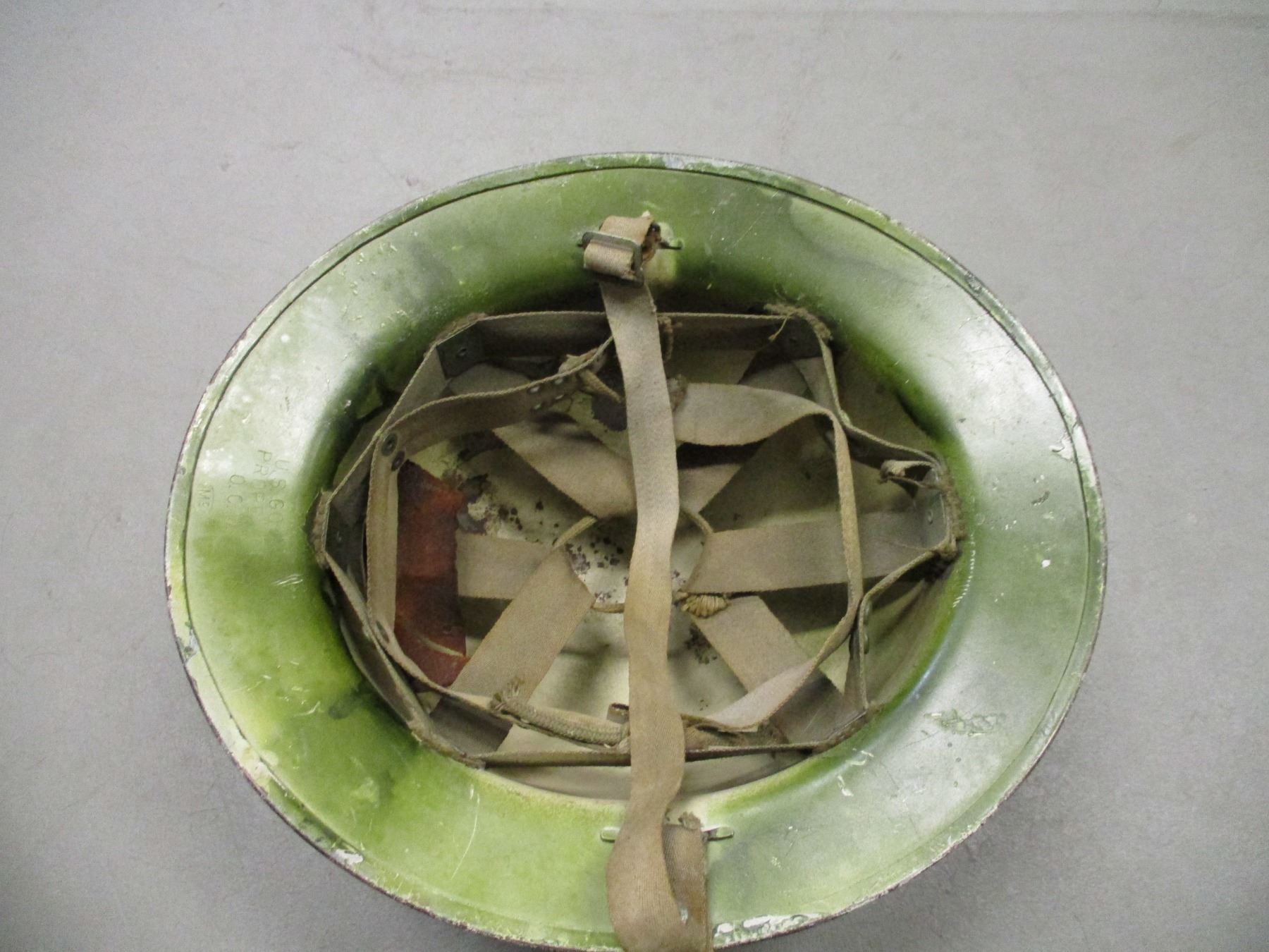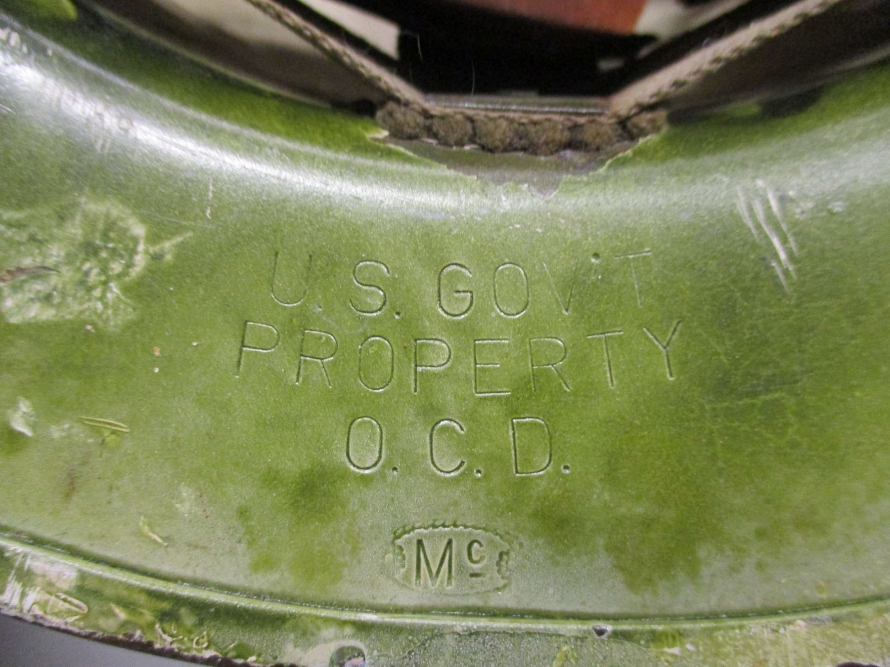 US CIVIL DEFENSE METAL HELMET , MARKED US. GOV'T PROPERTY, O.C.D., MC. PAINTED GREEN.
