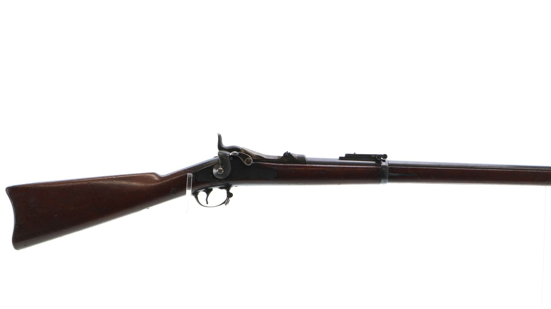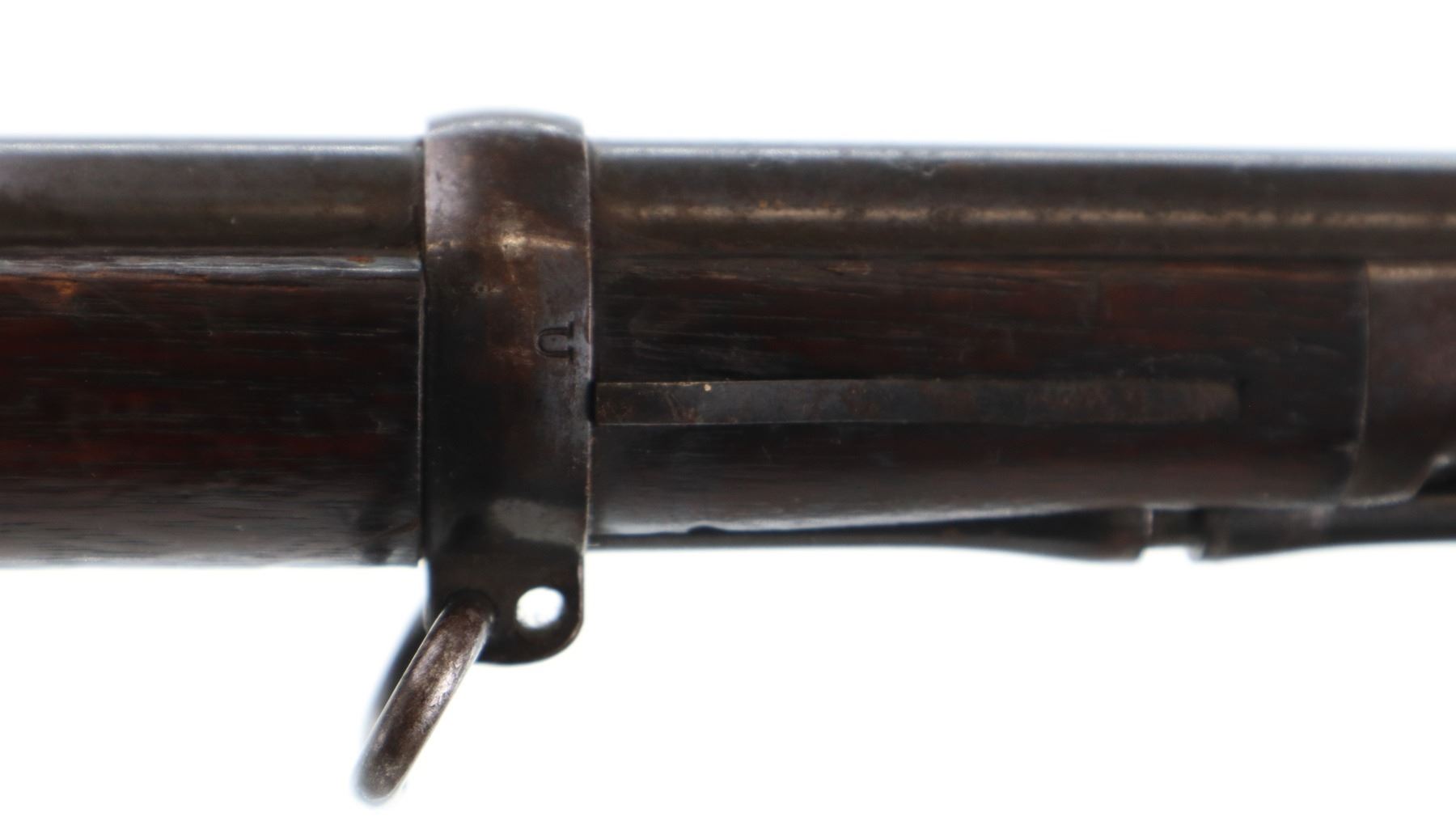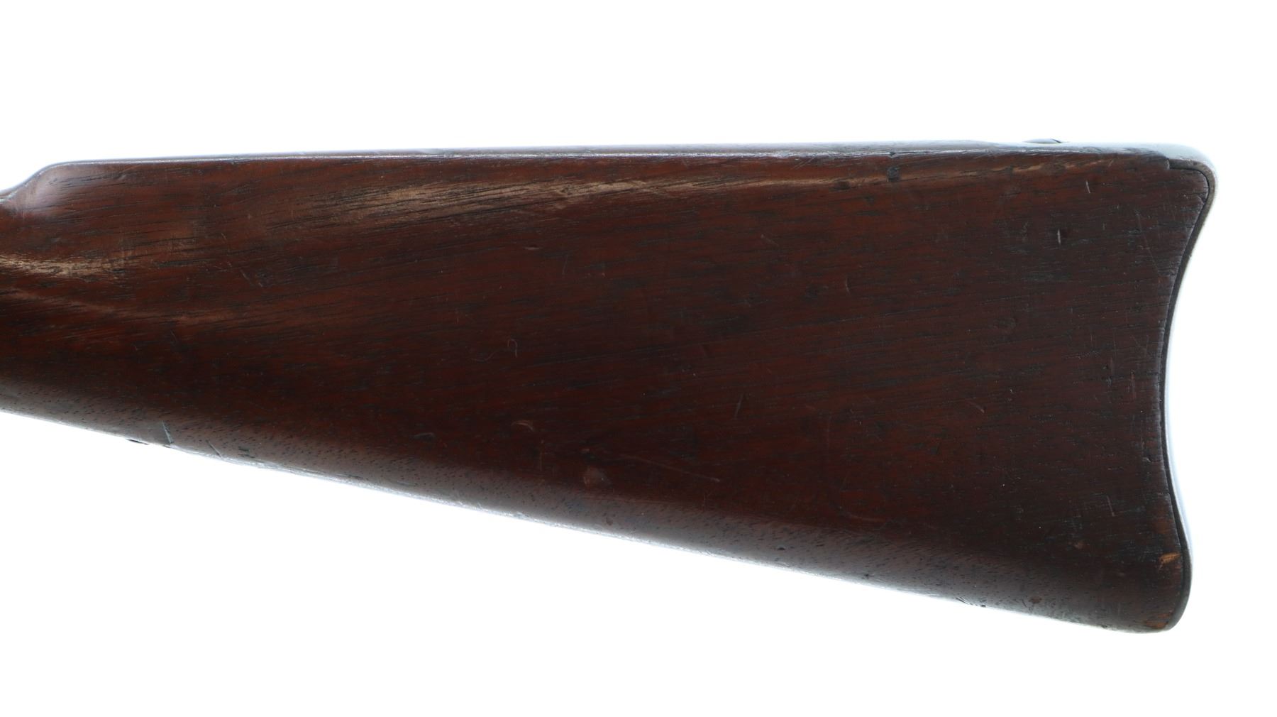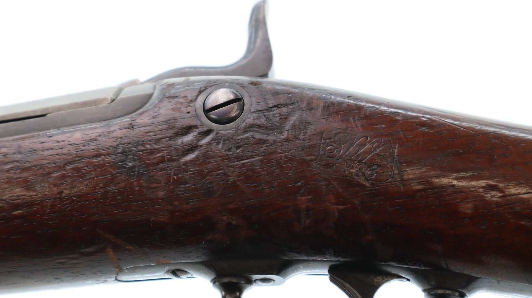 Main Description: Manufactured by Springfield. Blade front sight with ramp, adjustable u notched Buffington rear ladder sight which is bent, blued finish, checkered spur hammer that functions. One piece smooth full military wood stock, forearm tip is cracked, straight grip, smooth steel butt plate, sling swivels, cleaning rod.