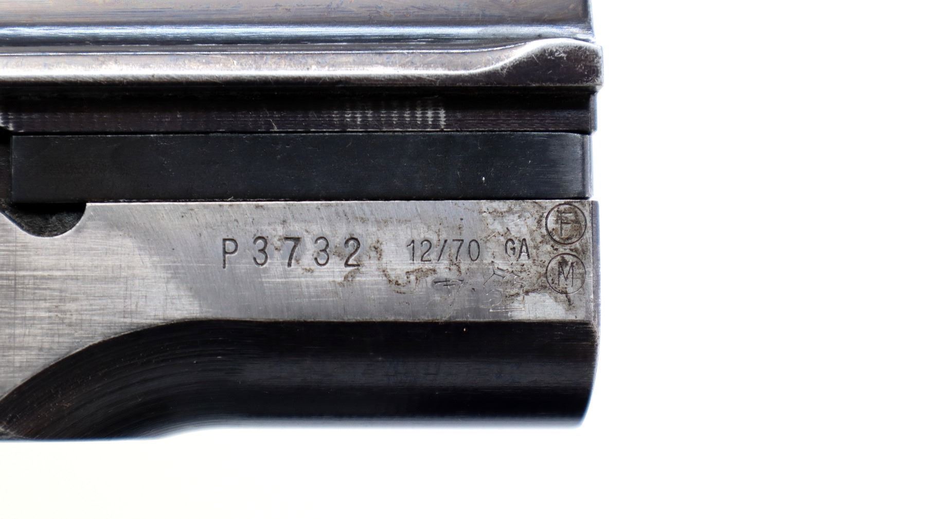 Main Description: Blade front sight, folding u notched rear sight, blued finish, vent rib barrel with integral scope base at rear with two piece scope bases installed, automatic safety, extractor, single selective mechanical trigger. Two piece wood stocks, checkered forearm (also fits on spare barrel) and pistol grip cracked behind upper tang, replaced black foam recoil pad, 12.75" LOP, sling swivels. Spare Barrel Over Under 12 G X 2 3/4", 28", Bore is Very Good, fixed IM Choke, Red fiber optic front bead, missing mid rib bead, blued finish, vent rib, extractors.