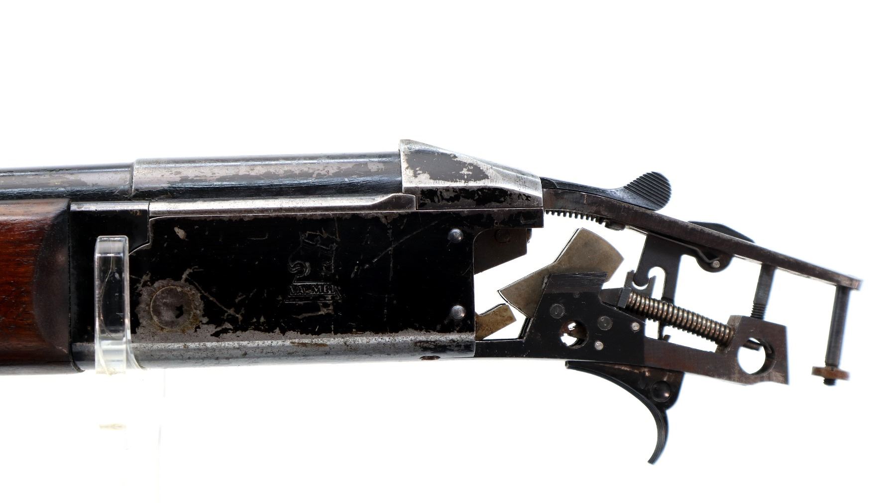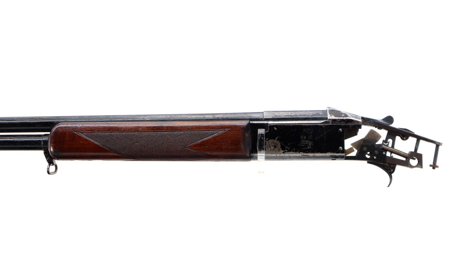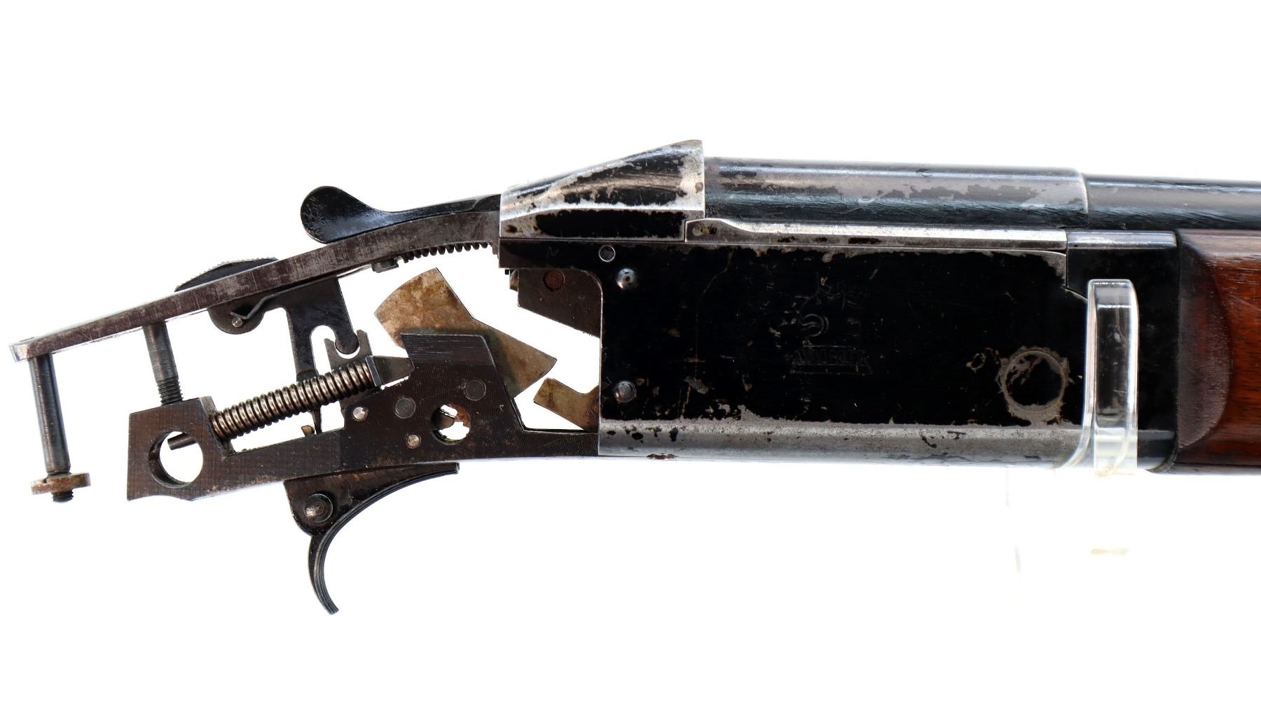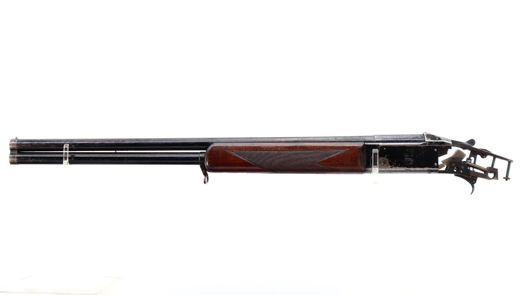Main Description: Silver bead, round barrels, black painted metal finish, automatic safety, extractor, single selective mechanical trigger. One piece checkered wood forearm which is cracked and loose, missing complete butt stock assembly, trigger guard and screws. Has a front sling swivel.