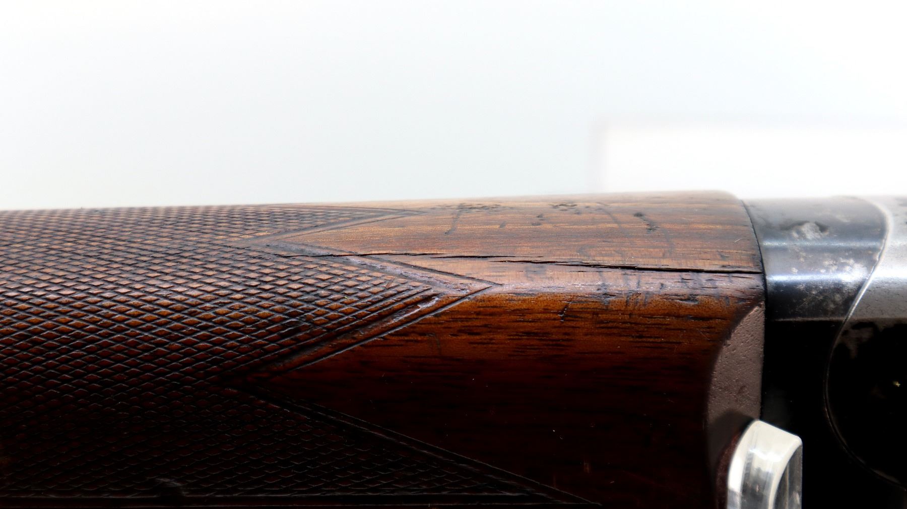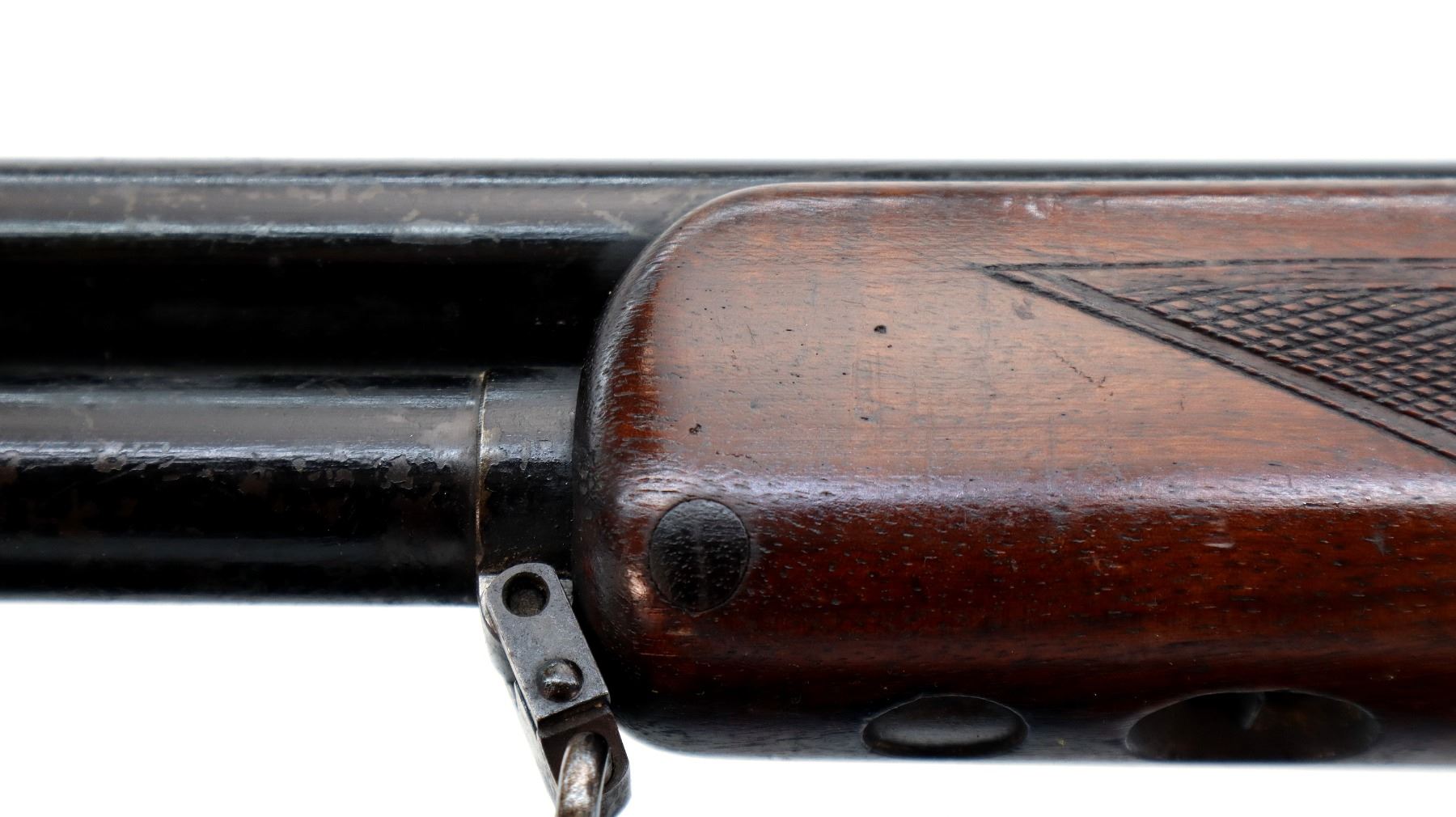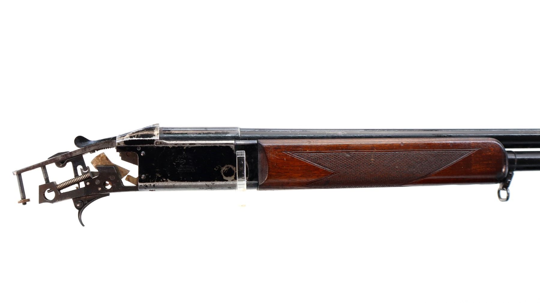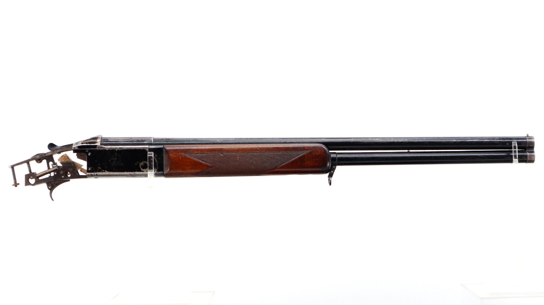 Main Description: Silver bead, round barrels, black painted metal finish, automatic safety, extractor, single selective mechanical trigger. One piece checkered wood forearm which is cracked and loose, missing complete butt stock assembly, trigger guard and screws. Has a front sling swivel.
