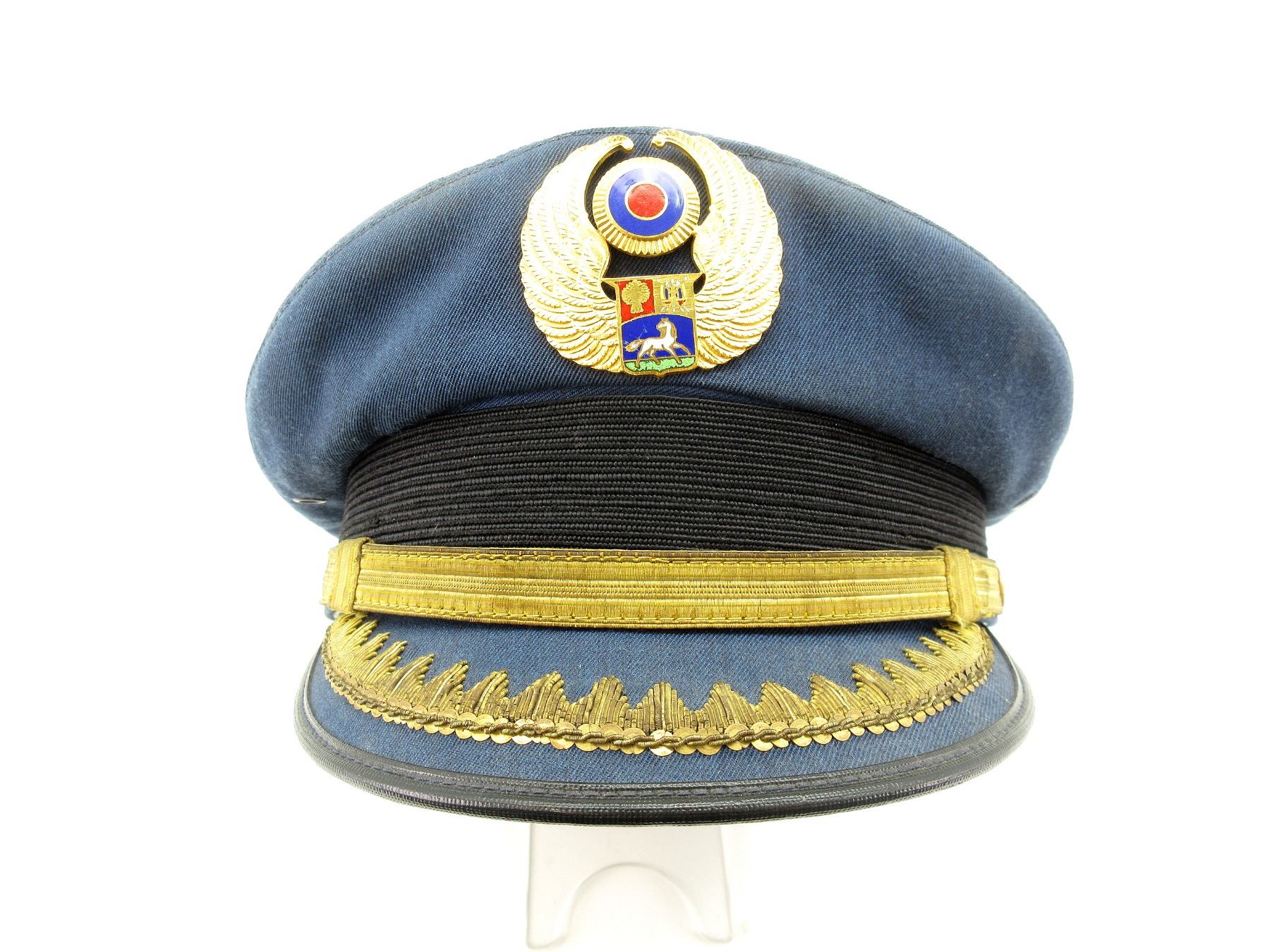 (1) BLUE PEAKED CAP WITH VENEZUELAN COCKADE & WINGS CAP BADGE, GOLD COLOURED CHIN STRAP, INSIDE MARKED: "56", SHOWS SOME WEAR. SEE PHOTOS.