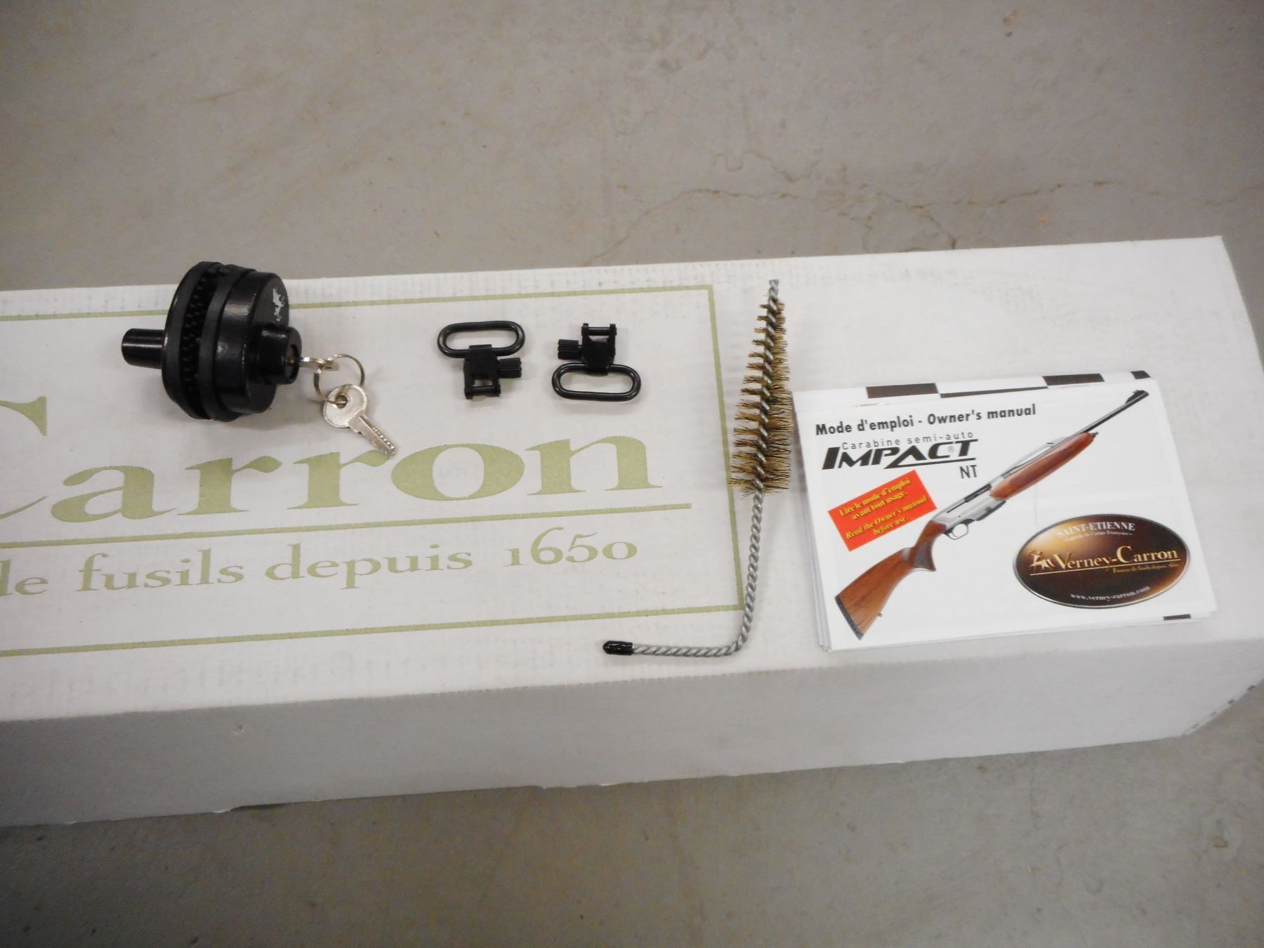 VERNEY-CARRON , MODEL: IMPACT NT , CALIBER: 300 WIN MAG , COMES WITH A BOX, A MAGAZINE AND ACCESSORY, FIBEROPTIC FRONT AND FIBER OPTIC REAR SIGHT, DRILLED AND TAPPED FOR SCOPE MOUNTS, CHECKERED FOREND AND SEMI PISTOL GRIP BUTT STOCK WITH RUBBER RECOIL PAD, SLING SWIVEL LOOPS , ACTION: SEMI AUTOMATIC RIFLE , BARREL LENGTH:22" , CONDITION: NEW IN THE BOX , SERIAL # 2CA25452 , CANADIAN CLASS NON RESTRICTED