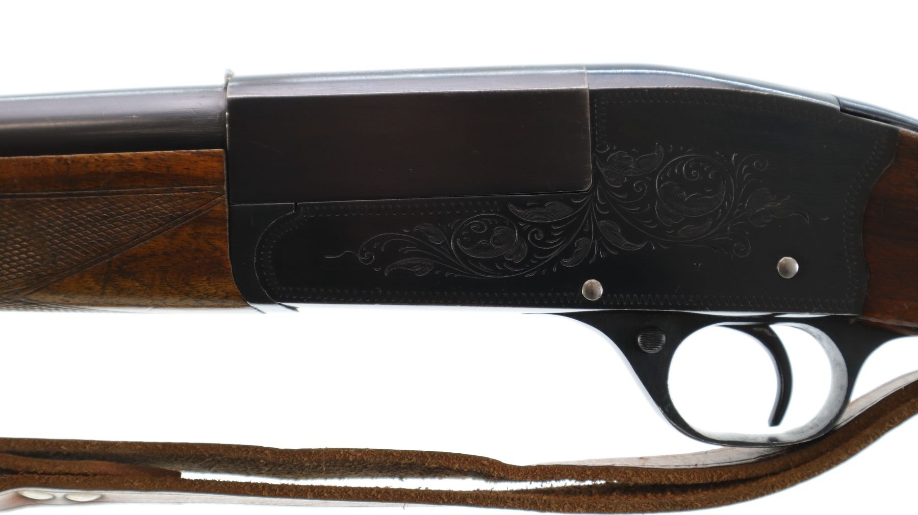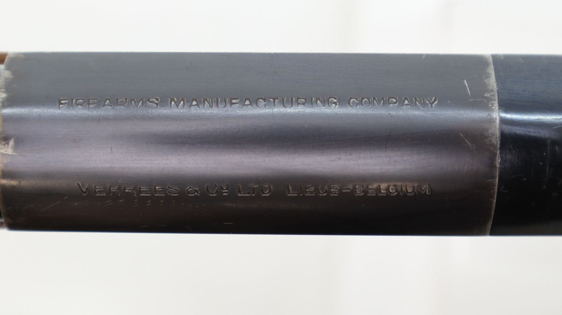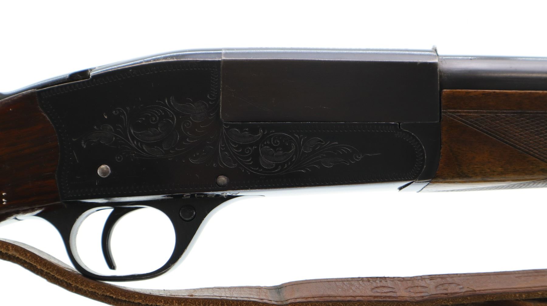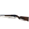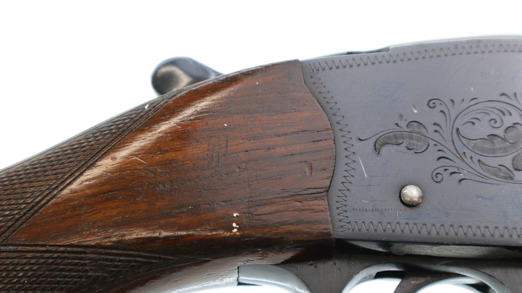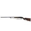 Main Description: Brass bead, fixed u notched rear sight, blued finish, round barrel, engraved receiver, ejector. Two piece wood stocks, checkered forearm and pistol grip cracked behind receiver, grooved black polymer butt plate, sling swivels with brown leather sling.