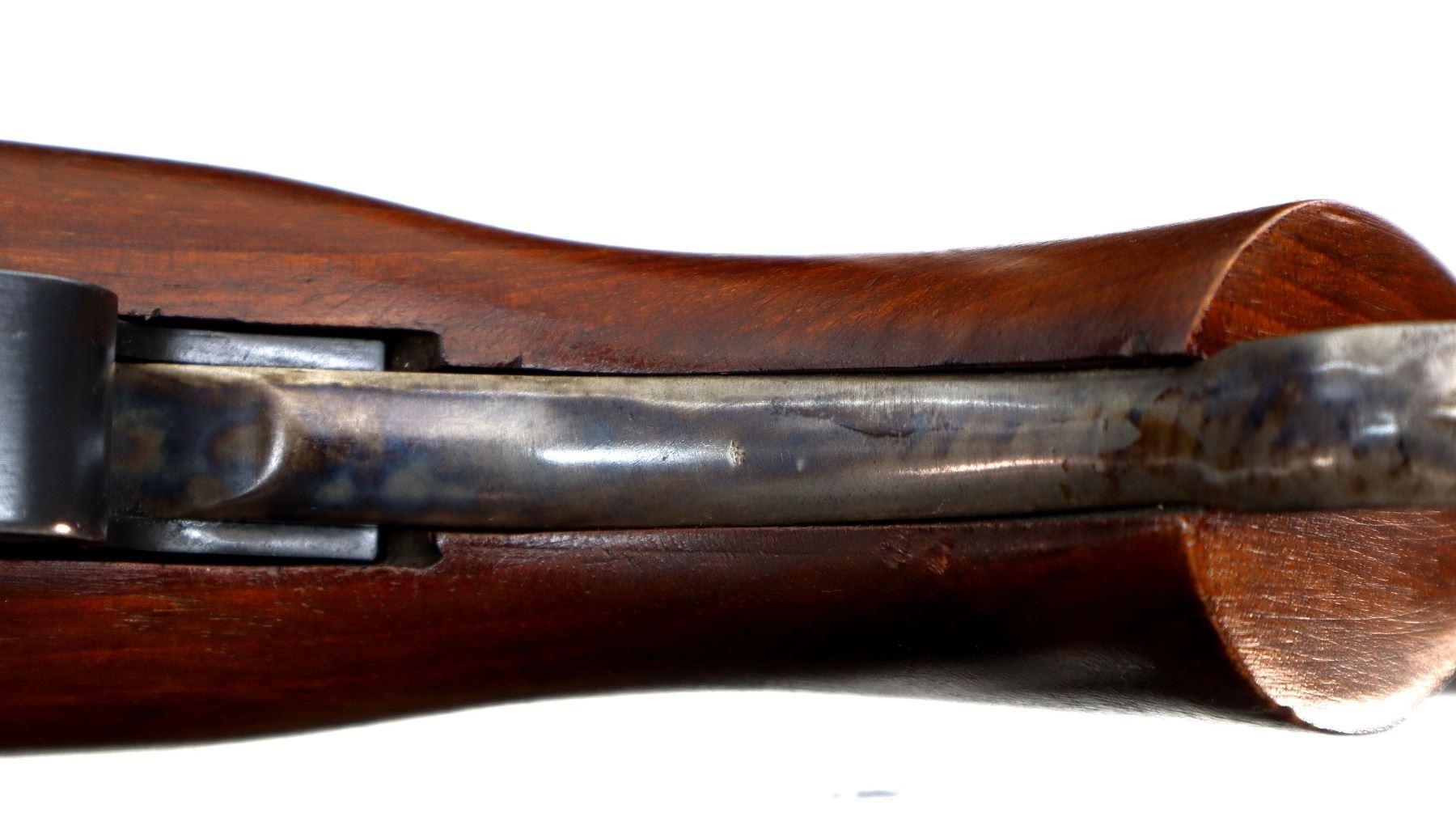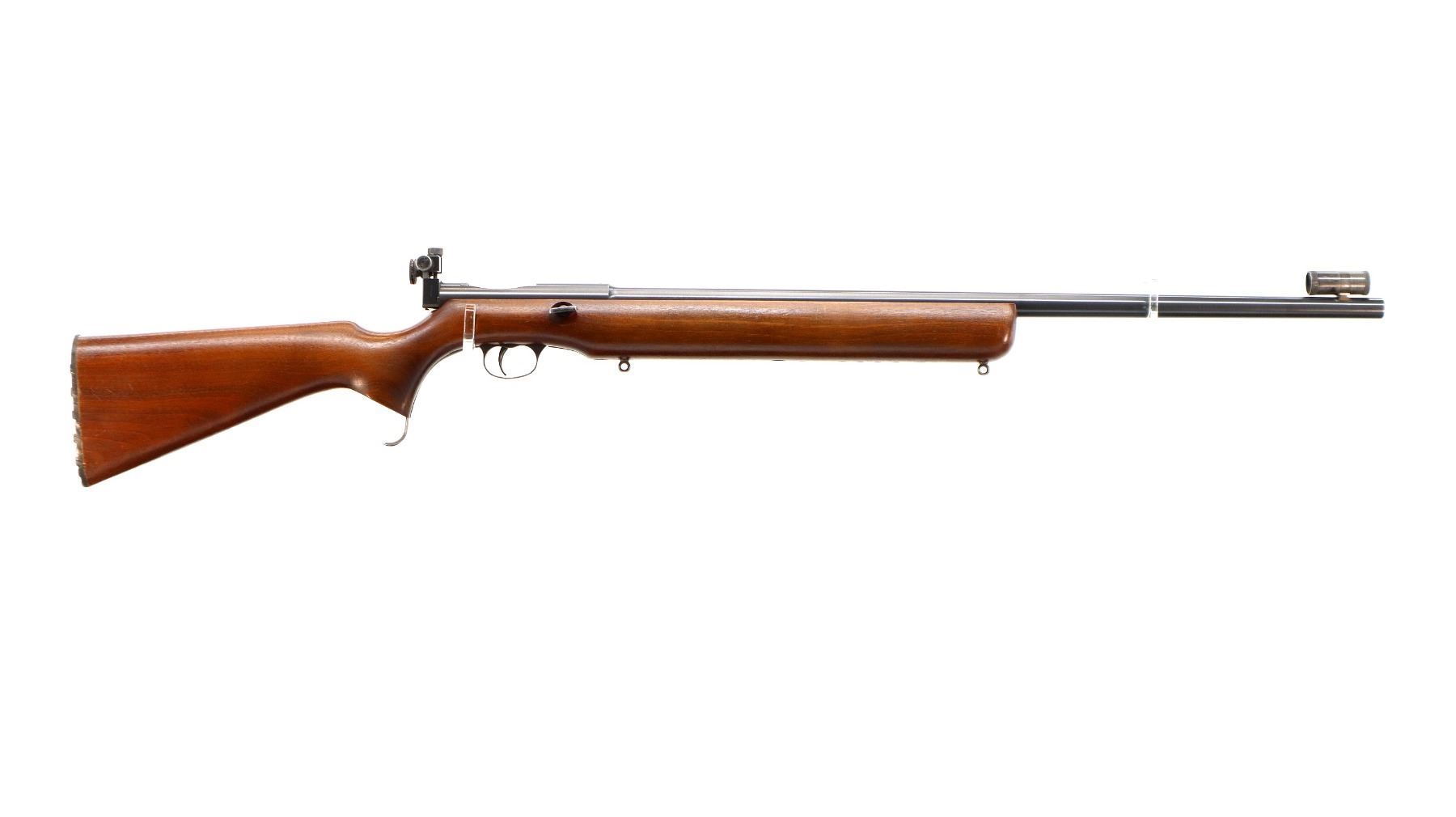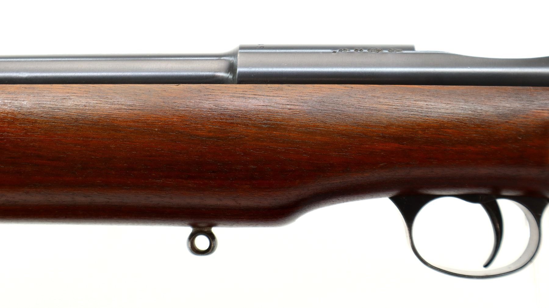 Main Description: Globe front sight with insert, adjustable rear peep sight, blued finish, heavy barrel, colour case hardened breechblock and lever. One piece wood stock, target style forearm with six holes drilled on the bottom which are uneven and one is chipped, pistol grip, replaced textured black polymer butt plate, swivel studs.