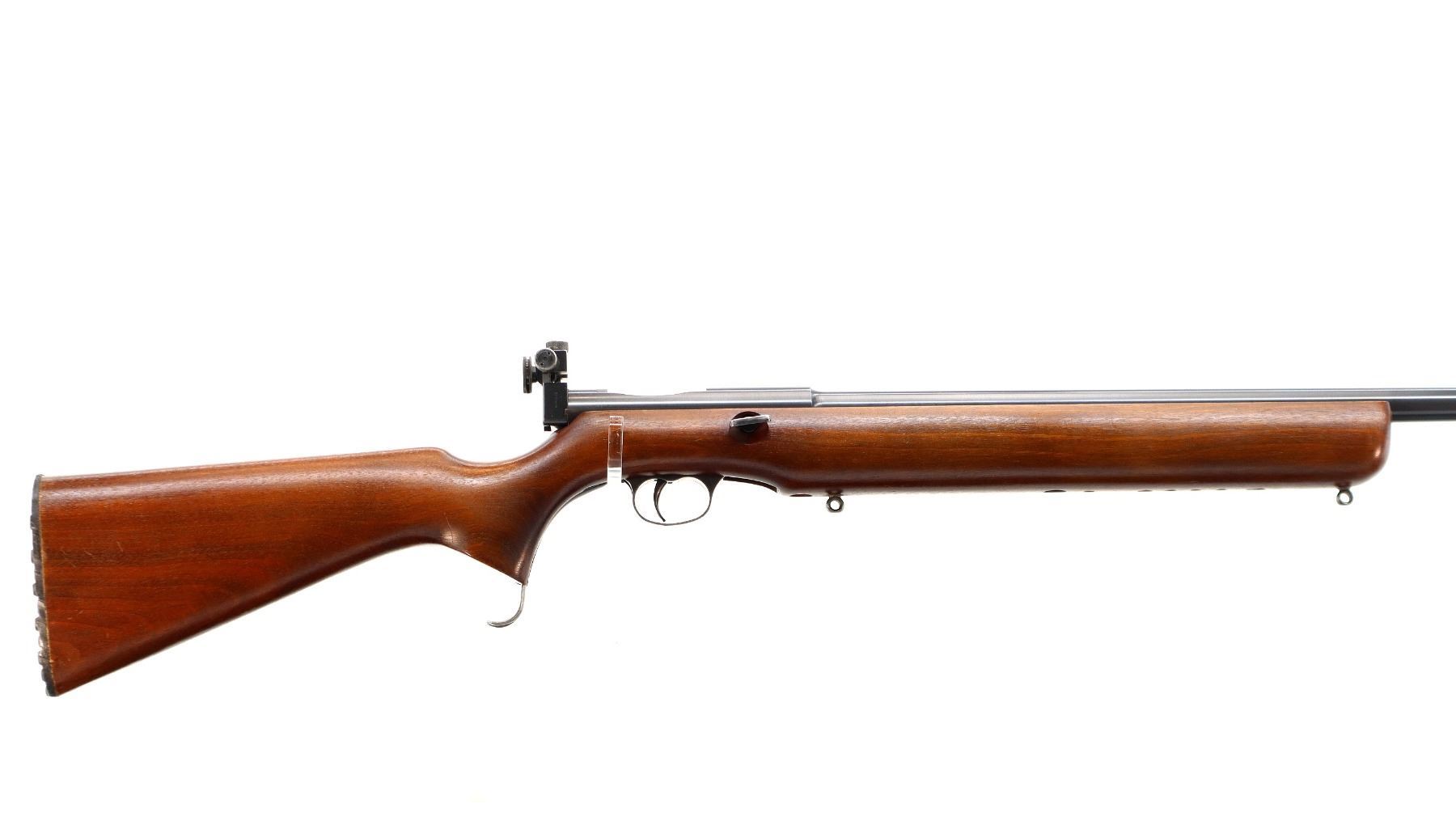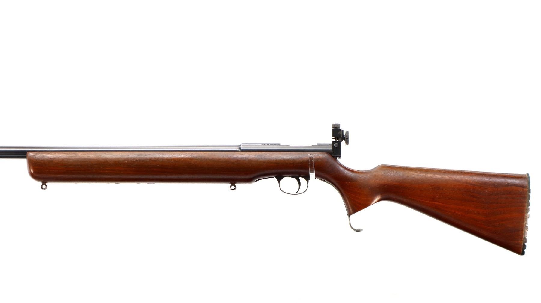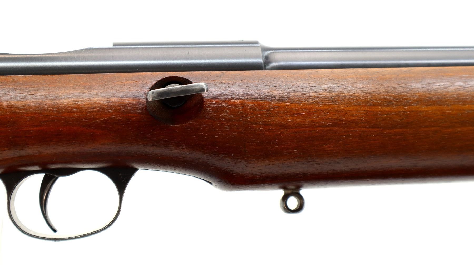 Main Description: Globe front sight with insert, adjustable rear peep sight, blued finish, heavy barrel, colour case hardened breechblock and lever. One piece wood stock, target style forearm with six holes drilled on the bottom which are uneven and one is chipped, pistol grip, replaced textured black polymer butt plate, swivel studs.