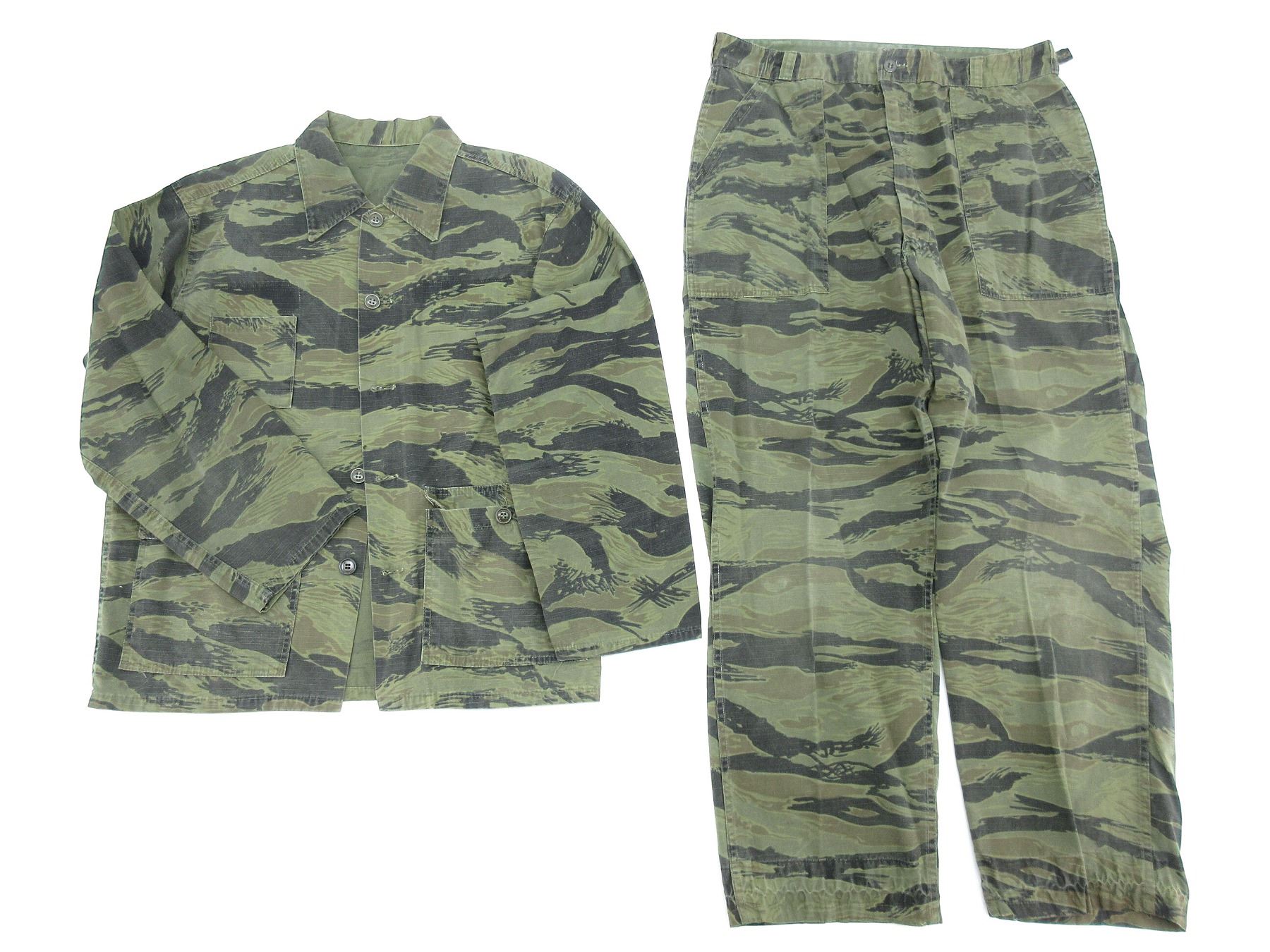LOT INCLUDES; (1) TIGER STRIPE CAMO FIELD JACKET, NO VISIBLE LABEL / MARKINGS, BUTTON FLY-FRONT, SHOULDER WIDTH APPROX. 19.5" & (1) TIGER STRIPE CAMO FIELD PANTS, NO VISIBLE MARKINGS / LABEL, ZIPPERED-FLY (WORKS), WAIST APPROX. 37". SEE PHOTOS.