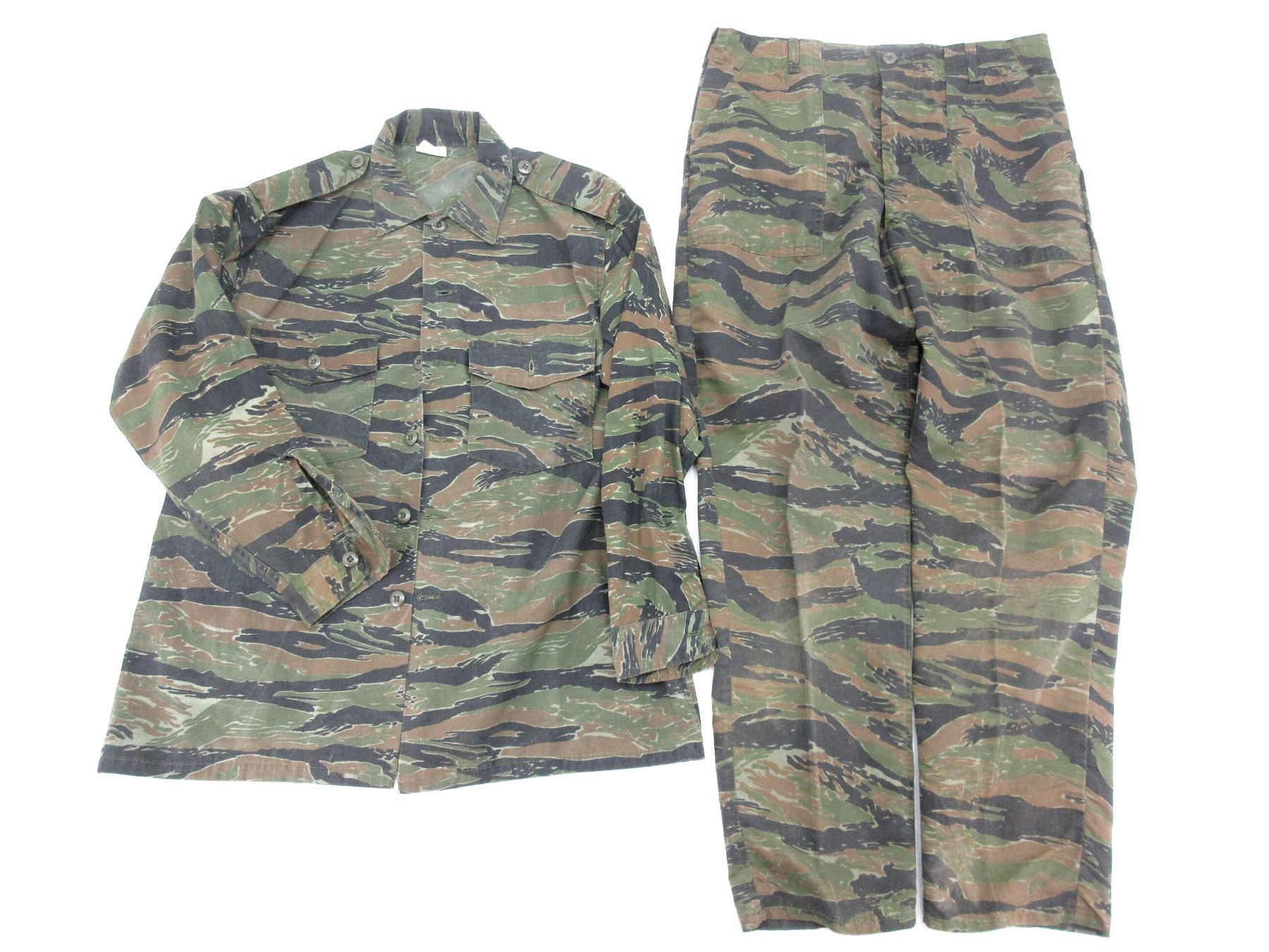 LOT INCLUDES; (1) TIGER STRIPE CAMO FIELD JACKET, LABEL MARKED: "JACKETS-UTILITY, 100% COTTON, SPECIFICATION-ARMY, 834-00-6710, X-LARGE, WYNN DIRECT SALES", BUTTON FLY-FRONT, SHOULDER WIDTH APPROX. 18.5" & (1) TIGER STRIPE CAMO FIELD PANTS, LABEL MARKED: "TROUSERS-UTILITY, 100% COTTON, SPECIFICATION-ARMY, 834-00-6710, 38 X 32, WYNN DIRECT SALES", ZIPPERED-FLY (WORKS), WAIST APPROX. 37". SEE PHOTOS.