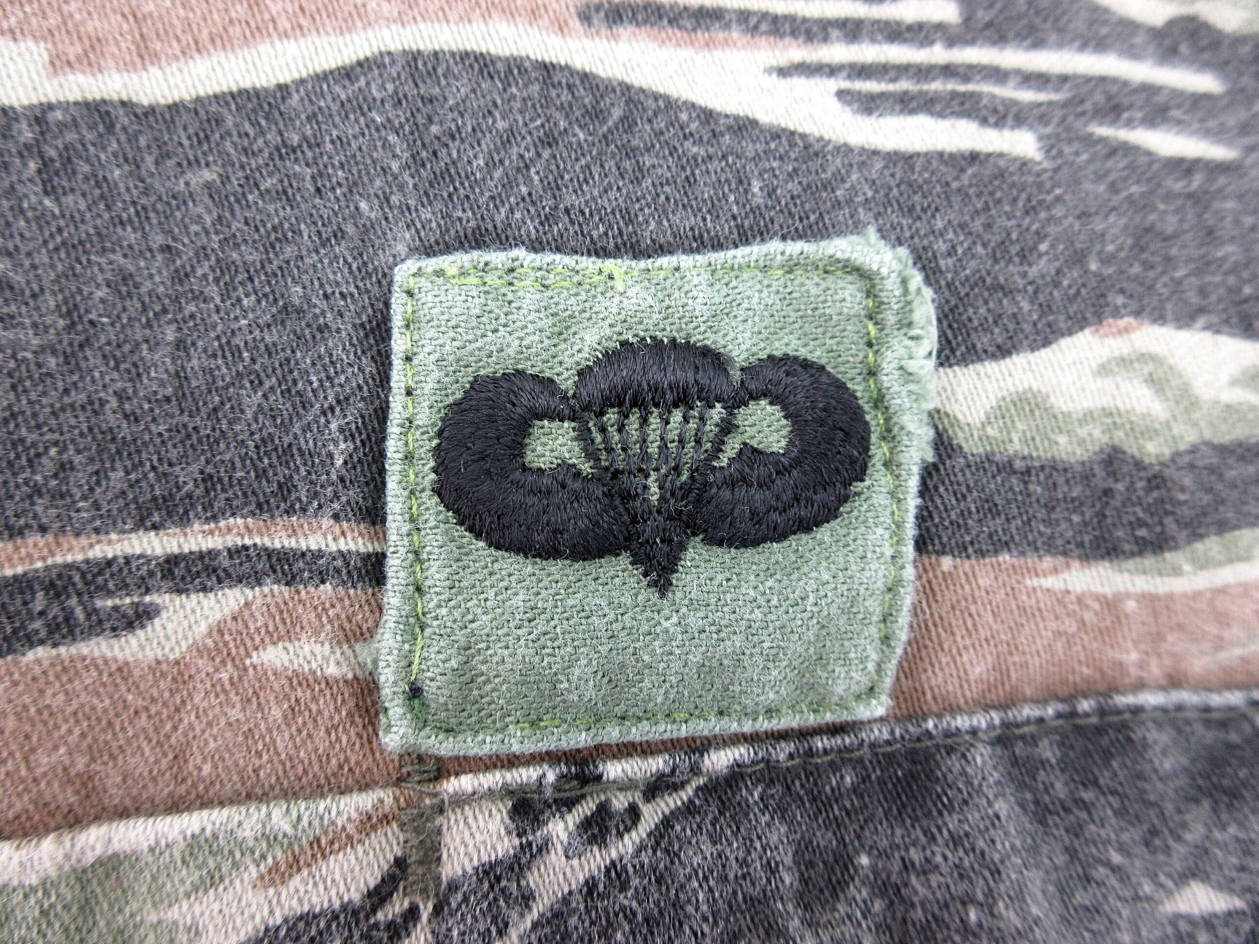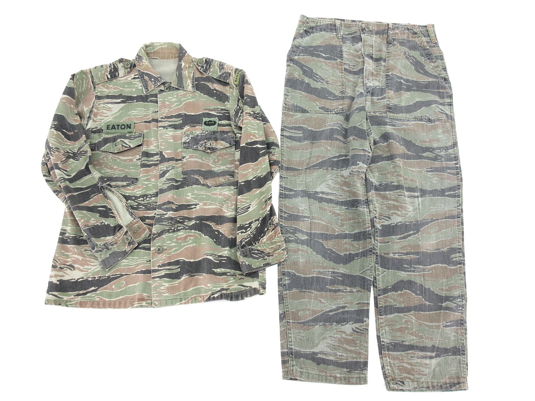 LOT INCLUDES; (1) TIGER STRIPE CAMO FIELD JACKET, NO VISIBLE LABEL / MARKINGS, RANGER SHOULDER BADGE, NAME TAG MARKED: "EATON", PARATROOPER BREAST BADGE, CONSIGNOR STATES: "ORIGINAL, OBTAINED FROM THE VETERAN, CIRCA 1970'S", FLY-FRONT, SHOULDER WIDTH APPROX. 16" & (1) TIGER STRIPE CAMO FIELD PANTS, NO VISIBLE MARKINGS / LABEL REMOVED, ZIPPERED-FLY (WORKS), WAIST APPROX. 34". SEE PHOTOS.