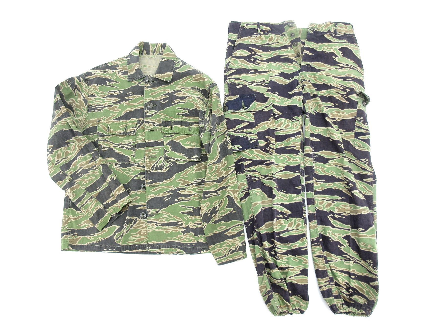 LOT INCLUDES: (1) TIGER STRIPE CAMO FIELD JACKET, NO VISIBLE LABEL / MARKINGS, USED BY U.S. SPECIAL FORCES, BUTTON FLY-FRONT, SLIGHT WEAR, SHOULDER WIDTH APPROX. 17" & (1) TIGER STRIPE CAMO FIELD PANTS, NO VISIBLE LABEL / MARKINGS, BUTTON-FLY, SLIGHT WEAR, WAIST APPROX. 32". SEE PHOTOS.