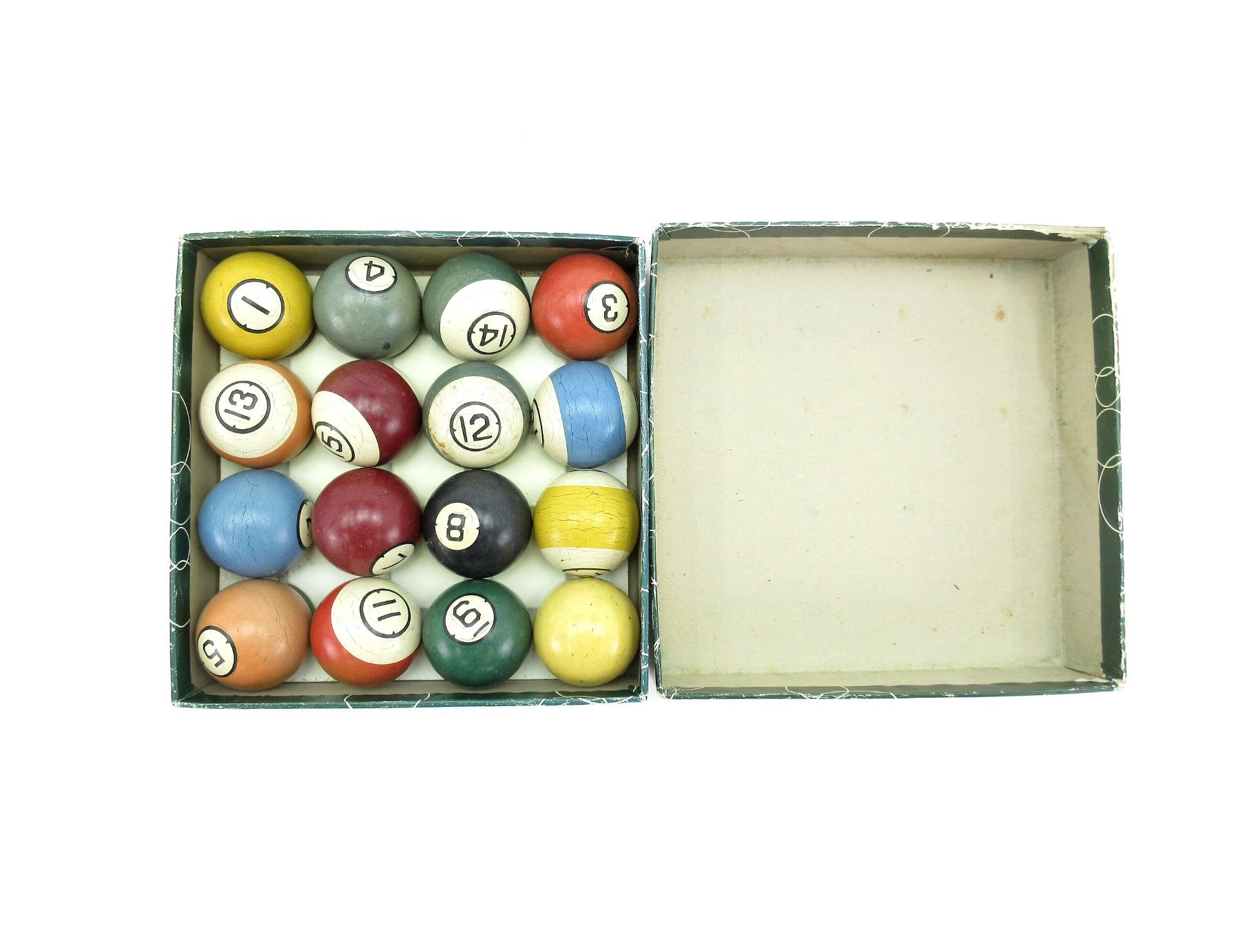 (1) COMPLETE SET OF POOL BALLS, SHOWS WEAR & TEAR / USE MARKS / AGE, IN ORIGINAL BOX, DIAMETER 2 1/16". SEE PHOTOS.