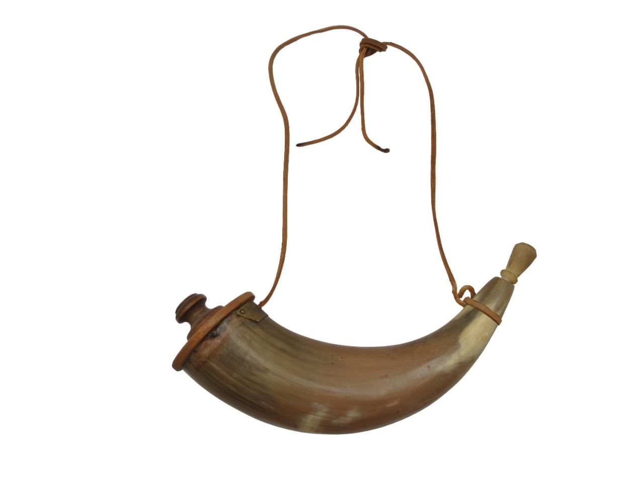 VINTAGE BLACK POWDER HORN. (1) BLACK POWDER HORN WITH CAP & THONG, OAL APPROX. 12.5". SEE PHOTOS.