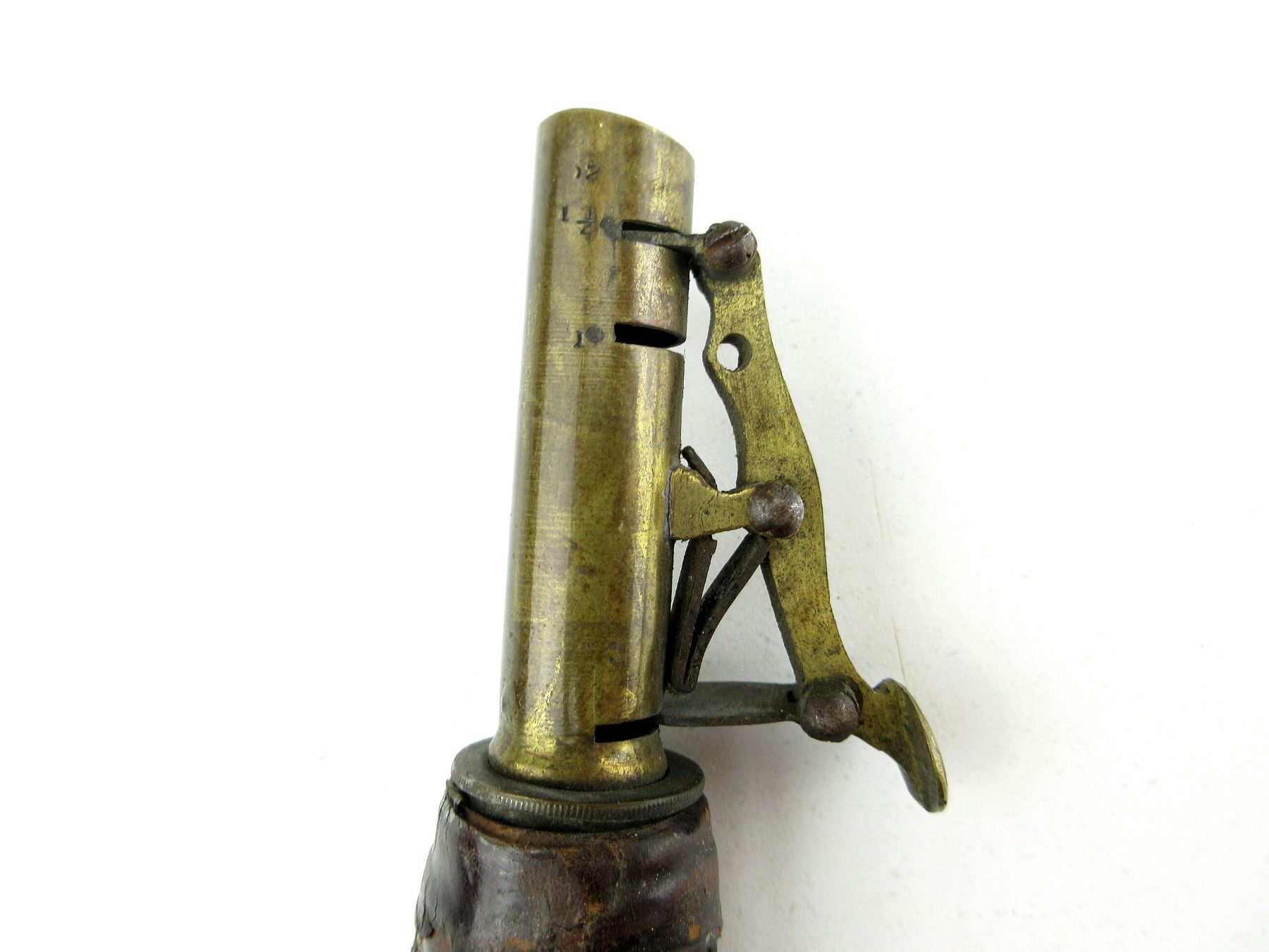 (1) BROWN LEATHER & BRASS POWDER / SHOT FLASK, DRAM MEASUREMENTS ON SPOUT, NO OTHER VISIBLE MARKINGS, SHOWS SOME AGE / WEAR, OAL APPROX. 9 1/8". SEE PHOTOS.