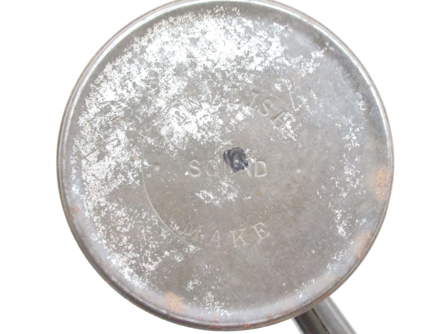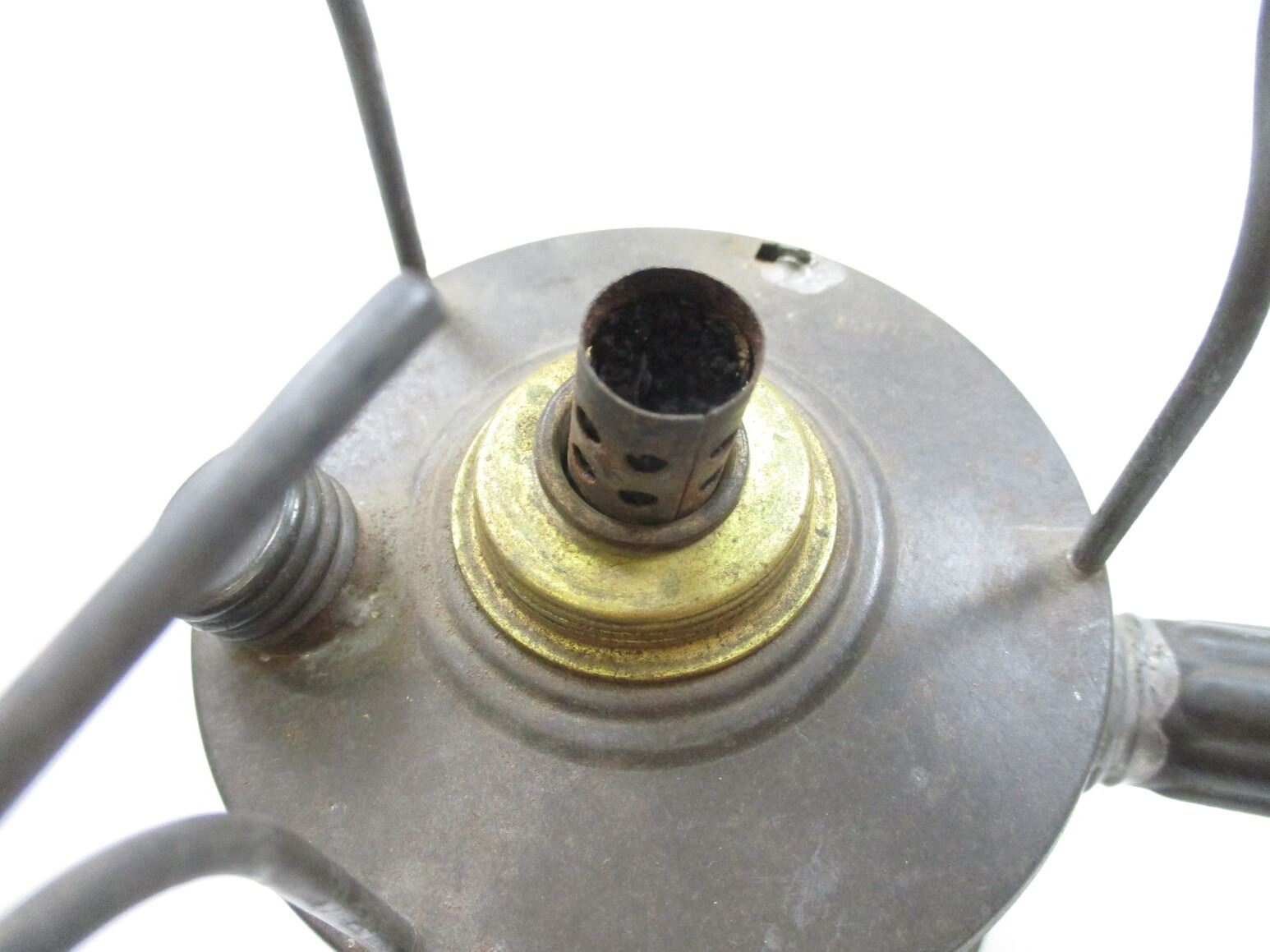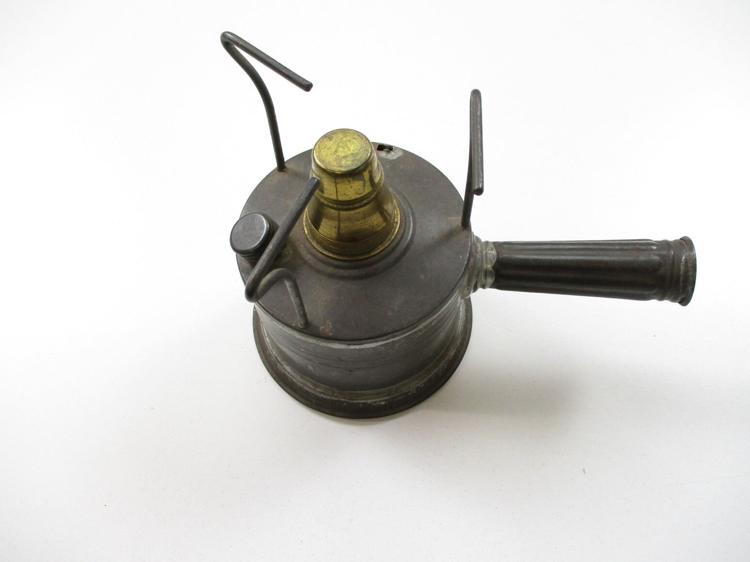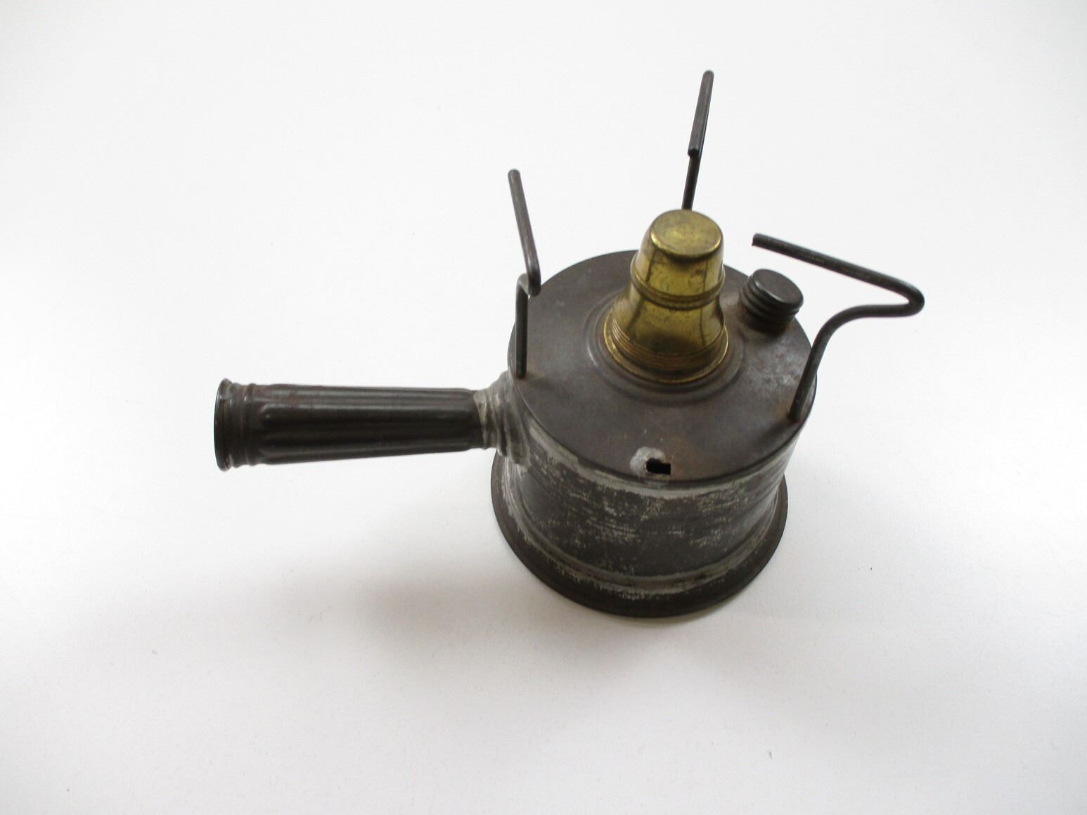 VINTAGE PORTABLE CAMPING STOVE, (1) PORTABLE CAMPING STOVE, BRASS TOP SCREWS OVER WICK ELEMENT, STEEL BASE WITH HANDLE & THREE FIXED RAILS, BASE MARKED: "ENGLISH SOUND MAKE", APPROX. 7.25" L X 3.5" W X 5" H. SEE PHOTOS.