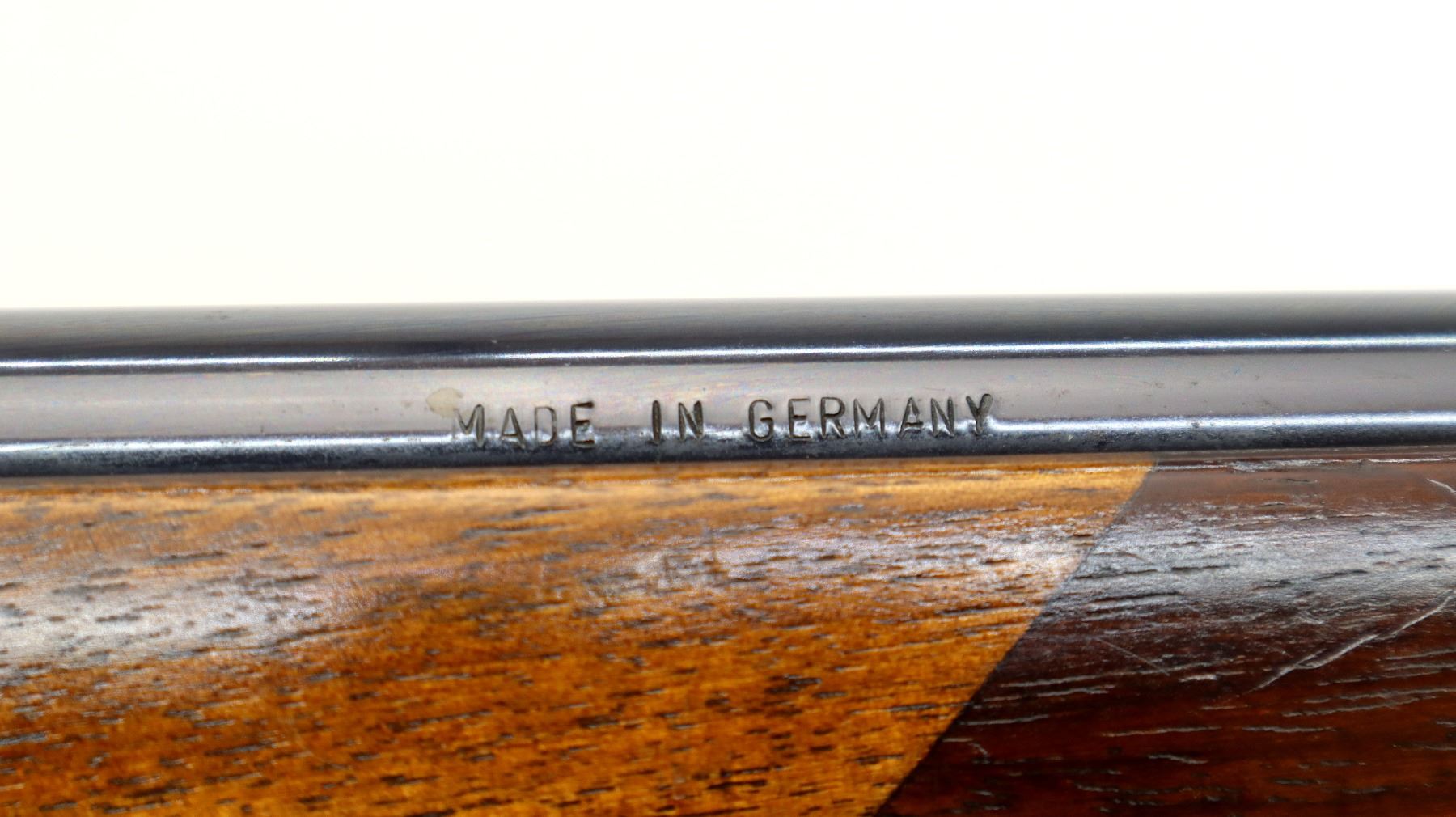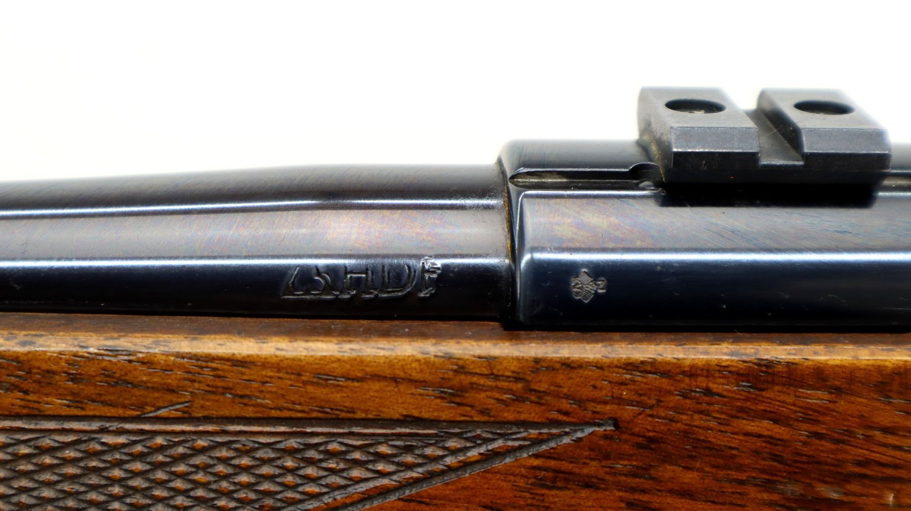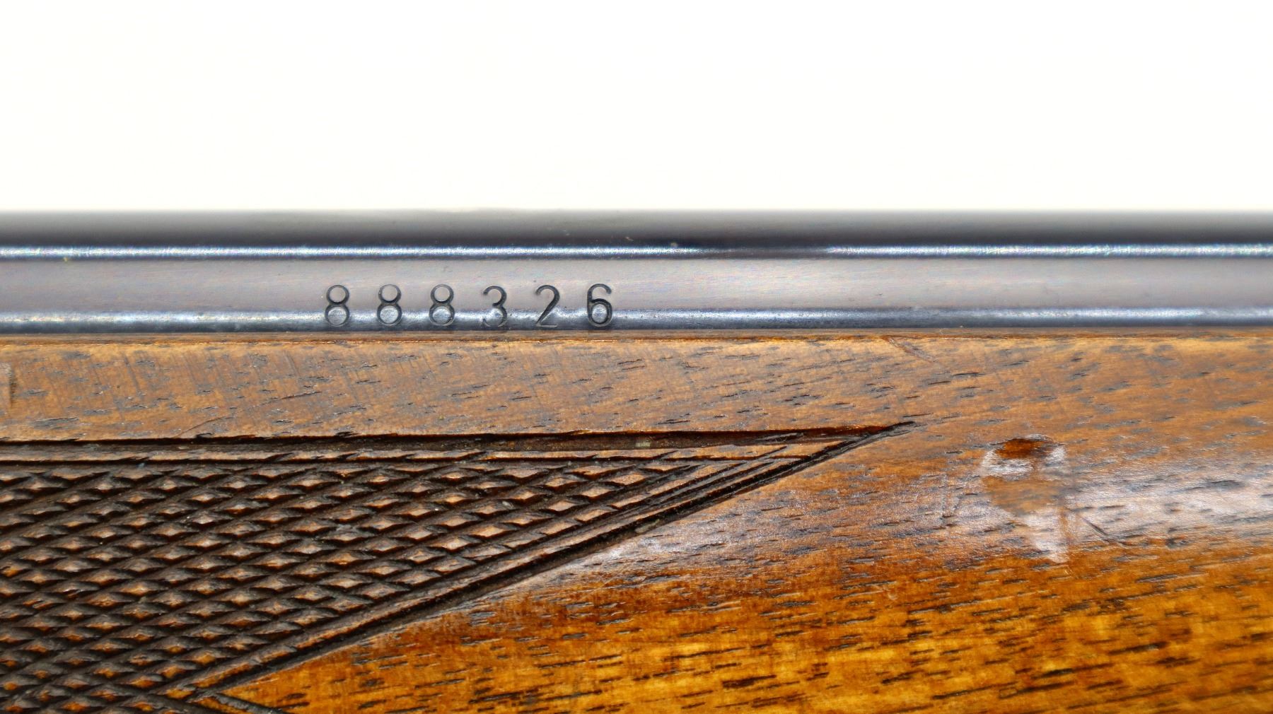 Main Description: Missing front and rear sights, threaded studs have been cut off, blued finish, grooved receiver also drilled and tapped with a single scope base installed. Missing complete bolt assembly. One piece wood stock, Rosewood forend cap, checkered forearm and pistol grip with right hand palm swell, cheek rest, grooved black polymer butt plate, missing sling swivels holes are present.
