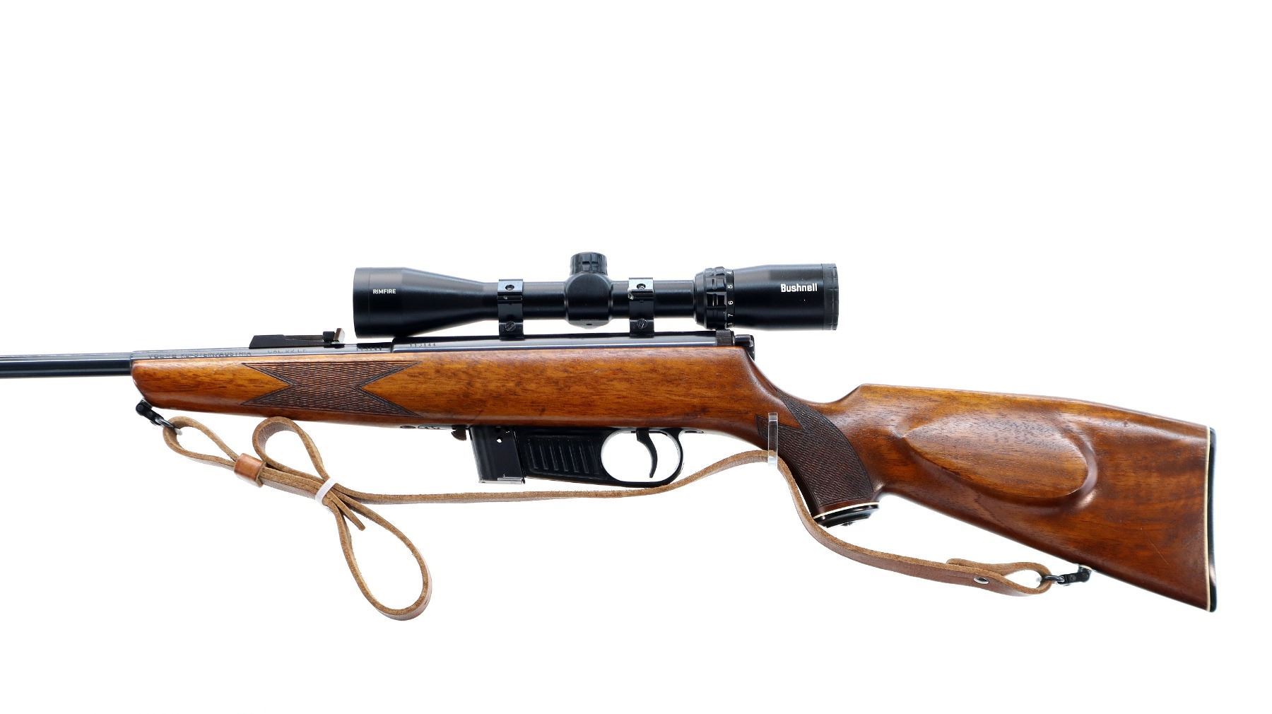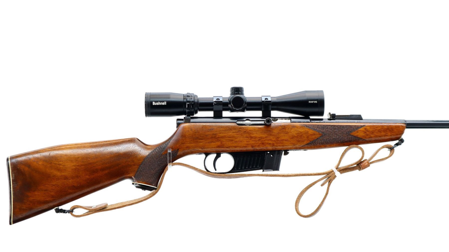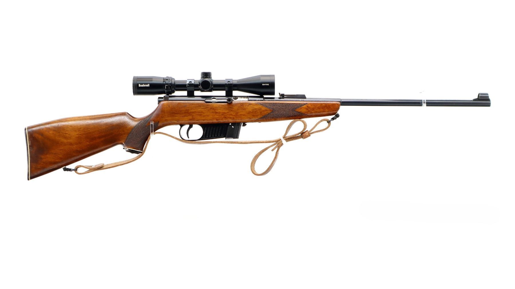 Main Description: Blade front sight with hood and ramp, adjustable u notched rear sight, blued finish, grooved receiver with Bushnell Rimfire 3-9x40 scope installed, clear optics with BDC Reticle. One piece wood stock, checkered forearm and pistol grip, European cheek rest, checkered black polymer butt plate, grip cap, sling swivels with brown leather ling