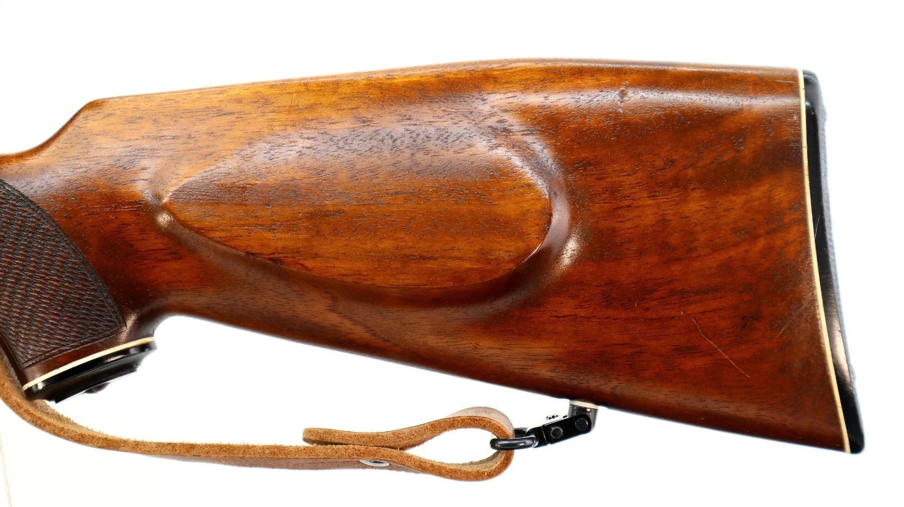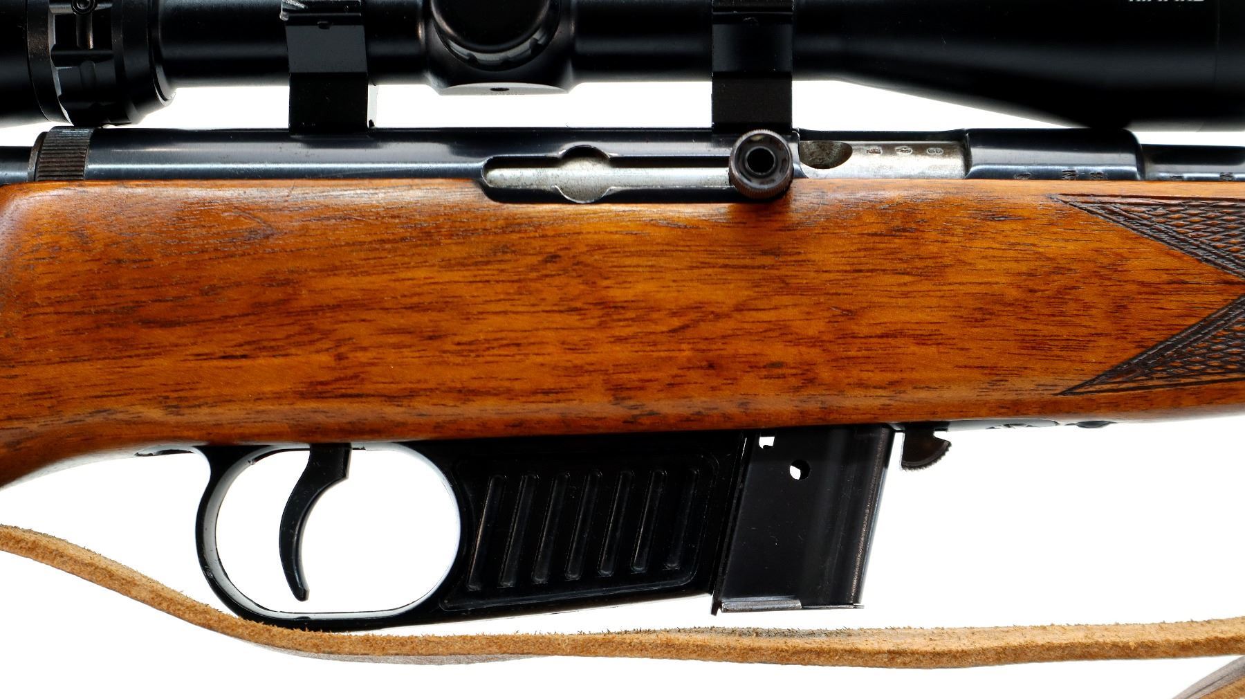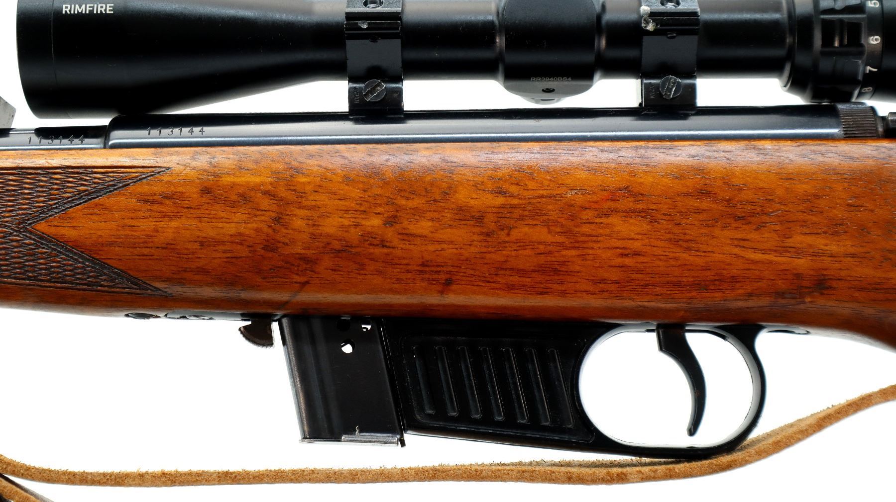 Main Description: Blade front sight with hood and ramp, adjustable u notched rear sight, blued finish, grooved receiver with Bushnell Rimfire 3-9x40 scope installed, clear optics with BDC Reticle. One piece wood stock, checkered forearm and pistol grip, European cheek rest, checkered black polymer butt plate, grip cap, sling swivels with brown leather ling