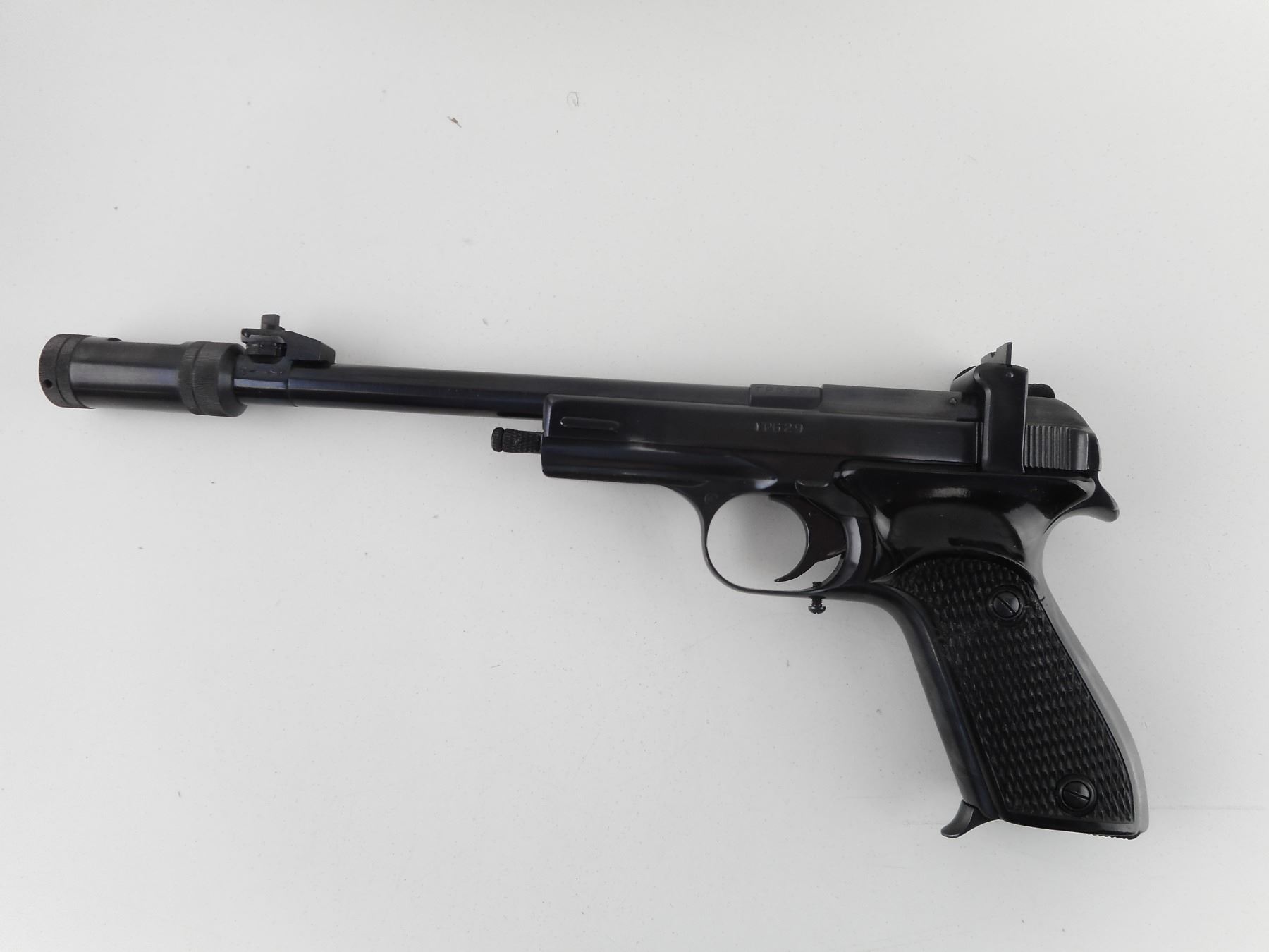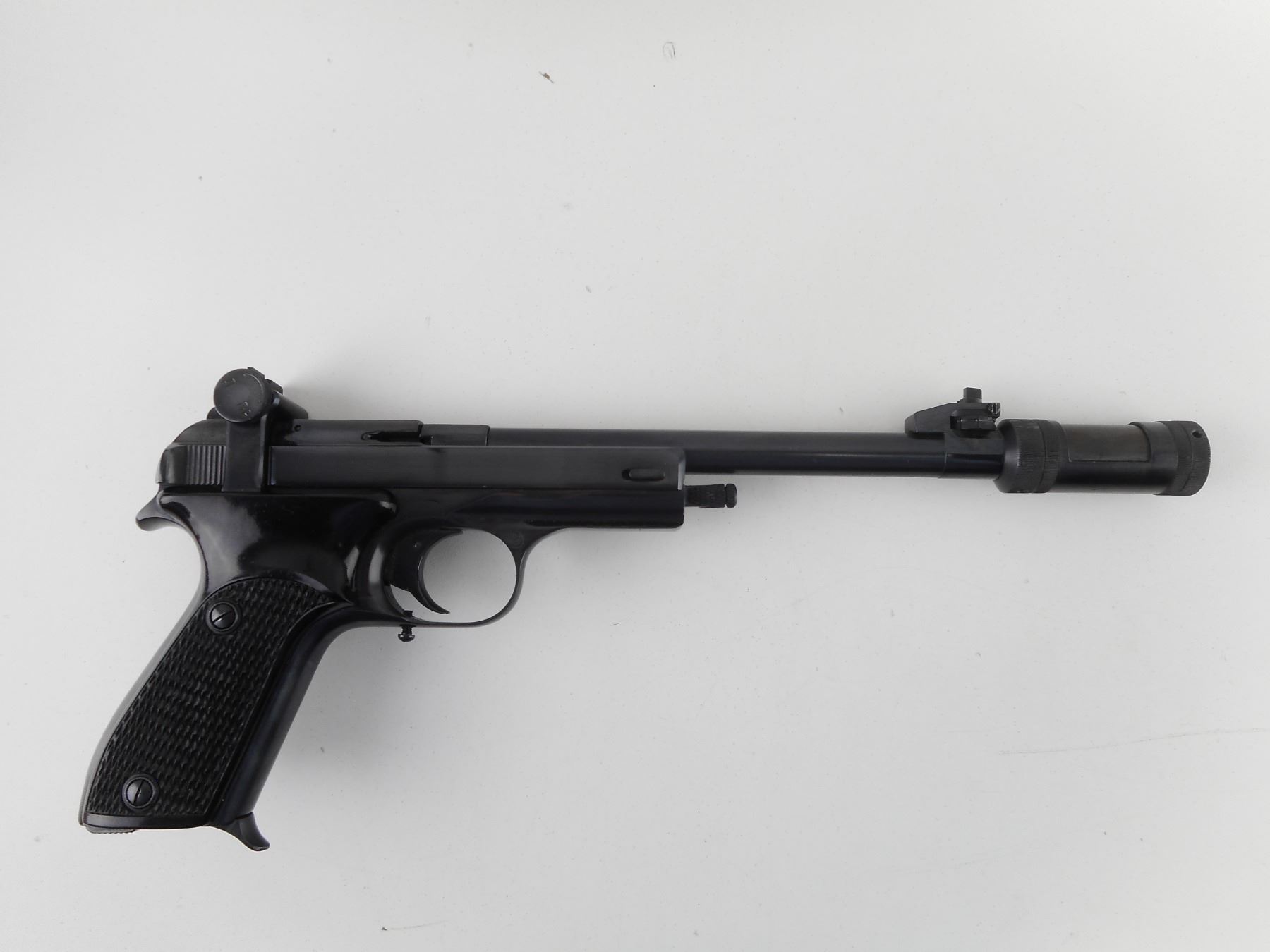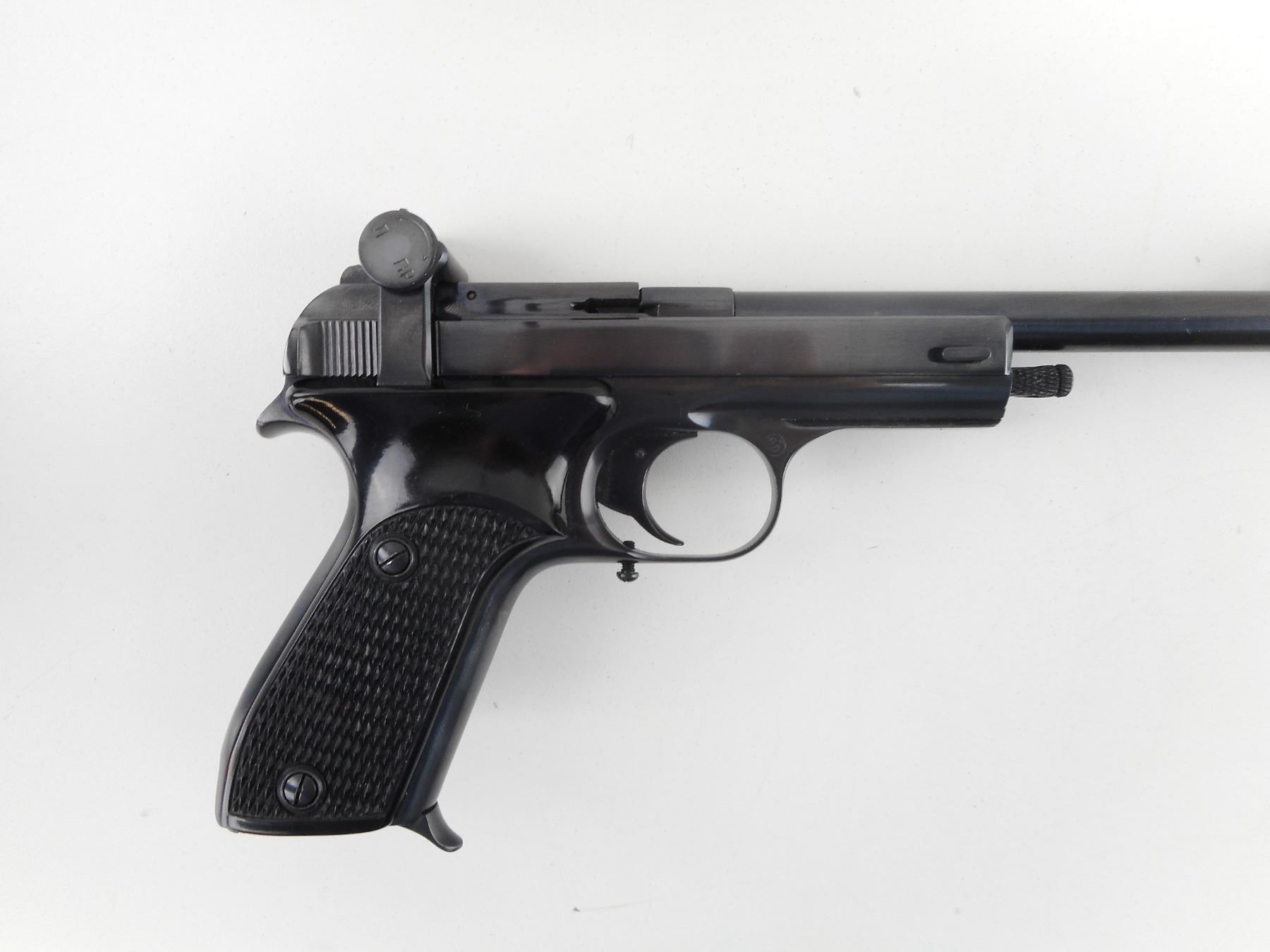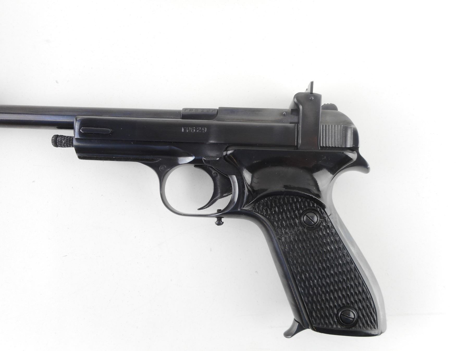 VOSTOK , MODEL: MARGOLAN MCM , CALIBER: 22 LR , COMES WITH WOODEN CASE. EXCELLENT BORE. BLADE FRONT AND ADJUSTABLE REAR SIGHTS. TWO PIECE BLACK PLASTIC GRIPS WITH THUMB REST. MUZZLE BREAK. LEFT GRIP PANEL HAS BEEN REPAIRED. SHOWS SOME HANDLING MARKS. 6 SHOT. ACTION: SEMI-AUTOMATIC HANDGUN , BARREL LENGTH: 191MM, CONDITION: 7/10 , STOCK # R5293, SERIAL # P629, CLASS: CANADIAN CLASS RESTRICTED