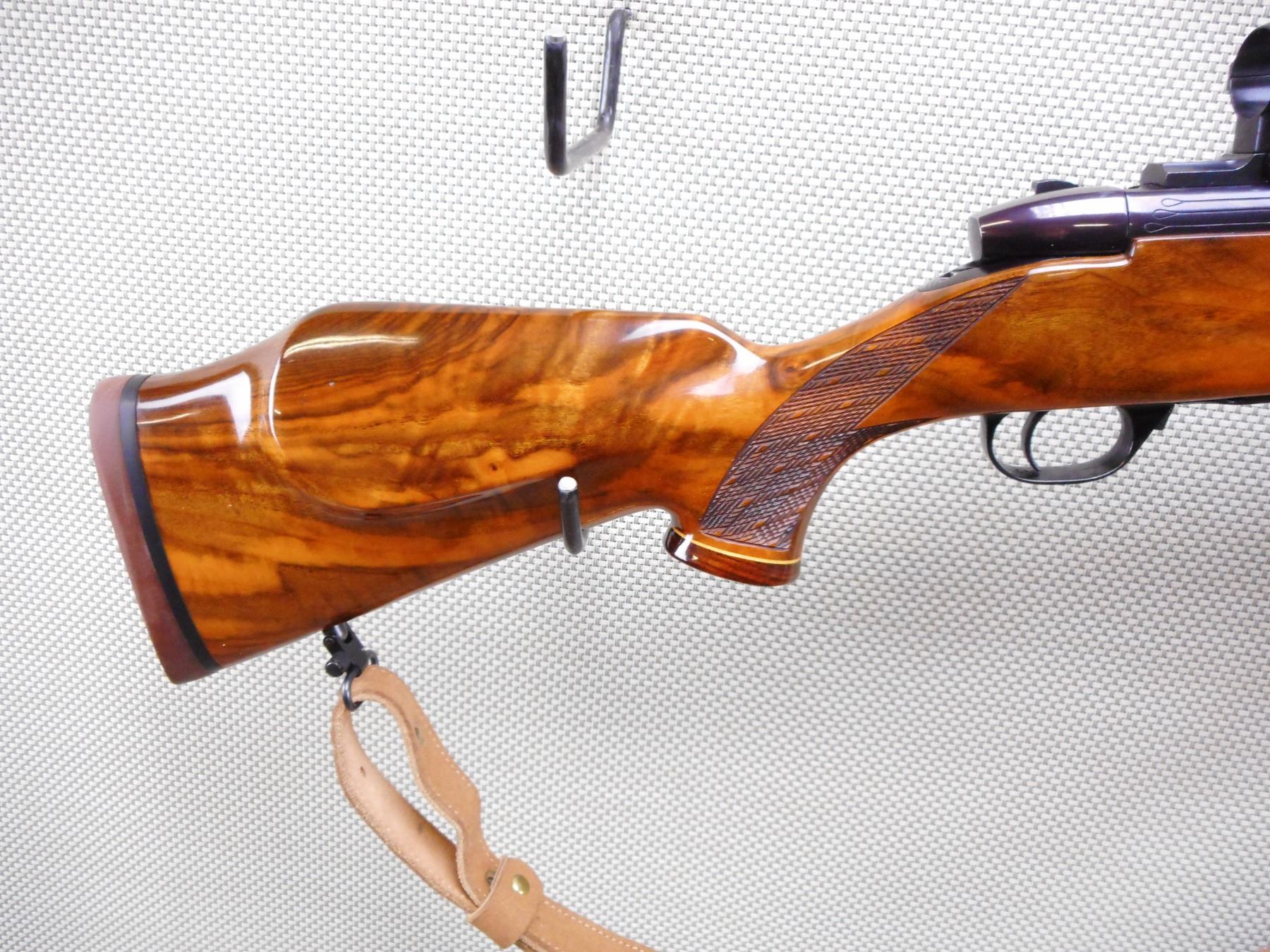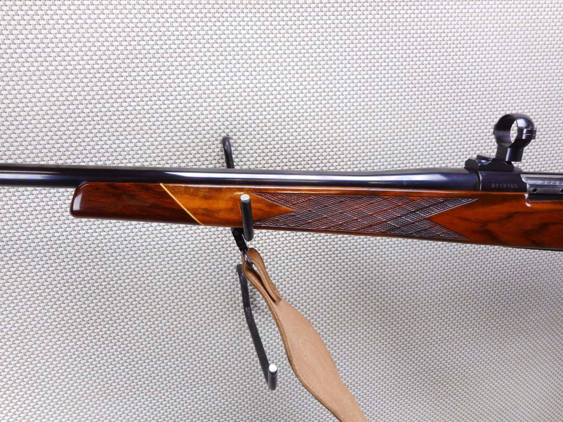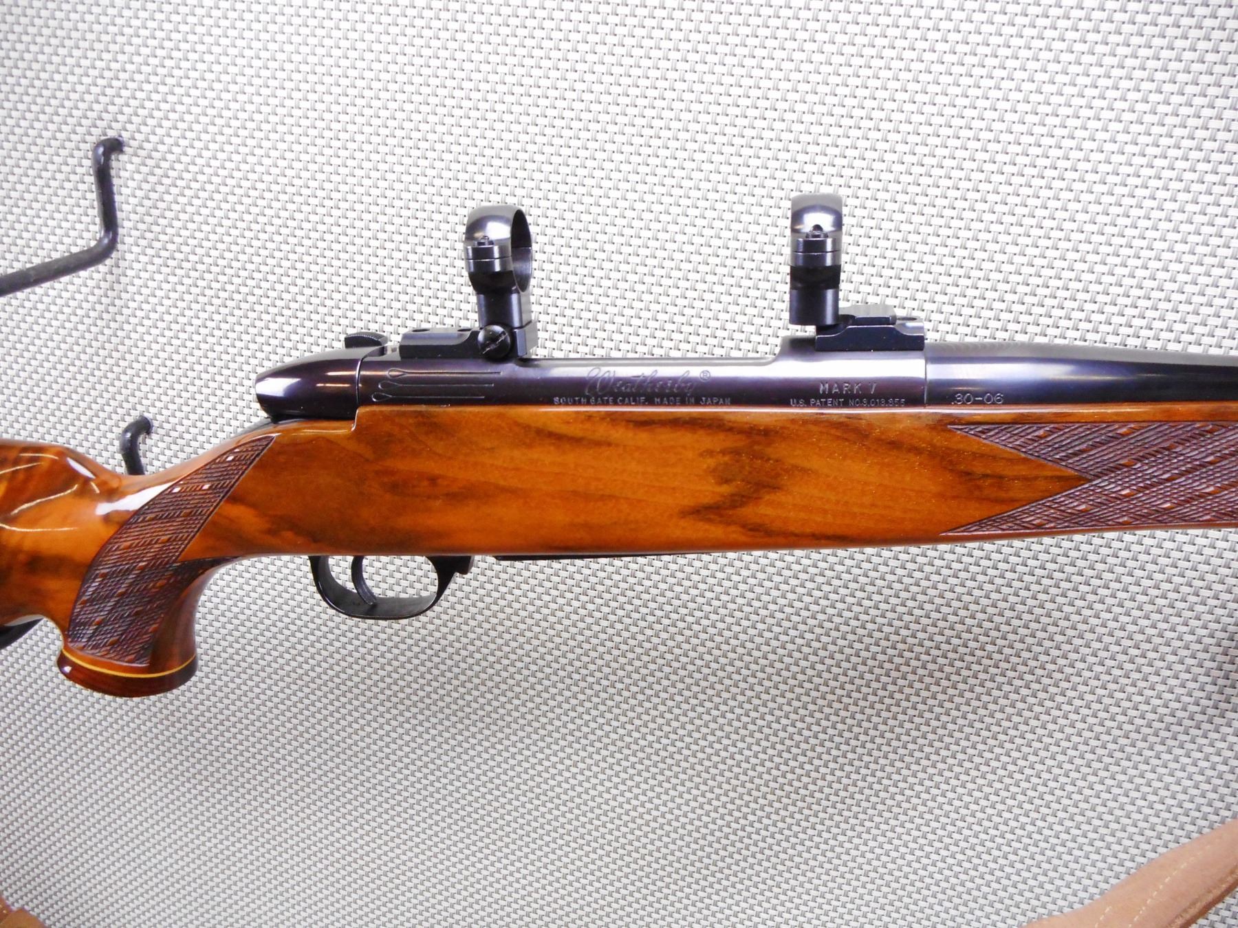 WEATHERBY , MODEL: MK5 LEFT HAND FROM CUSTOM SHOP , CALIBER: 30-06 SPRG , THIS ITEM WAS CUSTOM MADE AT THE WEATHERBY CUSTOM SHOP, HAS AN EXCELLENT BORE, NO SIGHTS HAS ROUND HOLE PORTED MUZZLE BREAK, HIGH POLISH BLUEING, CHECKERED WOOD STOCK WITH BROWN RUBBER RECOIL PAD, STOCK HAS RIGHT SIDE CHEEK REST, ROSE WOOD FOREND CAP, ROSE WOOD PISTOL GRIP CAP, HIGH GLOSS FINISH, HIGHLY FIGURED STOCK, LENGTH OF PULL IS 13", HAS SLING SWIVELS AND BROWN LEATHER SLING, ENGRAVED FLOOR PLATE MARKED WEATHERBY CUSTOM, LEUOPOLD TURN IN 1" RINGS AND BASES, SHOWS MINOR HANDLING MARKS AND WEAR, TYPE: BOLT ACTION RIFLE , BARREL LENGTH: 24", STOCK# 10340, SERIAL # H112766, CONDITION: 9/10, CLASS: CANADIAN NON RESTRICTED CLASS