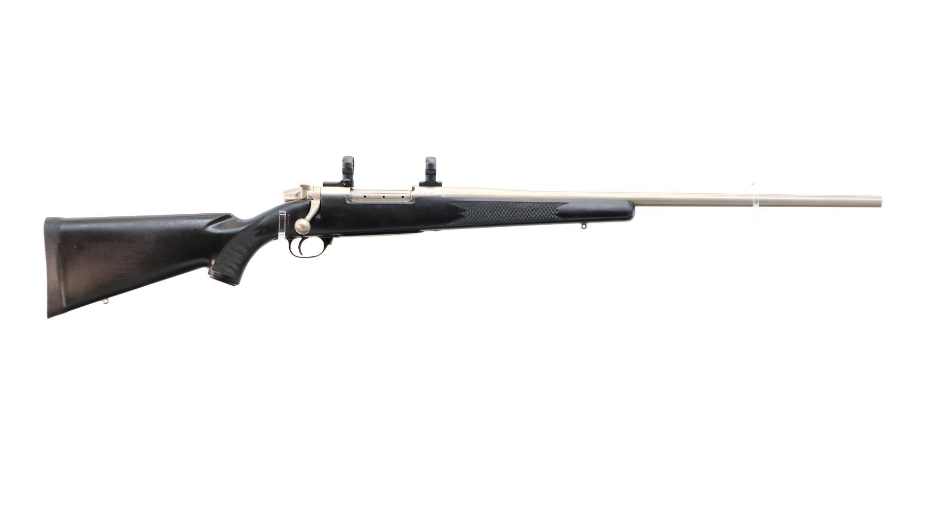 Main Description: No sights, stainless finish, receiver drilled and tapped with two piece 1" turn in rings and bases installed, fluted bolt with smooth knob. One piece black synthetic stock, checkered forearm and pistol grip, cheek rest, black rubber recoil pad, grip cap, hinged floor plate, swivel studs.