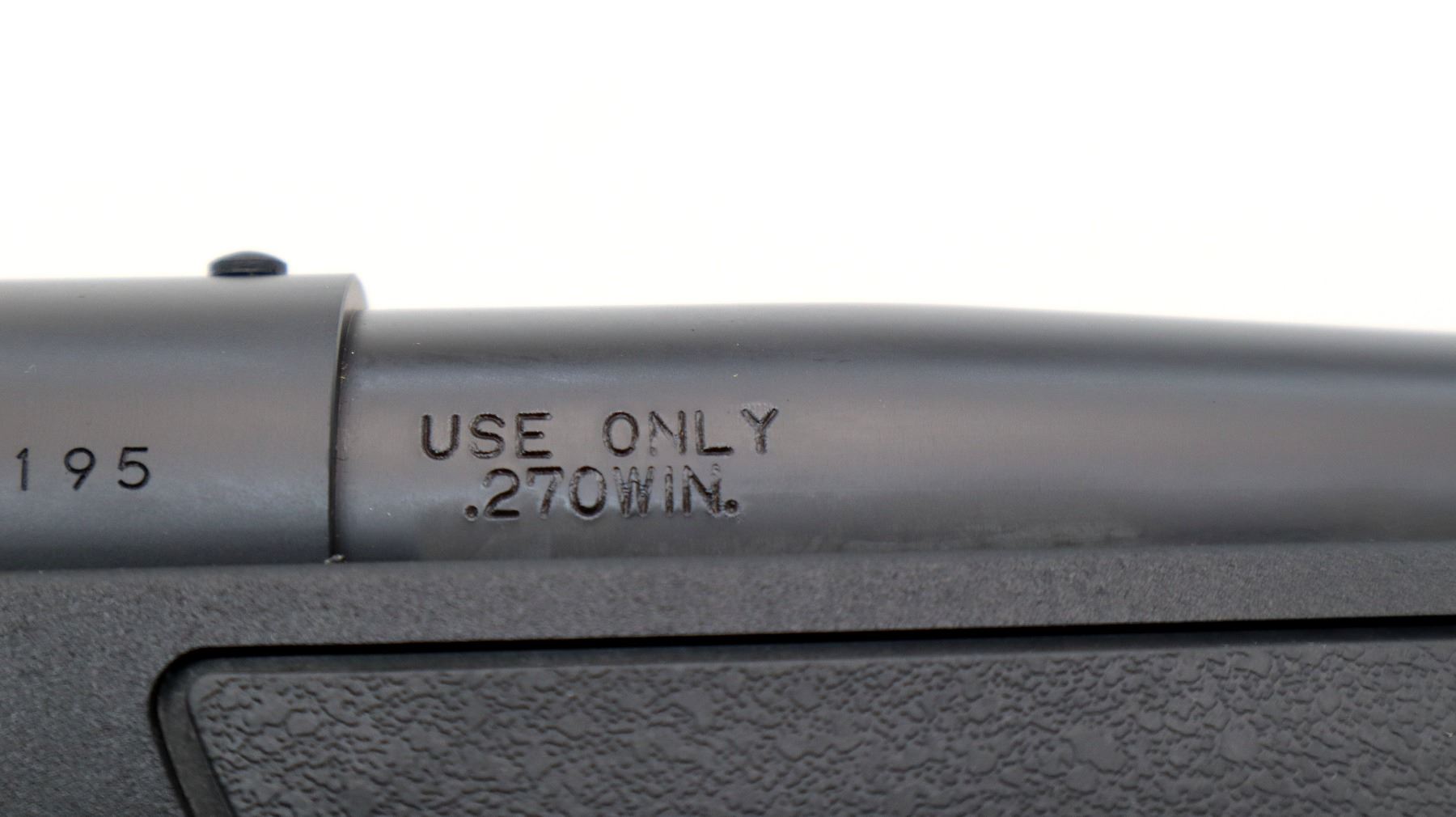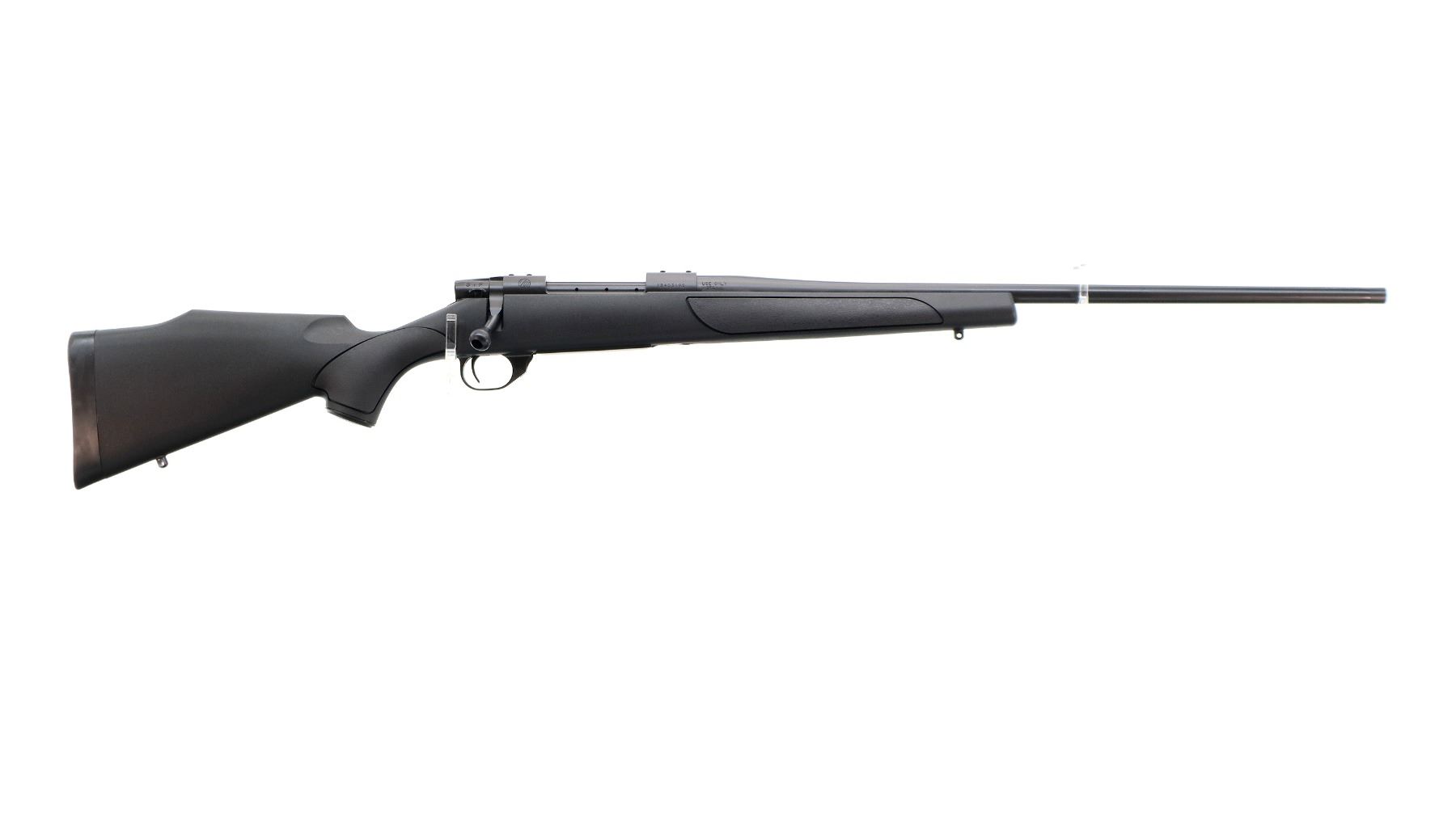Main Description: May have been test fired in factory. No sights, black matte metal finish, tapered barrel threaded at muzzle with cap, receiver drilled and tapped with plastic plugs installed, fluted bolt with checkered knob. One piece black synthetic stock, textured forearm and pistol grip panels, cheek rest, black rubber recoil pad, grip cap, hinged floor plate, swivel studs.