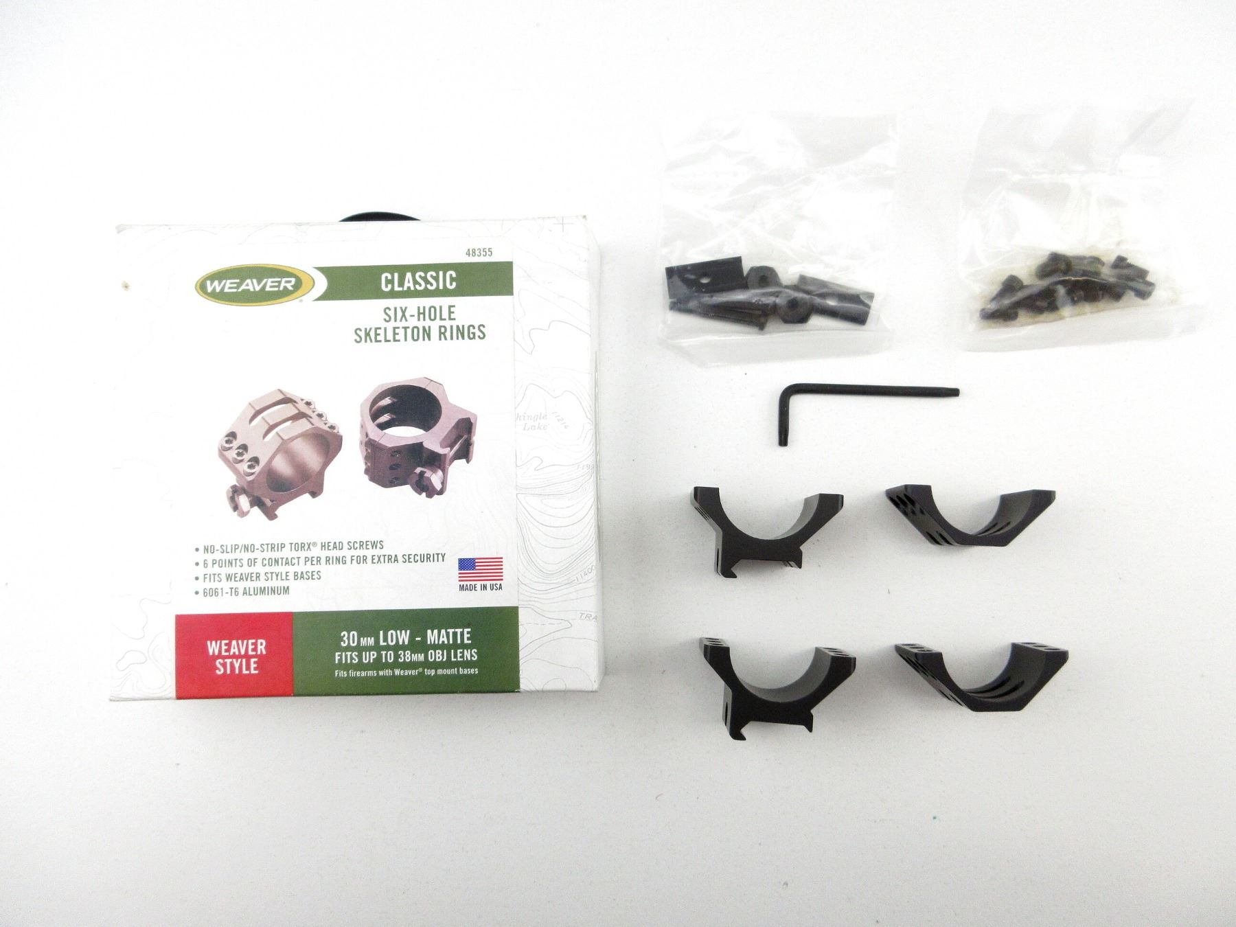 LOT INCLUDES; (1) SIX-HOLE SKELETON RINGS KIT, 30MM, LOW PROFILE, MATTE BLACK, KIT MAY NOT BE COMPLETE, APPEARS NOS, IN ORIGINAL PACKAGING. MAY REQUIRE FITTING. SEE PHOTOS.
