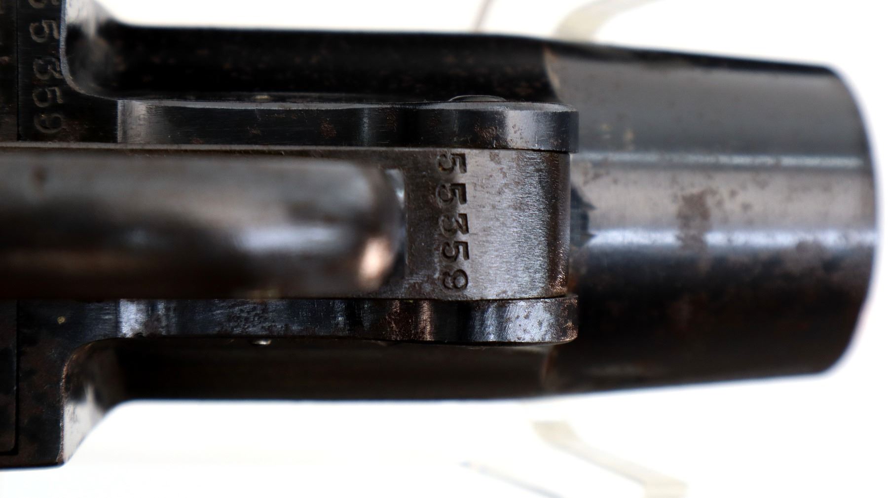 Main Description: Dated 1940, visible numbers match. No sights, blued finish, tapered barrel, grooved opening lever, spurless hammer, double action only which functions. Two piece checkered black polymer grips, lanyard ring.