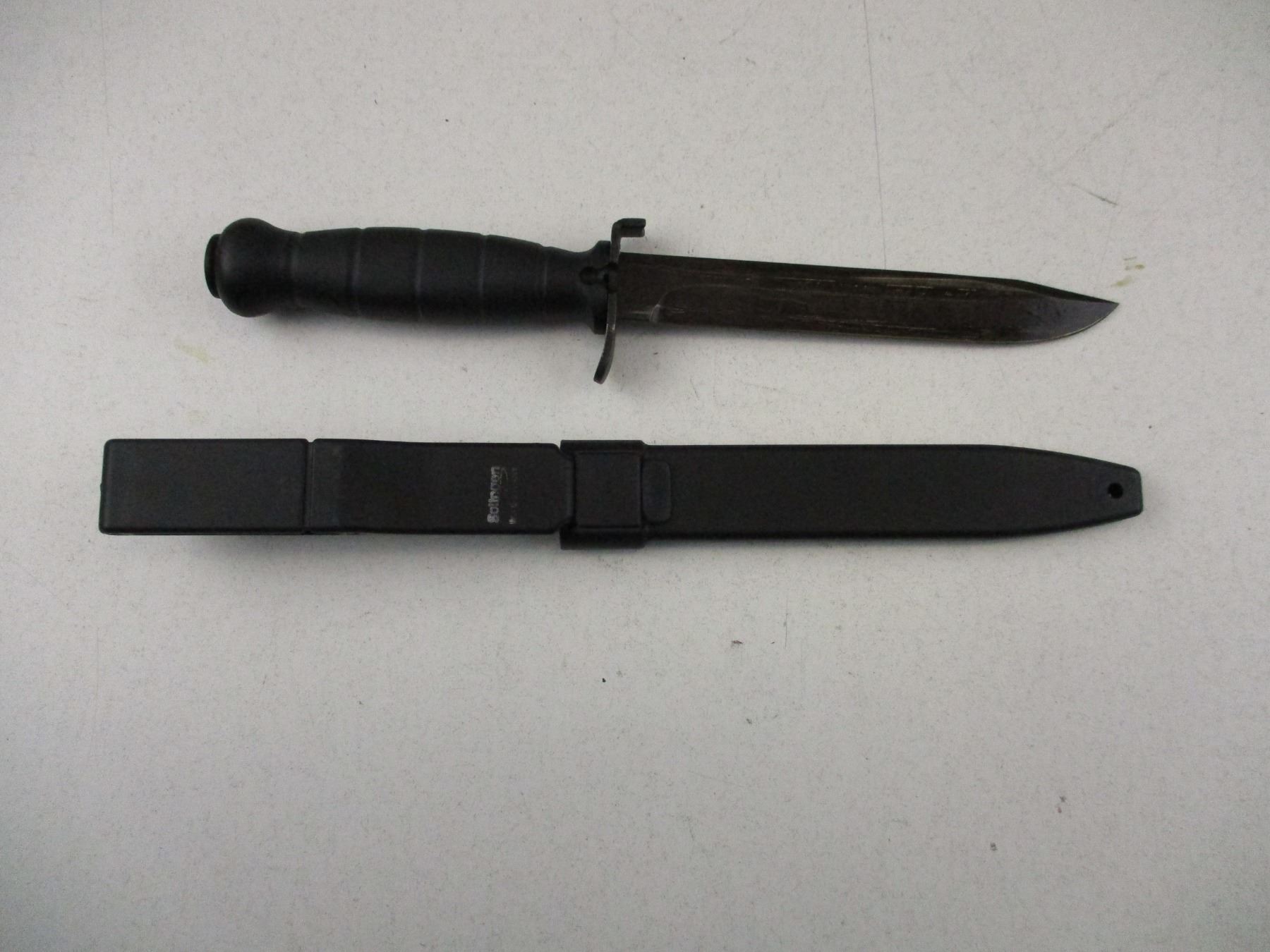 WEST GERMAN FIGHTING KNIFE , BLACK PLASTIC HANDLE, STAINLESS STEEL BLADE, BLACK COMPOSITE SCABBARD. NO VISUAL MARKINGS. APPROXIMATE LENGTHS: 6 1/2" BLADE, 11 1/2" OVERALL LENGTH.