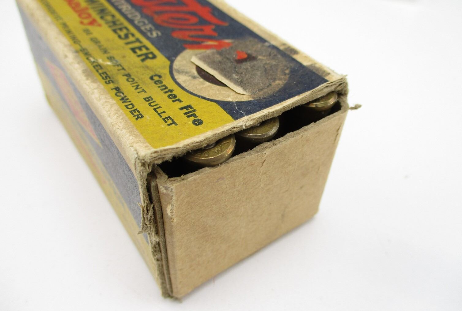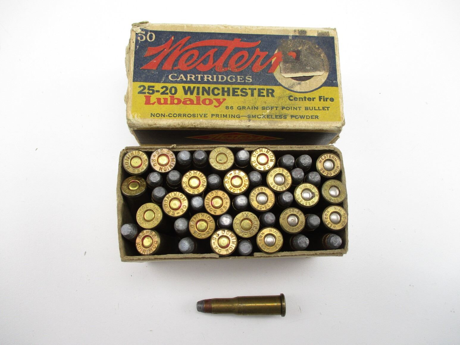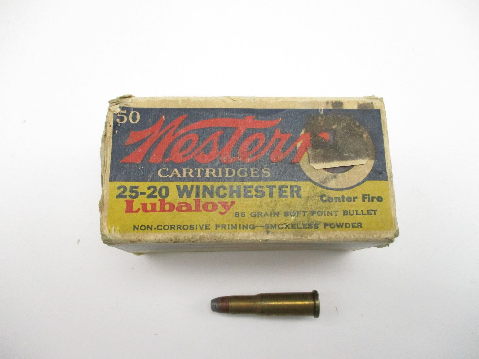 WESTERN 25-20 WIN COLLECTIBLE AMMO , 50 RNDS, 86 GRNS (STATED ON BOX, NOT CONFIRMED), SP, IN DAMAGED COLLECTIBLE AMMO BOX , THERE ARE NEW SHIPPING RESTRICTIONS, PLEASE MAKE SURE YOU HAVE READ AND CONFIRMED WE CAN SHIP TO YOU BEFORE BIDDING ON THIS LOT. PLEASE SEE LOT 0 IN THIS SESSION. NO REFUNDS WILL BE ISSUED, OR BIDS RETRACTED.