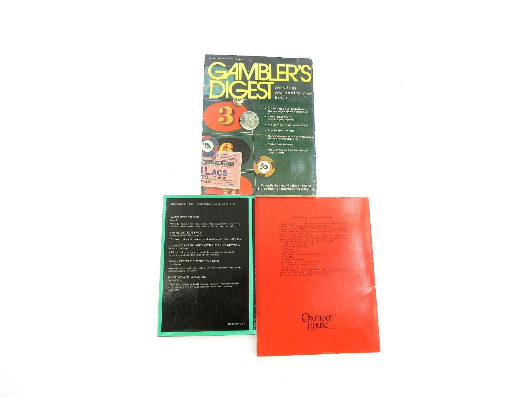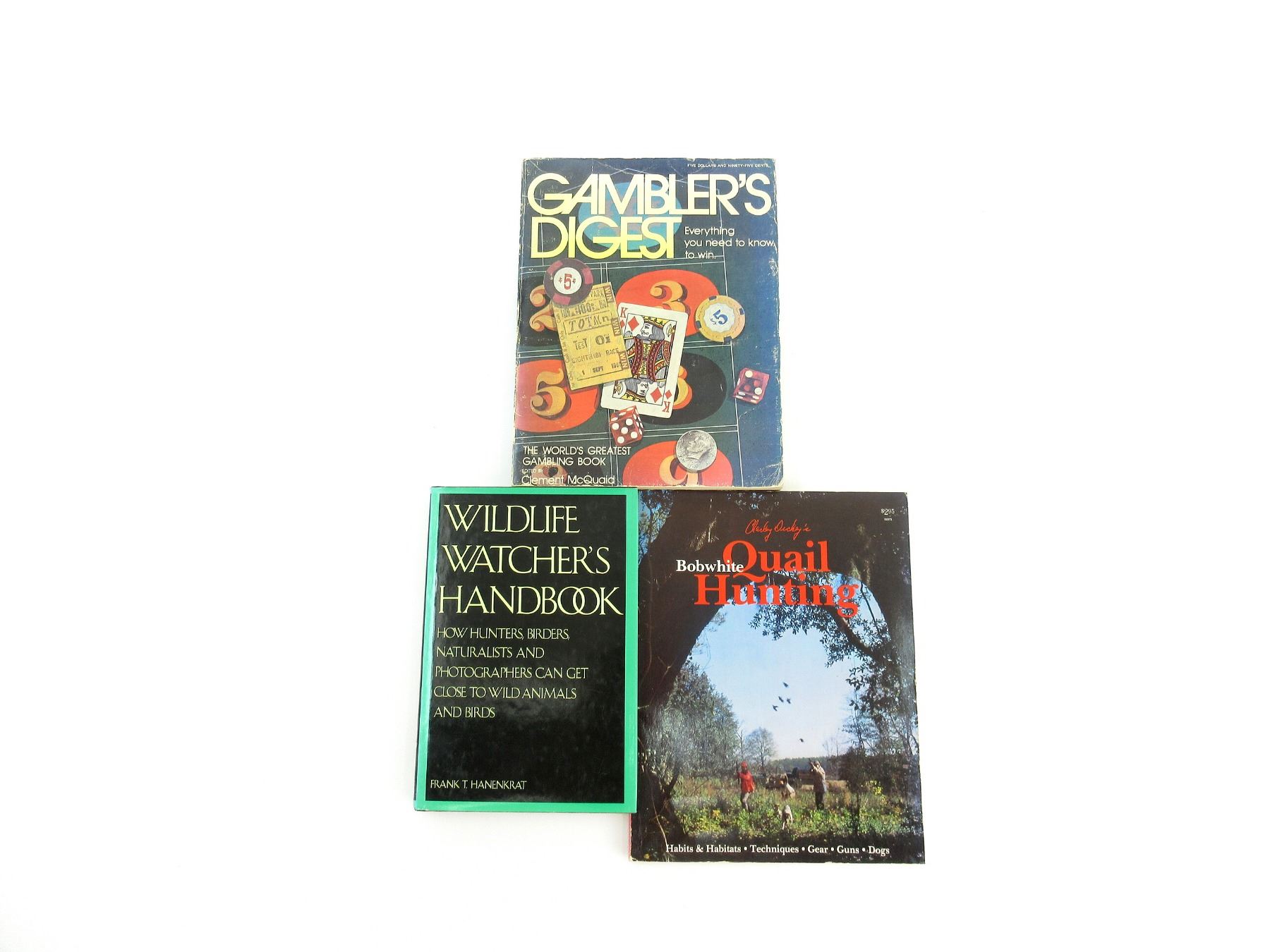 LOT INCLUDES; (1) "WILDLIFE WATCHER'S HANDBOOK" BY FRANK T. HANENKRAT, HARD COVER WITH DUST COVER, ISBN: 0-87691-245-5, (1) "BOBWHITE QUAIL HUNTING" BOOK BY CHARLEY DICKEY, SOFT COVER, FIRST PRINT, COPYRIGHT 1974 & (1) "GAMBLER'S DIGEST, EVERYTHING YOU NEED TO KNOW TO WIN" BOOK EDITED BY CLEMENT MCQUAID, SOFT COVER, ISBN: 0-695-80104-X. SEE PHOTOS.