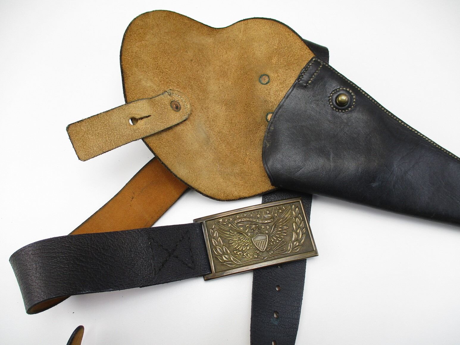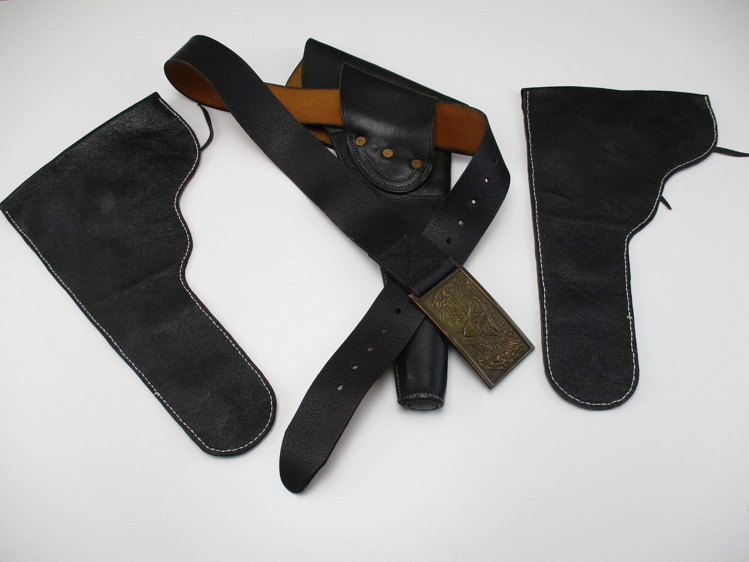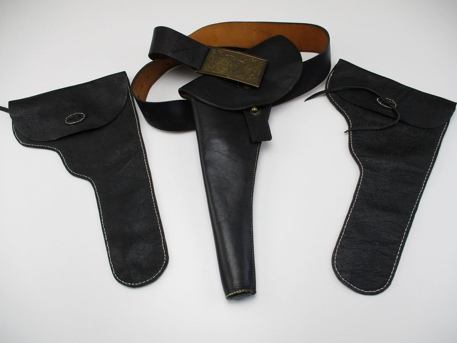 WILKINSON EXPORT LEATHER BELT WITH BUCKLE & REVOLVER STYLE HOLSTERS , APPROX. 38" BELT LENGTH FROM MIDDLE HOLE, BRASS BELT BUCKLE WITH EAGLE & SHIELD ON IT, (1) LEATHER LEFT HANDED REVOLVER HOLSTER, APPROX. 10.75", (2) LEATHER REVOLVER HOLSTERS, APPROX. 12".