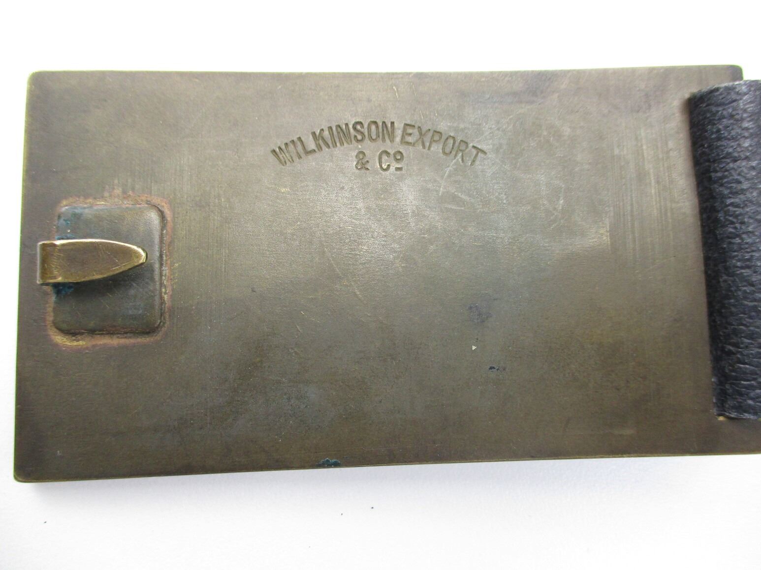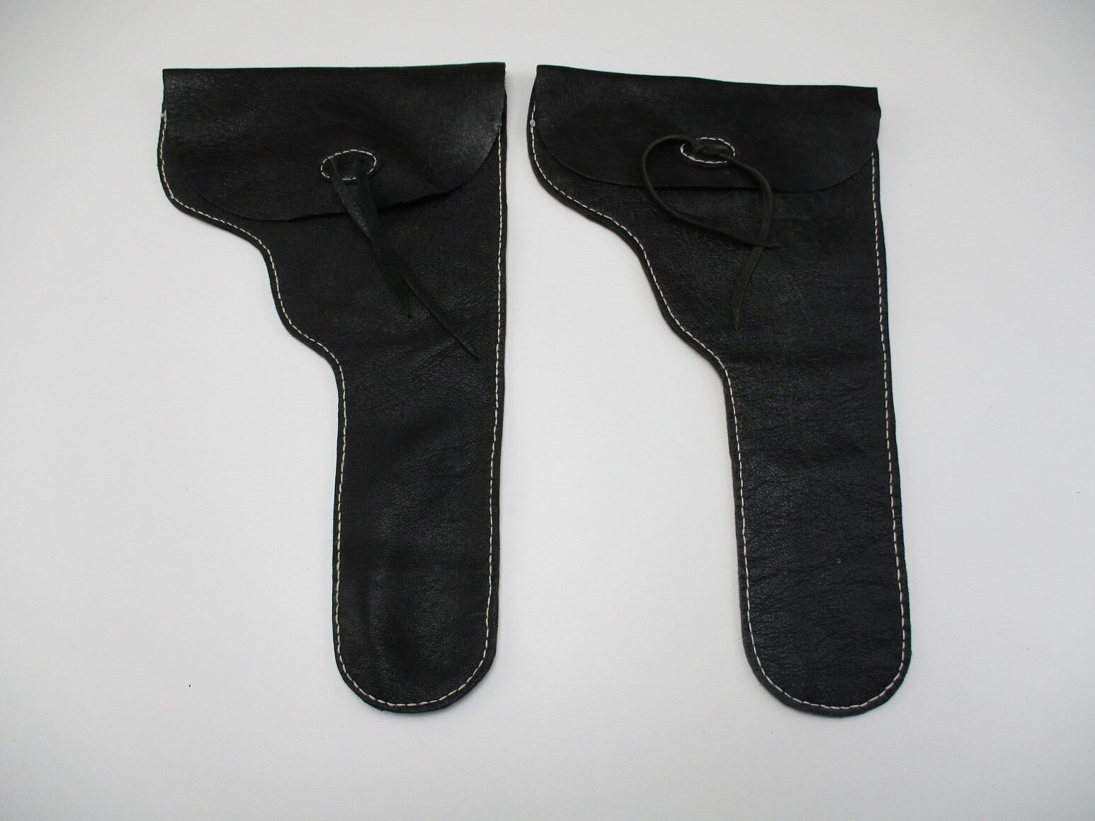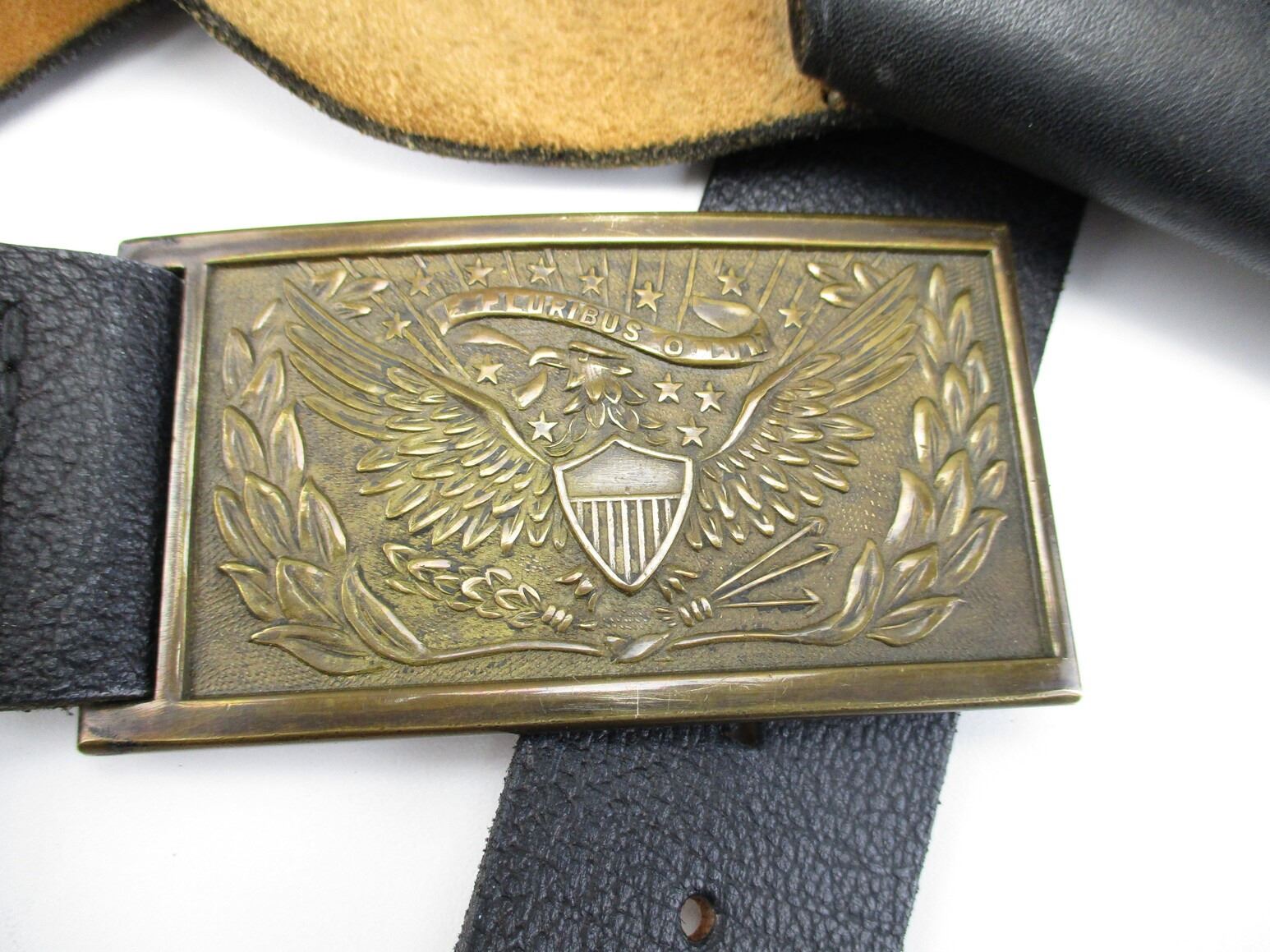 WILKINSON EXPORT LEATHER BELT WITH BUCKLE & REVOLVER STYLE HOLSTERS , APPROX. 38" BELT LENGTH FROM MIDDLE HOLE, BRASS BELT BUCKLE WITH EAGLE & SHIELD ON IT, (1) LEATHER LEFT HANDED REVOLVER HOLSTER, APPROX. 10.75", (2) LEATHER REVOLVER HOLSTERS, APPROX. 12".