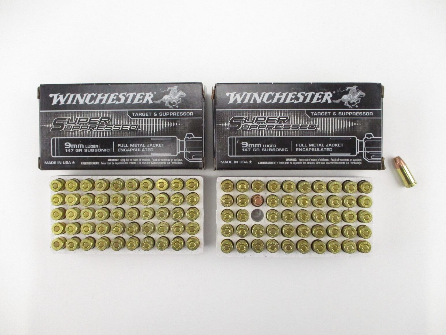 WINCHESTER 9MM LUGER AMMO, 100 RNDS SUPER SUPPRESSOR, 147 GRNS (STATED ON BOX, NOT CONFIRMED) SUBSONIC, FMJ ENCAPSULATED. THERE ARE NEW SHIPPING RESTRICTIONS, PLEASE MAKE SURE YOU HAVE READ AND CONFIRMED WE CAN SHIP TO YOU BEFORE BIDDING ON THIS LOT. PLEASE SEE LOT 0 IN THIS SESSION. NO REFUNDS WILL BE ISSUED, OR BIDS RETRACTED.