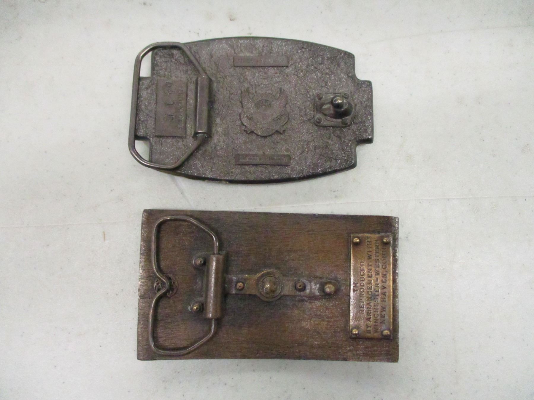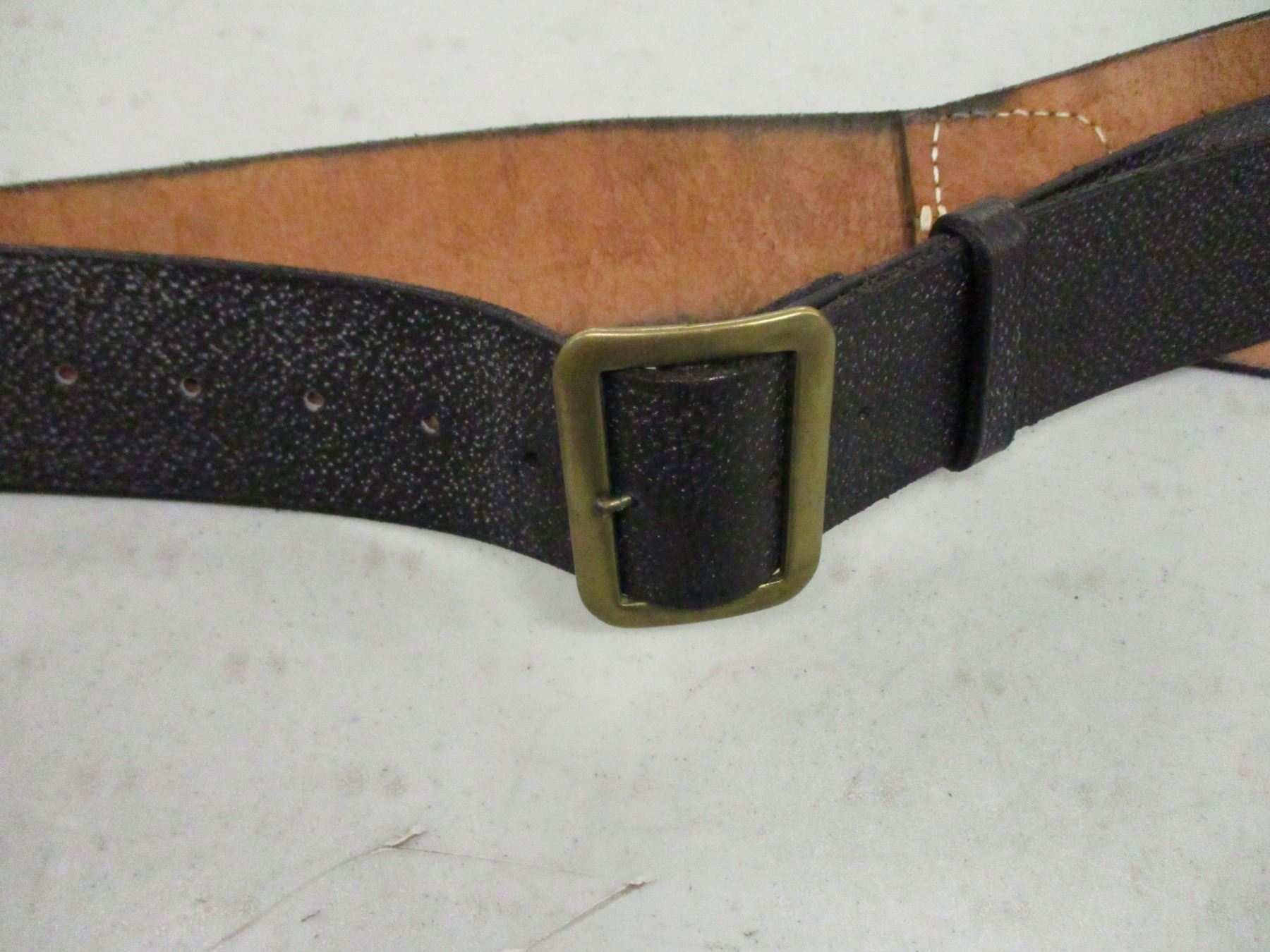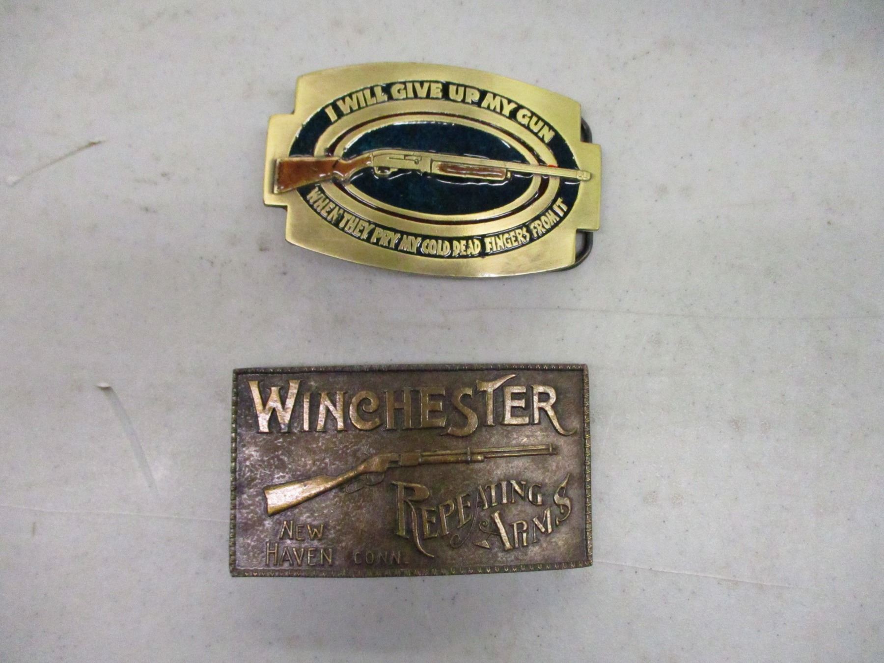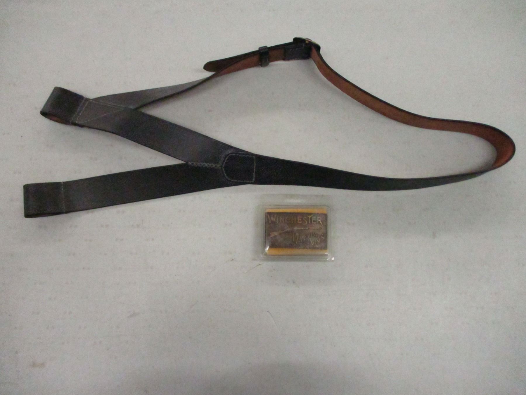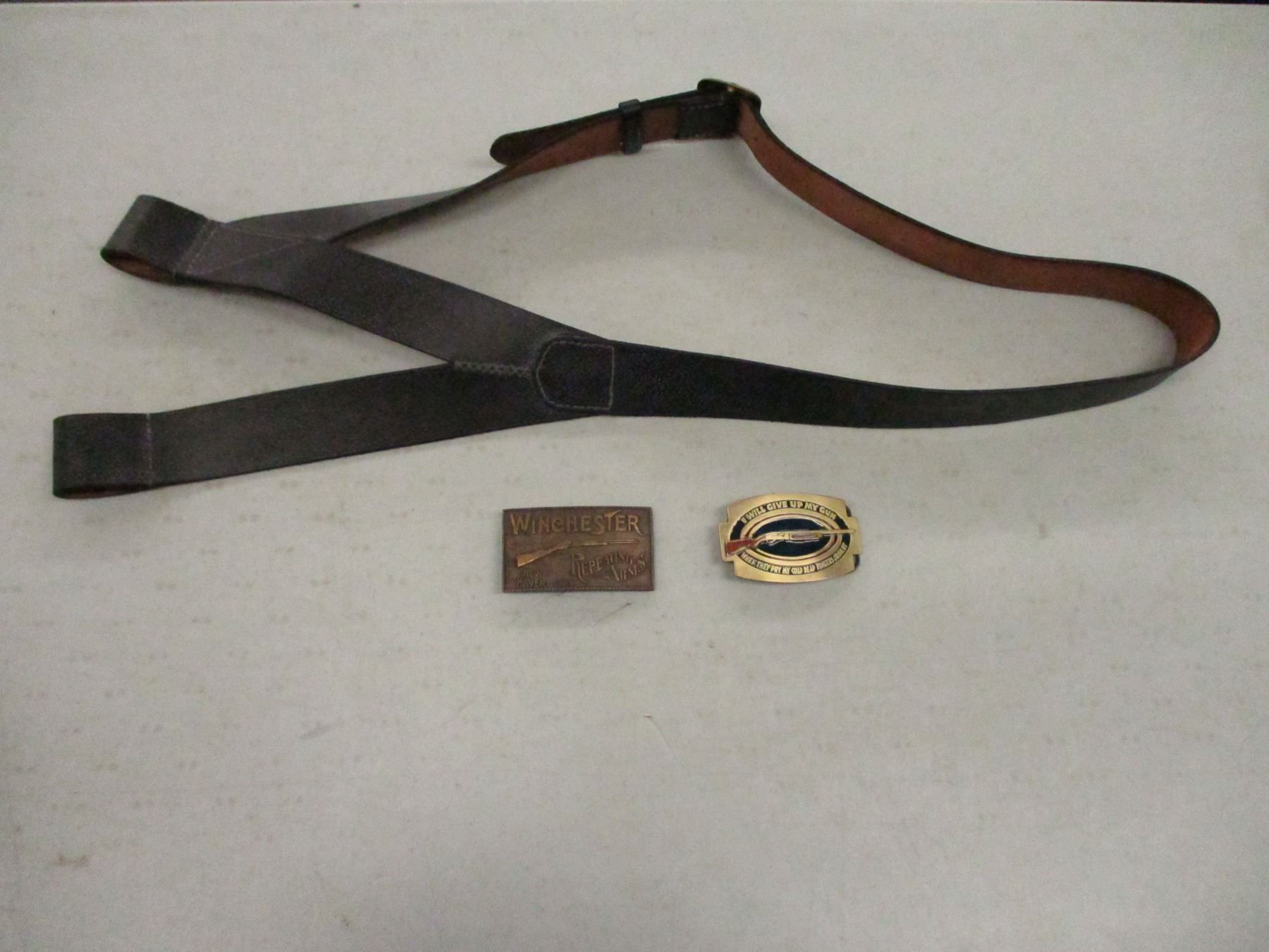 WINCHESTER / GUN BELT BUCKLES + LEATHER SHOULDER STRAP. , (1) WINCHESTER BELT BUCKLE ETCHED PLATE ON BACK, (1) BUCKLE MARKED D 415. (1) UNMARKED LEATHER SHOULDER STRAP, WITH ACCESSORY LOOPS, APPROX. 42" FROM MIDDLE HOLE OF STRAP.