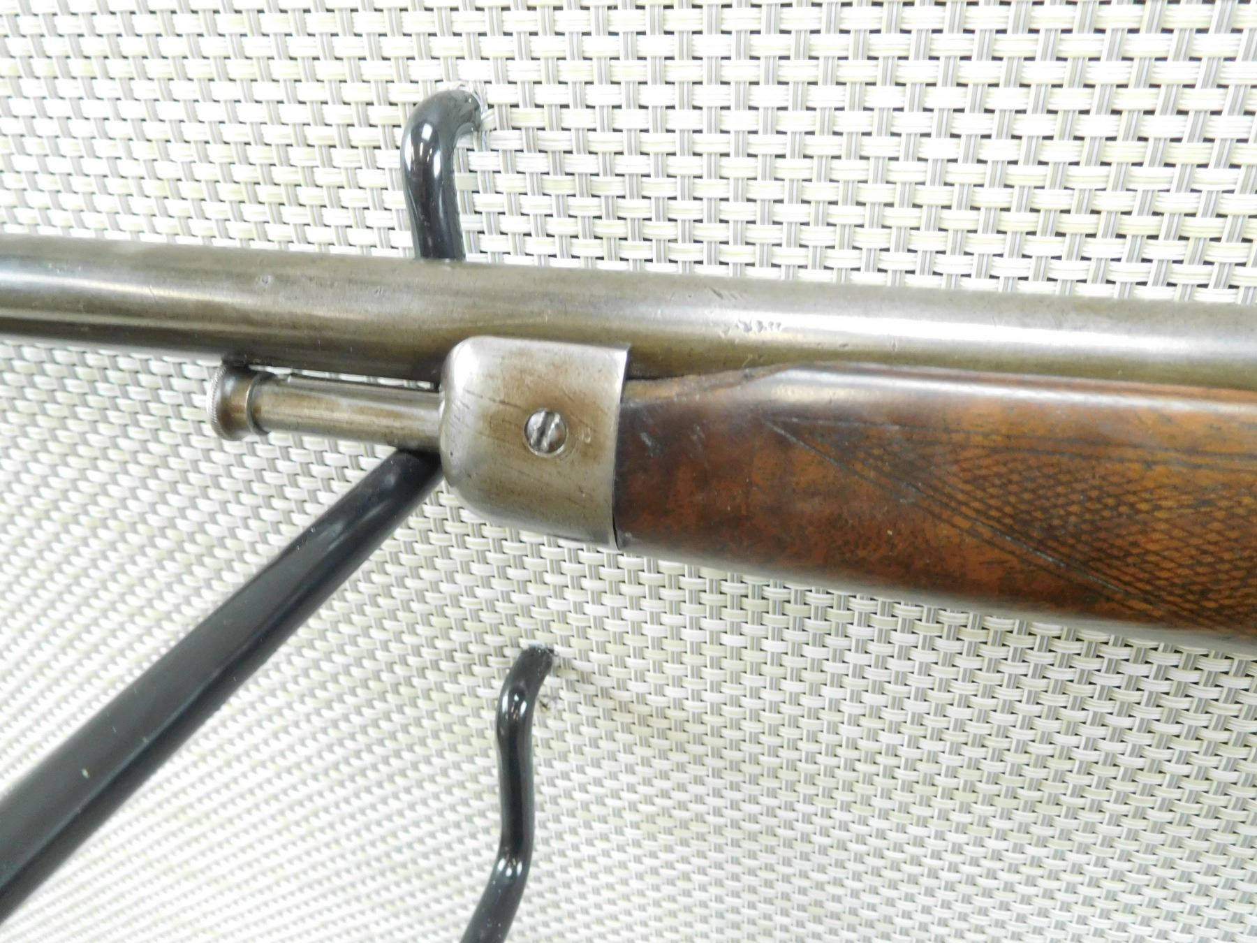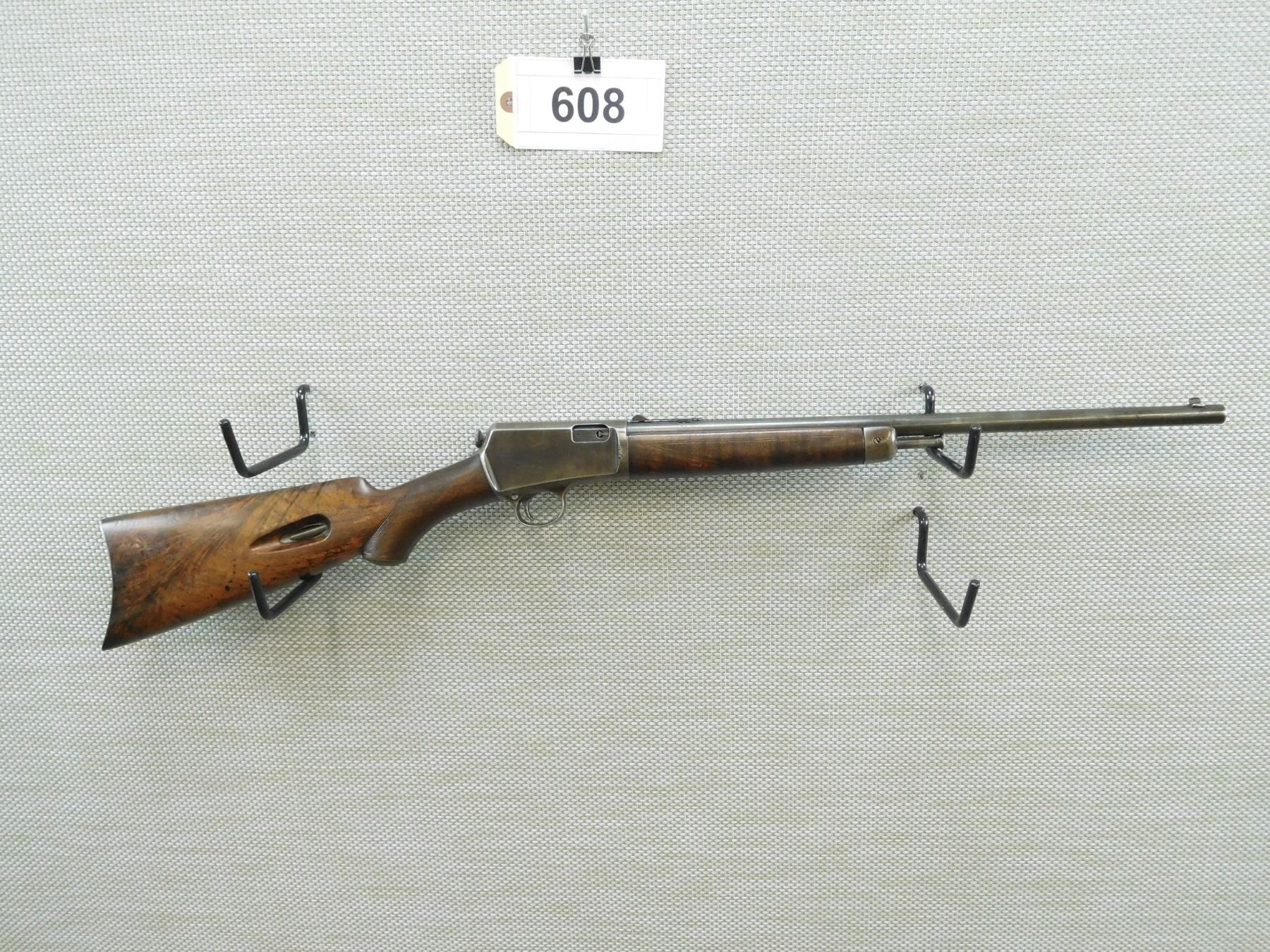 WINCHESTER/JGA , MODEL: SELF LOADING , CALIBER: 22 LR REBARRELLED , THIS ITEM HAS BEEN REBARRELLED WITH A JGA BARREL COMBINED WITH A WINCHESTER RECEIVER, TUBULAR MAGAZINE IN THE BUTT, DOVETAIL FRONT AND ADJUSTABLE REAR SIGHTS, CHECKERED FOREND AND CAPPED PISTOL GRIP BUTT STOCK, STOCK IS CRACKED AT THE WRIST, CHIPPED AT THE TOE, SHOWS EXTENSIVE HANDLING MARKS AND FINISH WEAR, BORE IS DARK , BARREL LENGTH: 18" , SERIAL # 42093 , STOCK # 7977 , CONDITION: 5/10 , CLASS: CANADIAN NON RESTRICTED CLASS