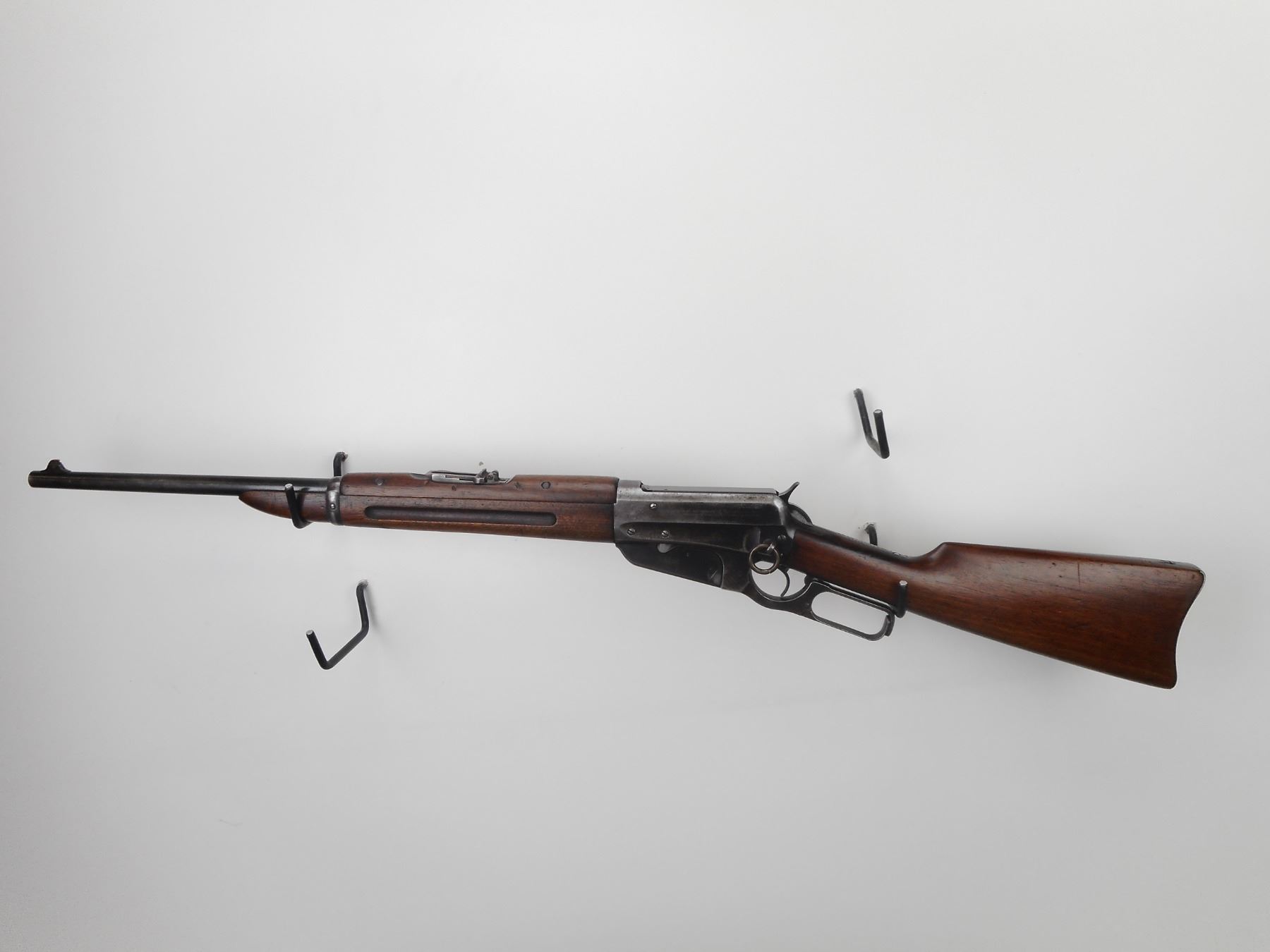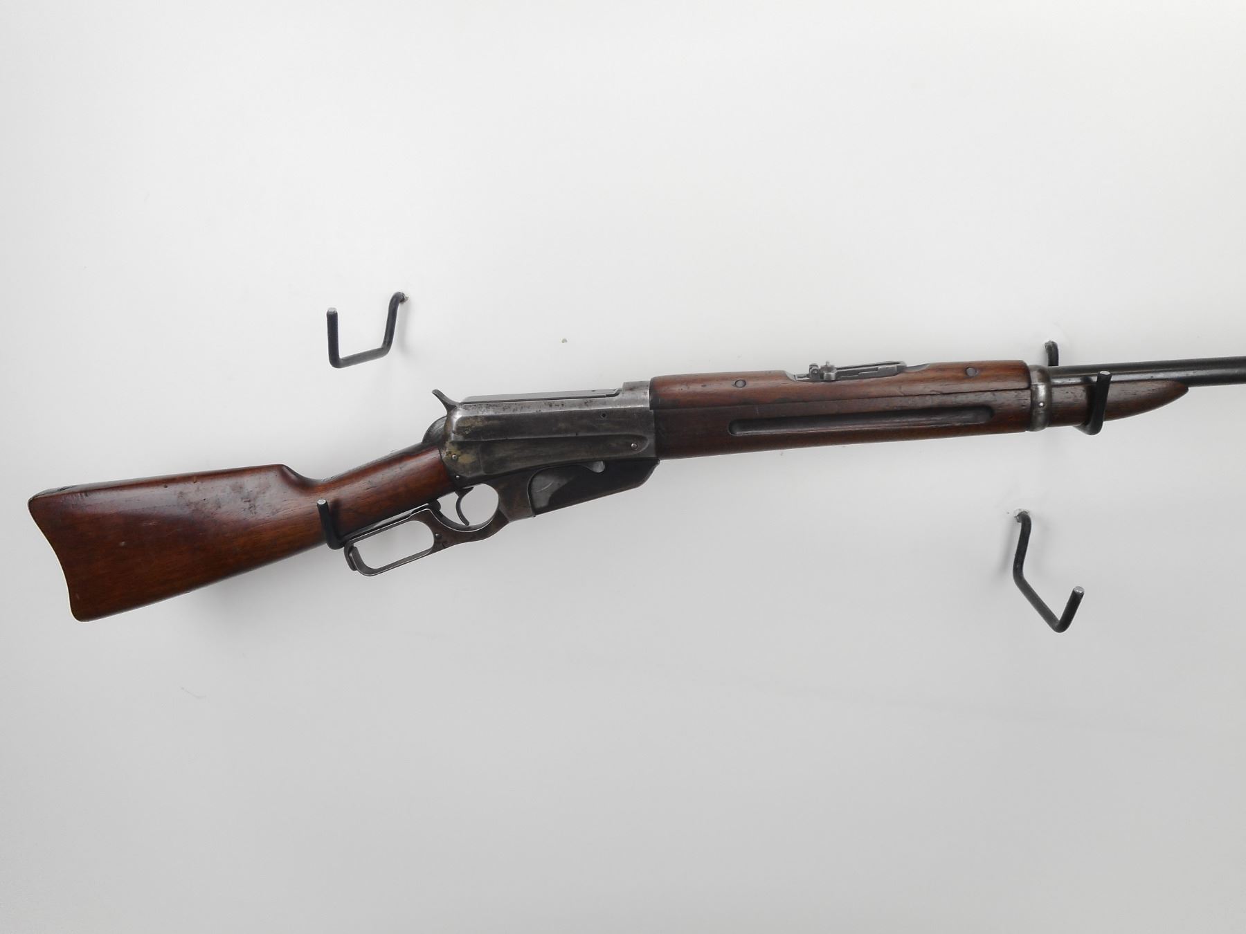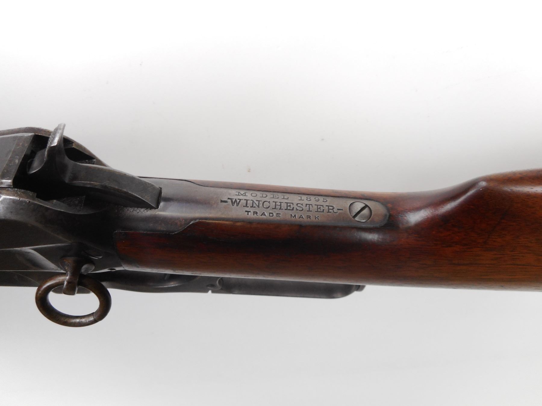 WINCHESTER , MODEL: 1895 SADDLE RING CARBINE , CALIBER: 303 BR , MANUFACTURED IN 1907. VERY GOOD BORE. BLADE FRONT AND ADJUSTABLE REAR SIGHTS. THREE PIECE HARDWOOD STOCK. STEEL BUTTPLATE. RETAINS 50% OF THE ORIGINAL BLUEING. SHOWS SOME HANDLING MARKS. BARREL LENGTH: 22" , CONDITION: 7/10 , STOCK # NR10601, SERIAL # 58218, CLASS: CANADIAN NON RESTRICTED CLASS