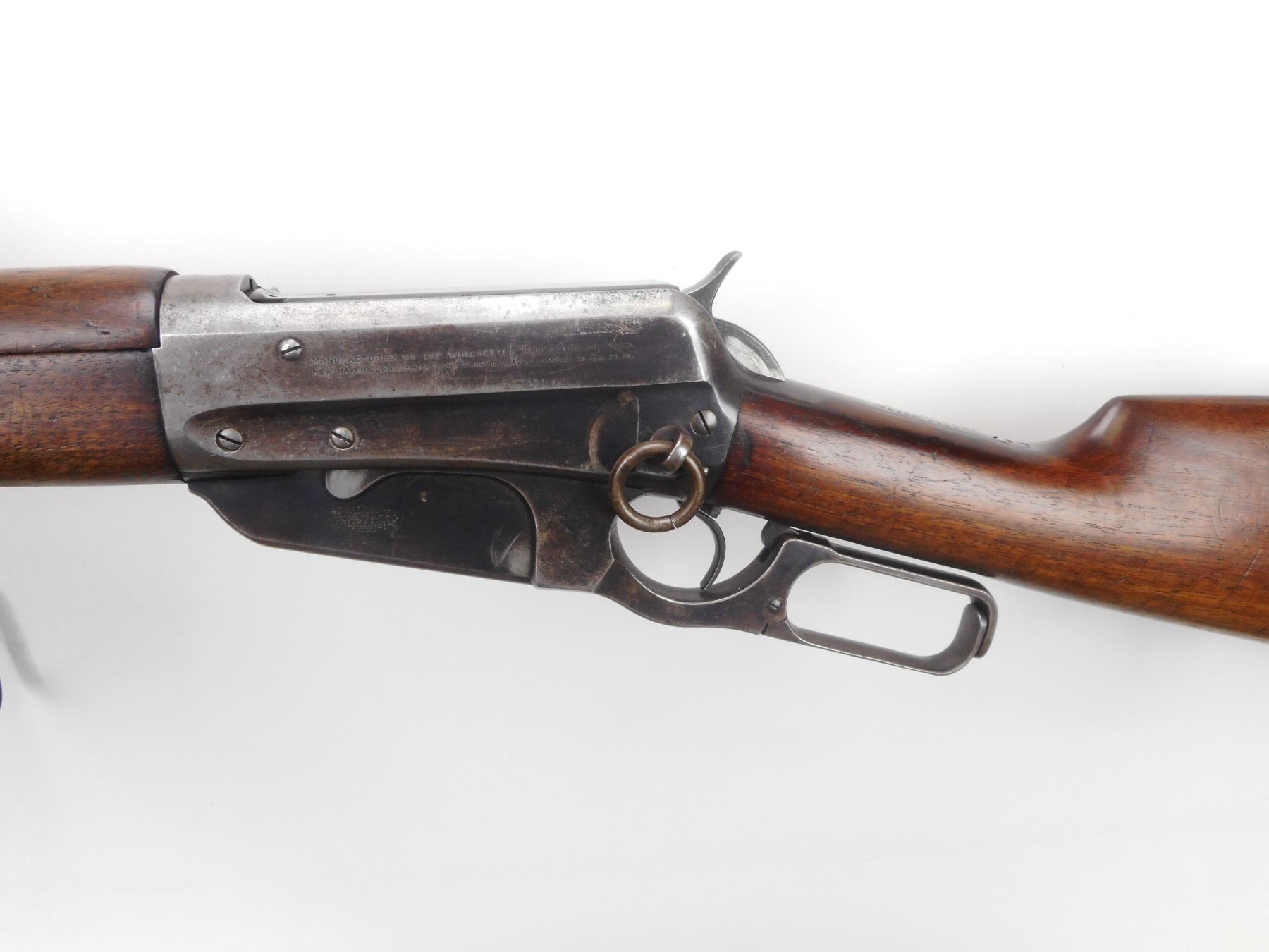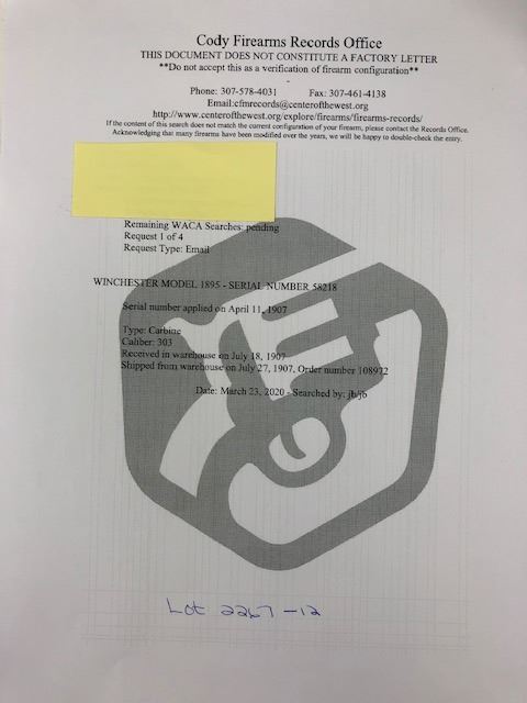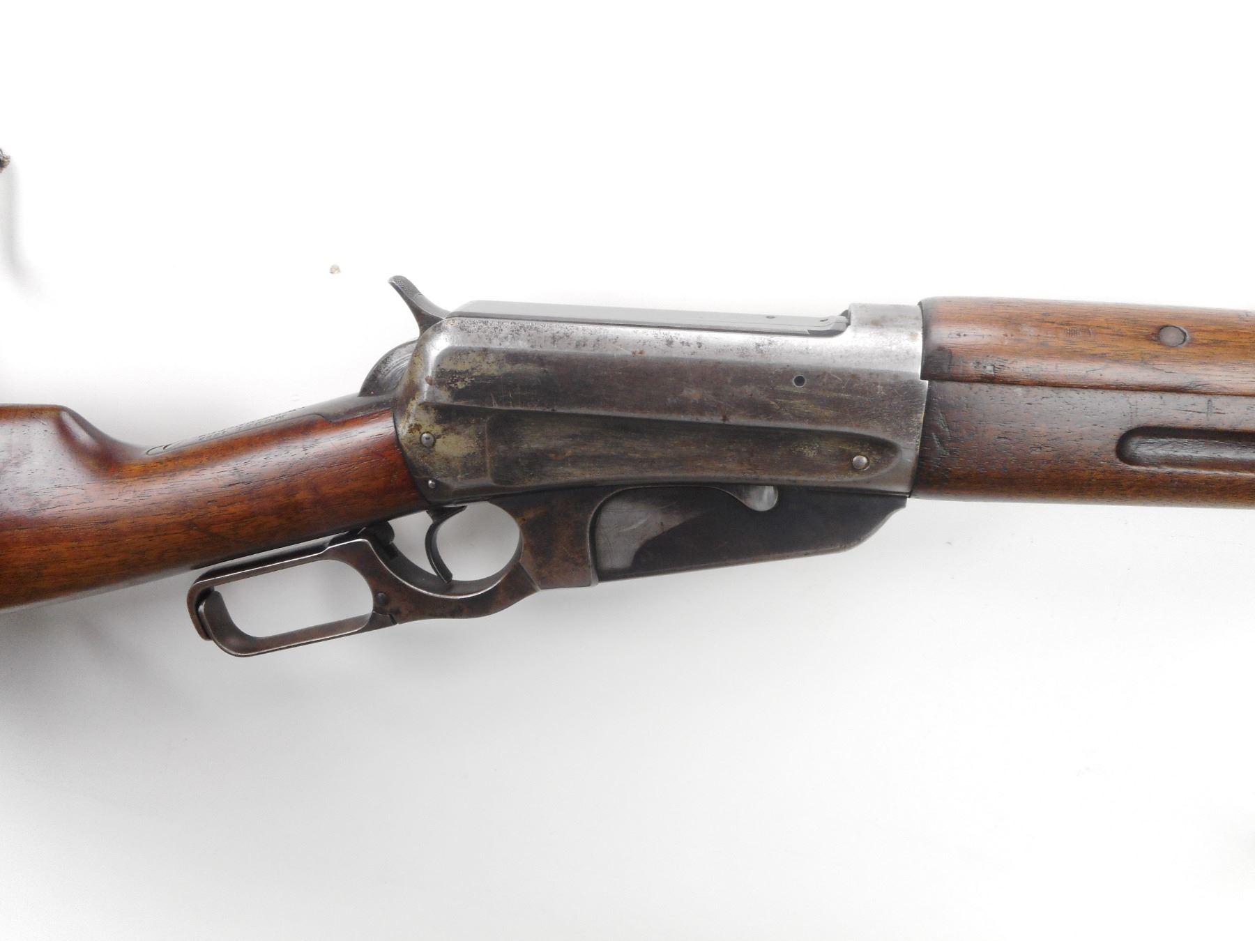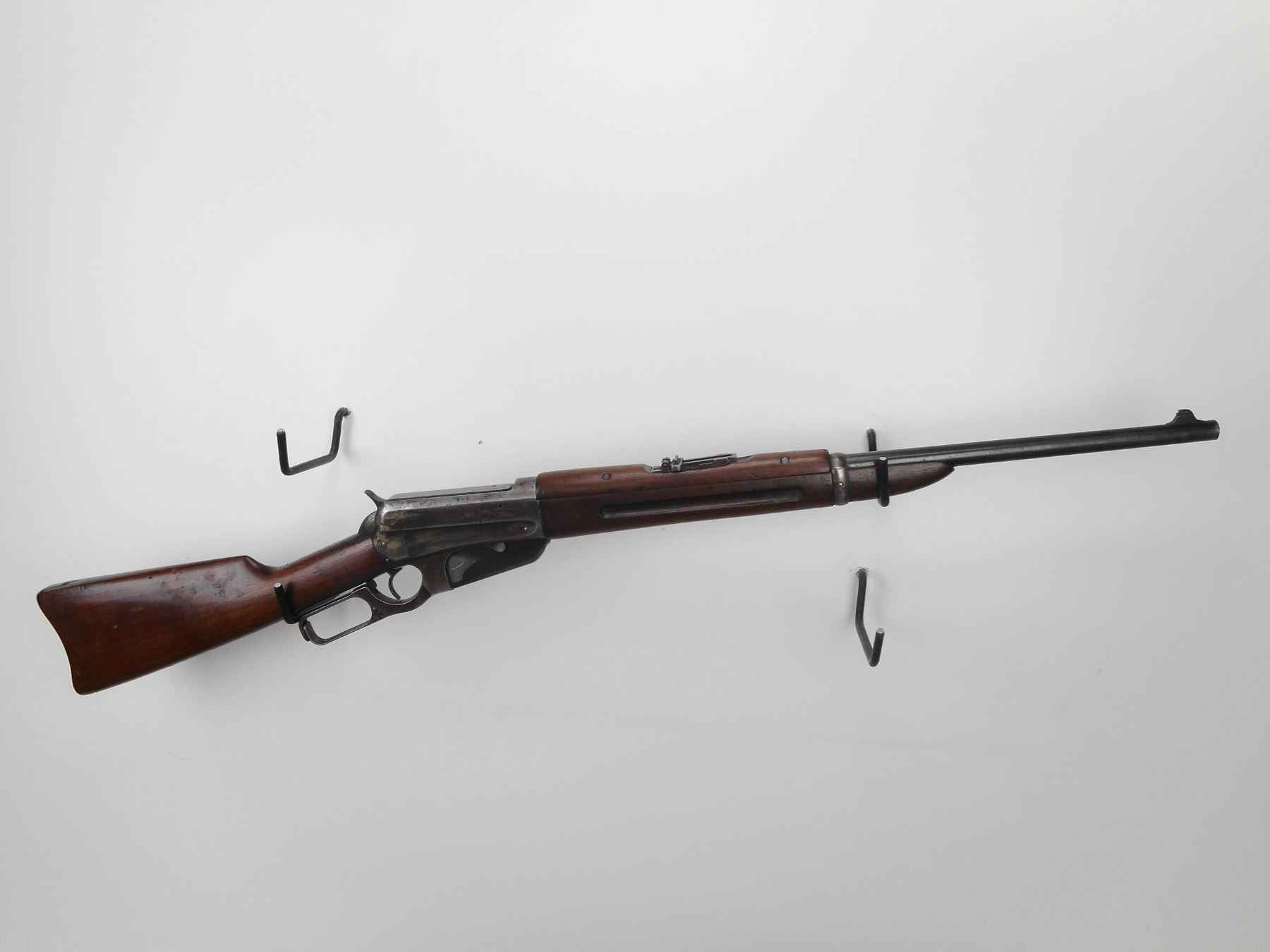 WINCHESTER , MODEL: 1895 SADDLE RING CARBINE , CALIBER: 303 BR , MANUFACTURED IN 1907. VERY GOOD BORE. BLADE FRONT AND ADJUSTABLE REAR SIGHTS. THREE PIECE HARDWOOD STOCK. STEEL BUTTPLATE. RETAINS 50% OF THE ORIGINAL BLUEING. SHOWS SOME HANDLING MARKS. BARREL LENGTH: 22" , CONDITION: 7/10 , STOCK # NR10601, SERIAL # 58218, CLASS: CANADIAN NON RESTRICTED CLASS