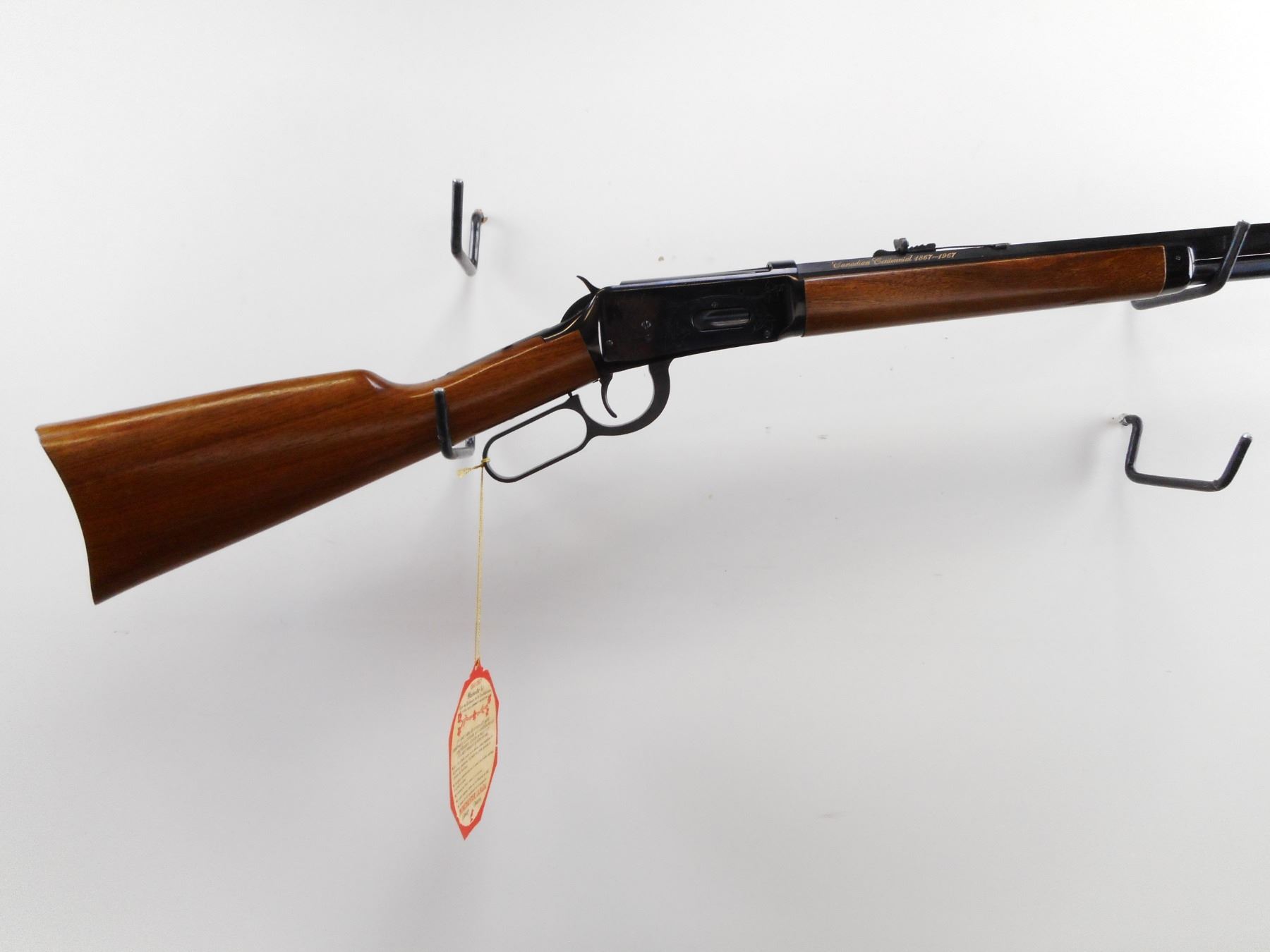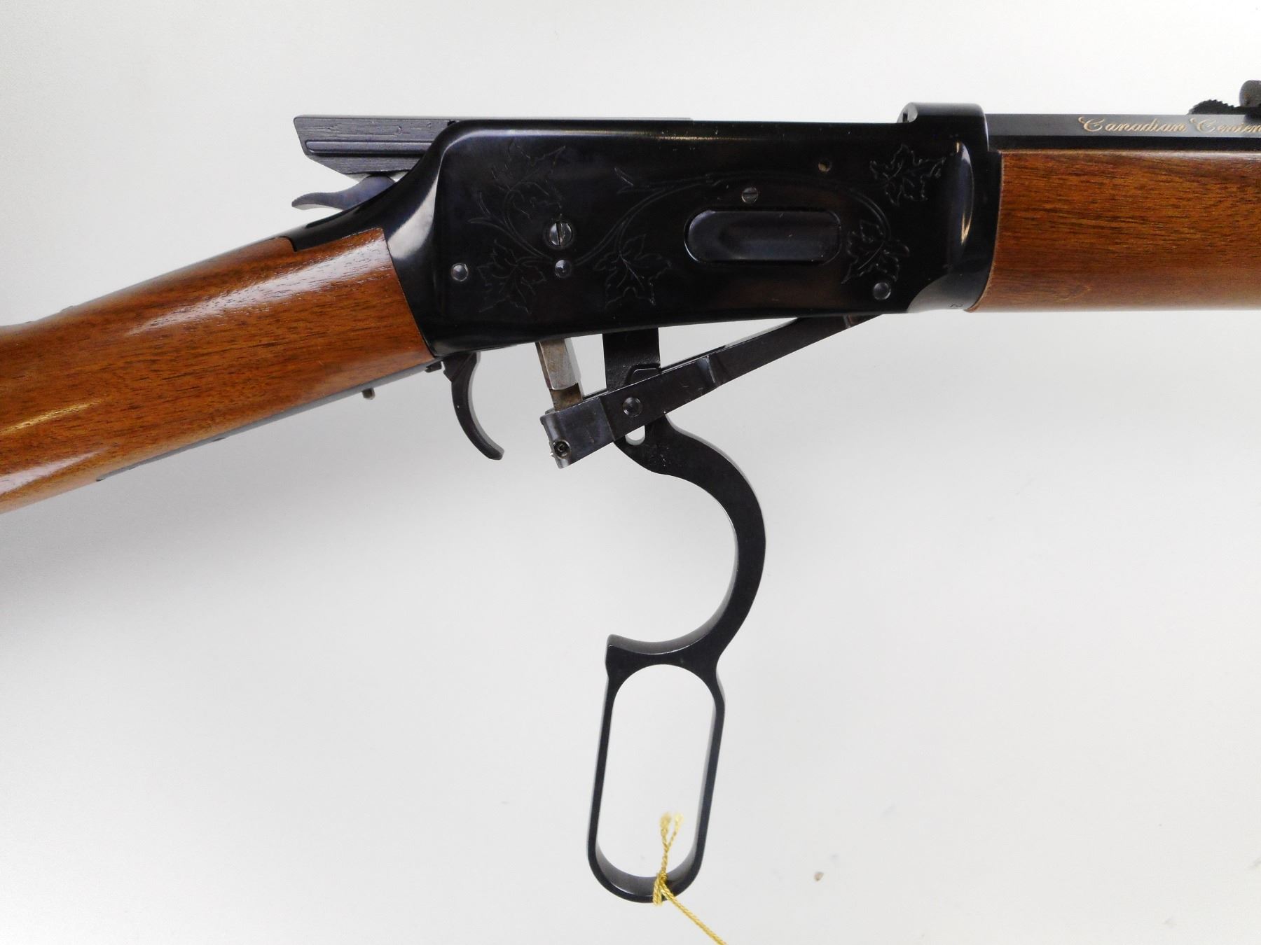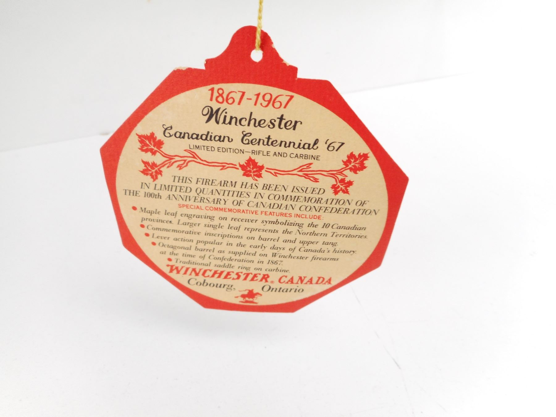 WINCHESTER , MODEL: CANADIAN CENTENNIAL COMMEMORATIVE , CALIBER: 30-30 WIN , AS NEW WITH ORIGINAL TAGS, AND CARDBOARD BOX. BORE IS EXCELLENT, APPEARS AS NEW, MAY HAVE BEEN TEST FIRED AT THE FACTORY. OCTAGONAL BARREL. BLADE FRONT SIGHT. ADJUSTABLE U NOTCH REAR SIGHT. POLISHED BLUED FINISH ON METAL PARTS. RECEIVER IS ENGRAVED WITH MAPLE LEAFS. TWO PIECE SMOOTH WOOD STOCKS. CURVED SMOOTH STEEL BUTT PLATE. SHOWS SLIGHT HANDLING MARKS. , SERIAL # 2694 , ACTION: LEVER ACTION RIFLE , BARREL LENGTH: 26" , CONDITION: 9+/10 , CLASS: CANADIAN NON RESTRICTED CLASS