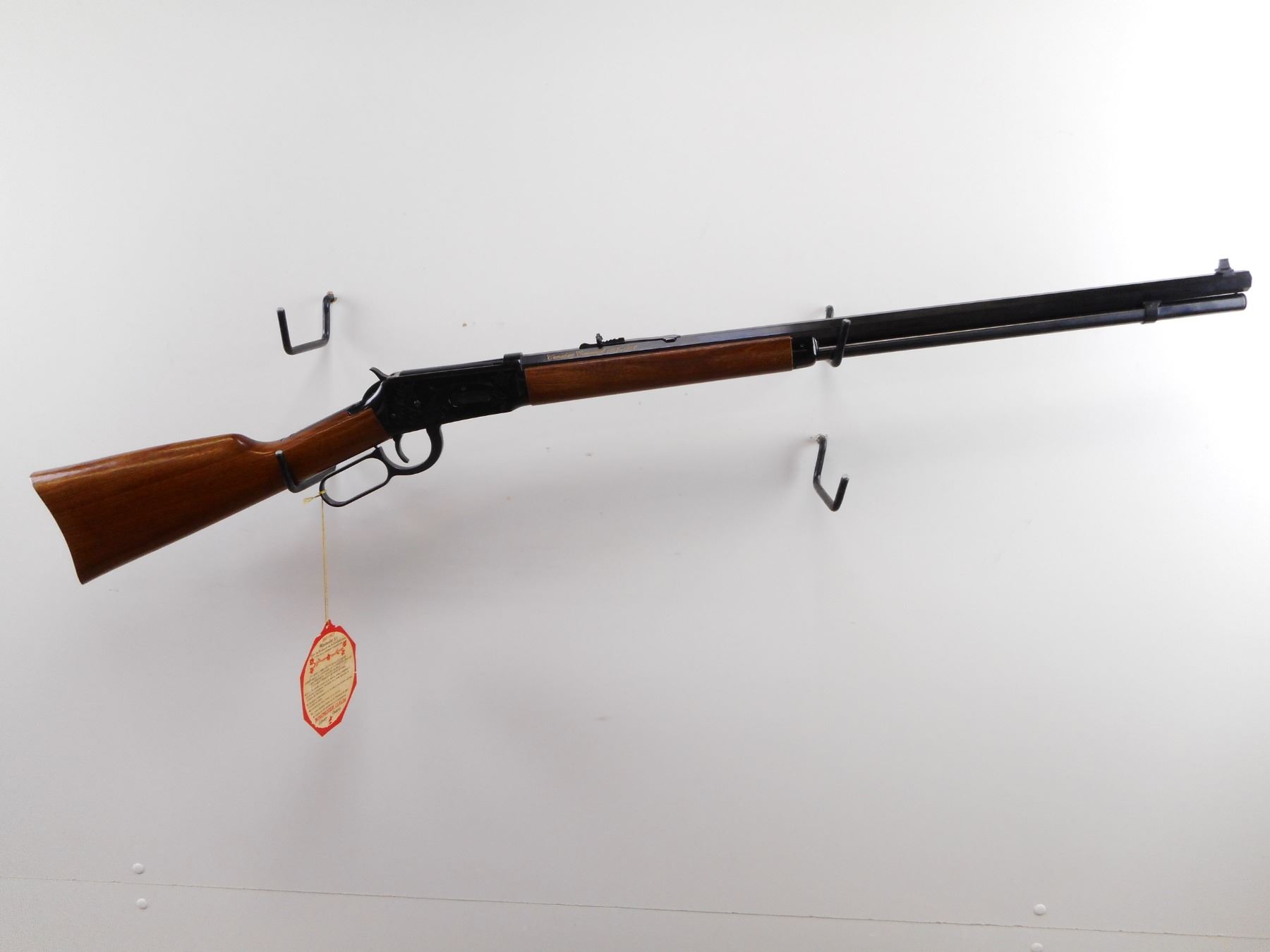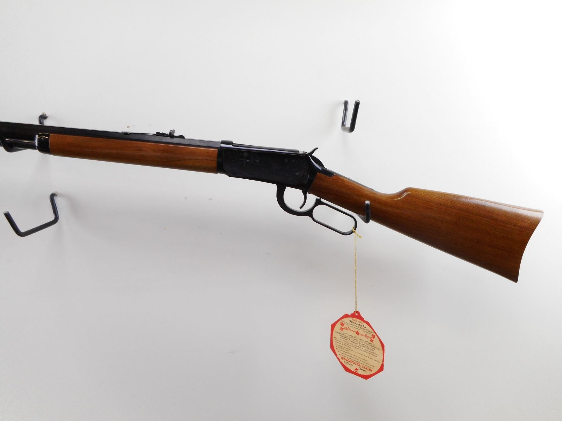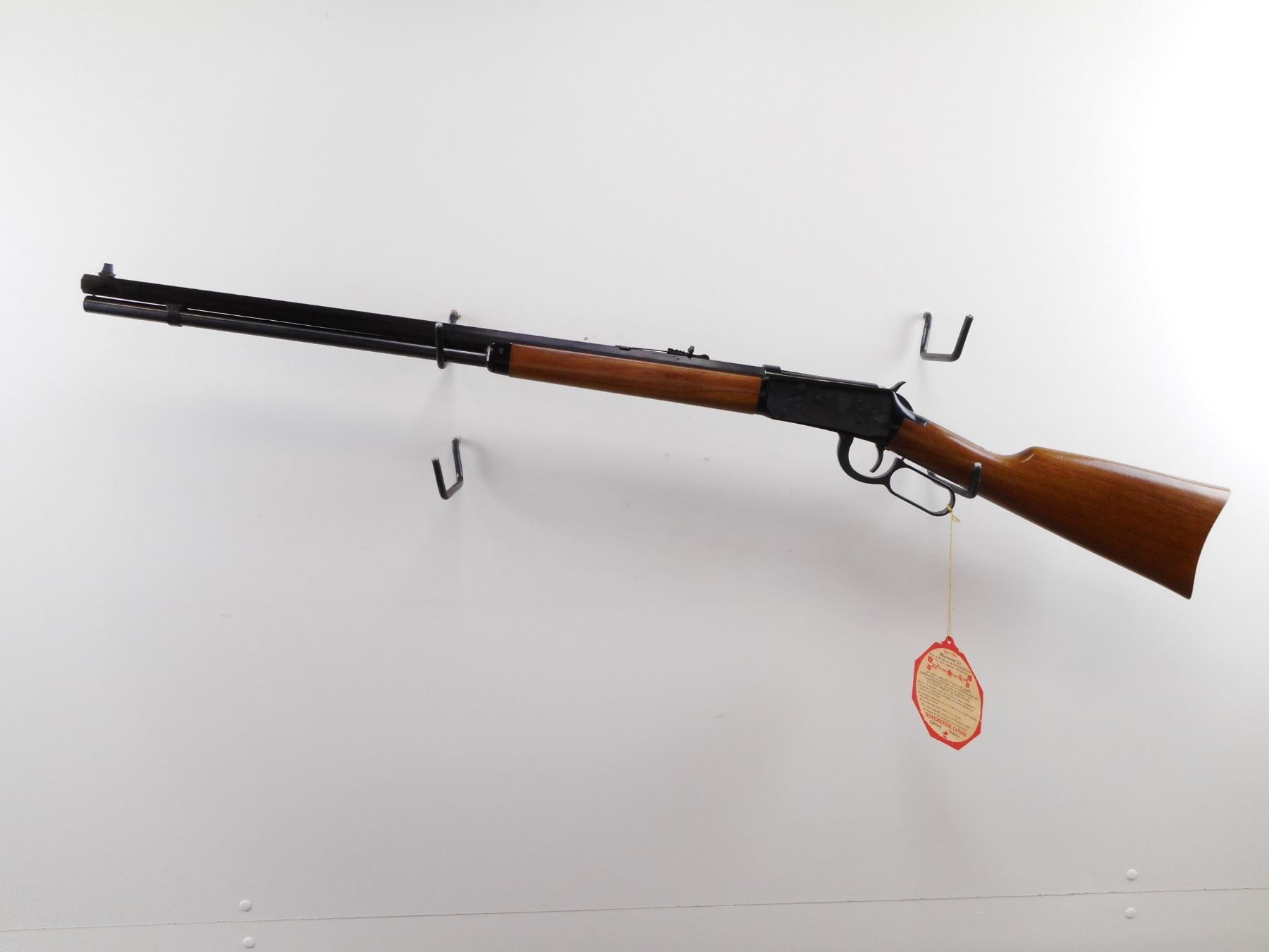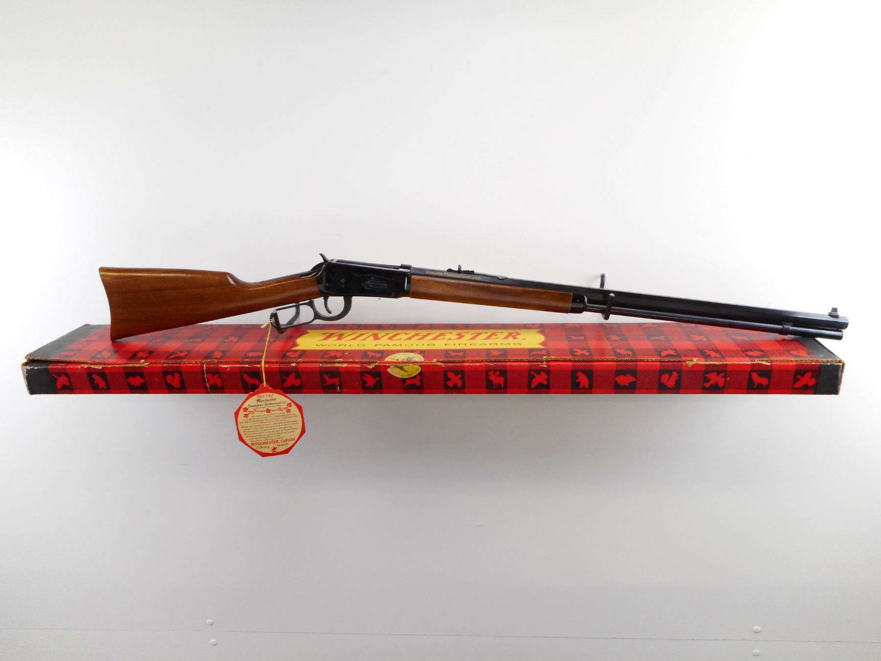 WINCHESTER , MODEL: CANADIAN CENTENNIAL COMMEMORATIVE , CALIBER: 30-30 WIN , AS NEW WITH ORIGINAL TAGS, AND CARDBOARD BOX. BORE IS EXCELLENT, APPEARS AS NEW, MAY HAVE BEEN TEST FIRED AT THE FACTORY. OCTAGONAL BARREL. BLADE FRONT SIGHT. ADJUSTABLE U NOTCH REAR SIGHT. POLISHED BLUED FINISH ON METAL PARTS. RECEIVER IS ENGRAVED WITH MAPLE LEAFS. TWO PIECE SMOOTH WOOD STOCKS. CURVED SMOOTH STEEL BUTT PLATE. SHOWS SLIGHT HANDLING MARKS. , SERIAL # 2694 , ACTION: LEVER ACTION RIFLE , BARREL LENGTH: 26" , CONDITION: 9+/10 , CLASS: CANADIAN NON RESTRICTED CLASS