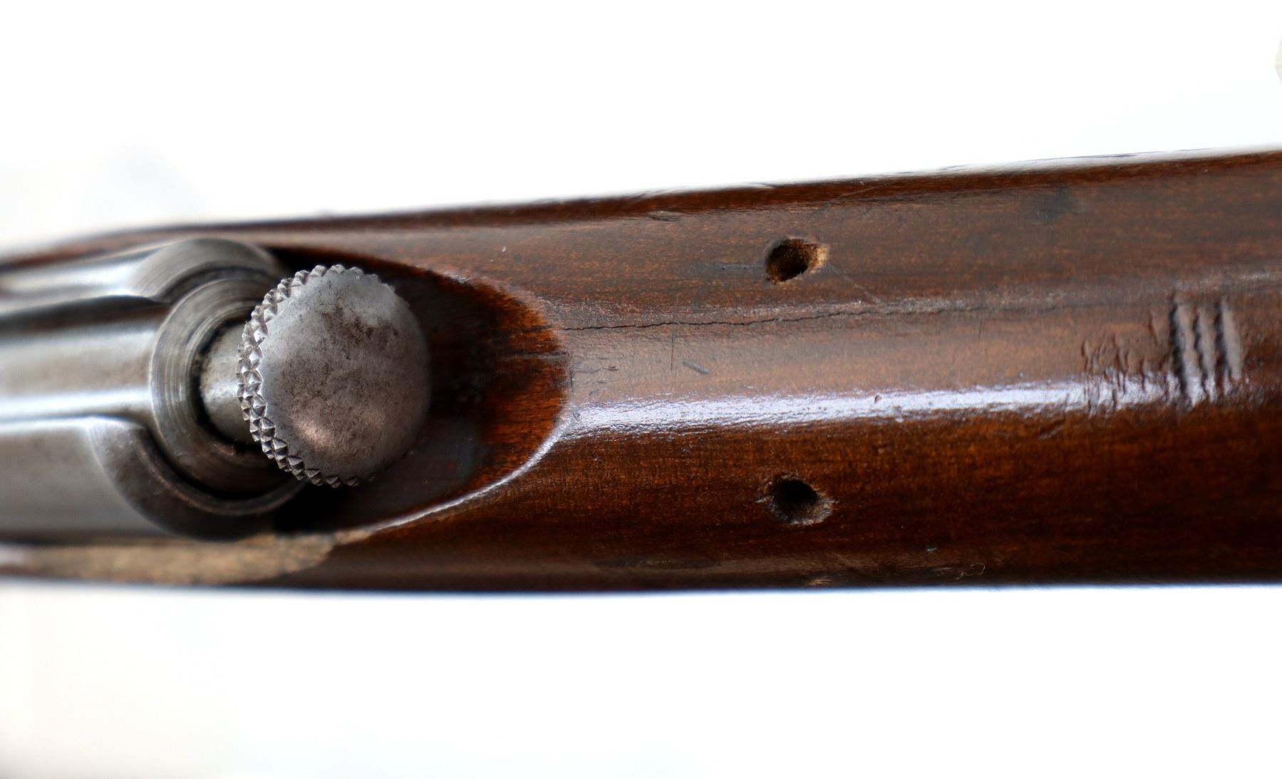 Wear: metal finish turning silver grey with light pitting, rust speckles, scratches, handling marks and wear. Stock shows some marks, scratches and wear.