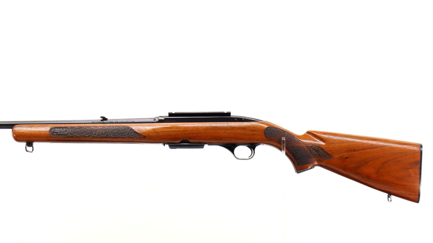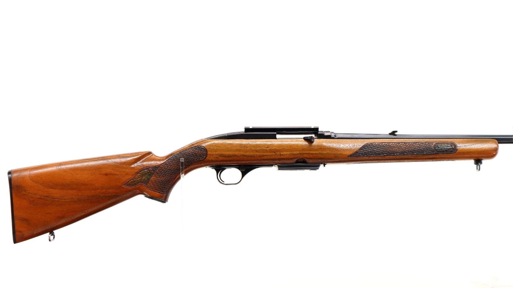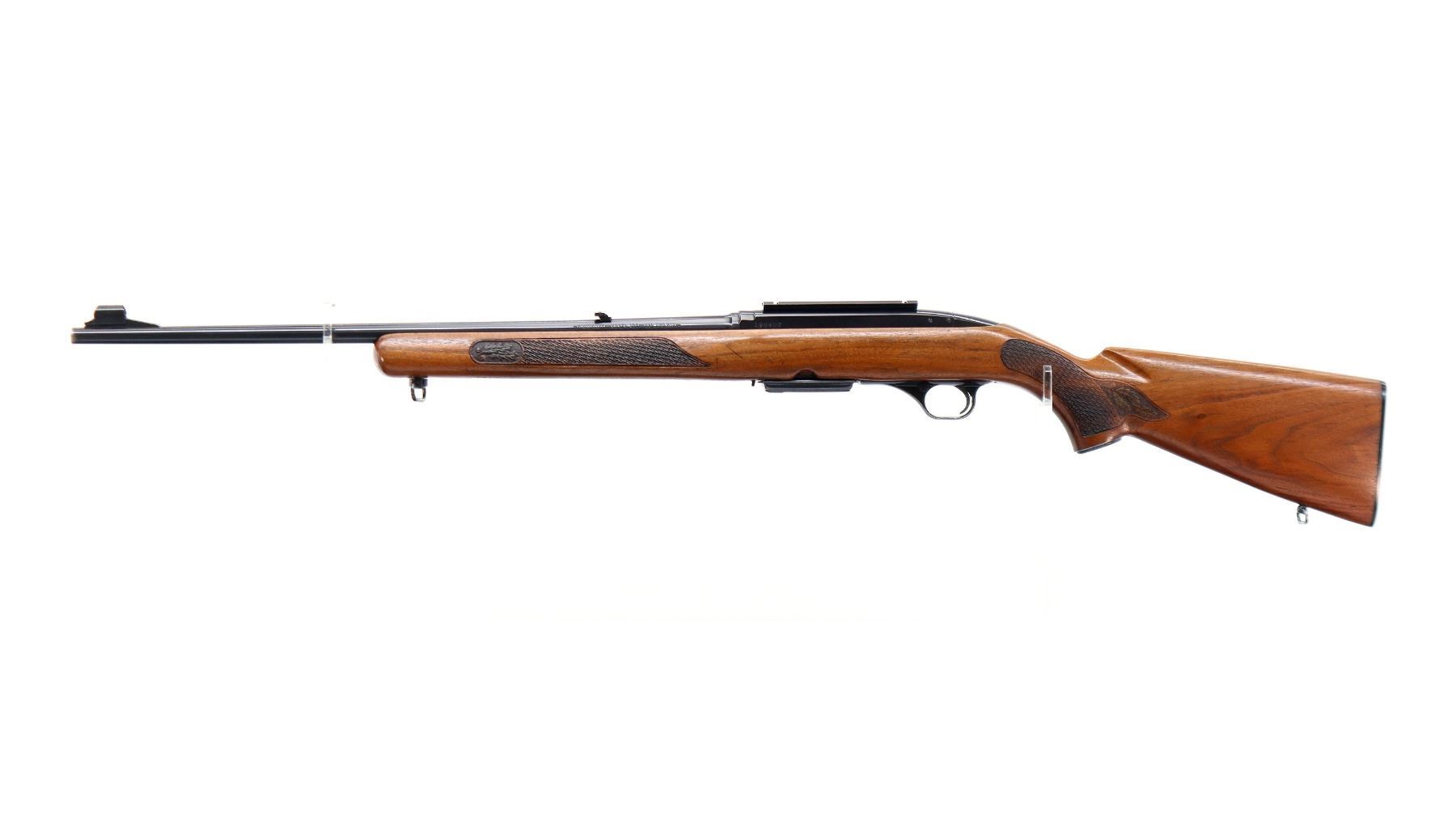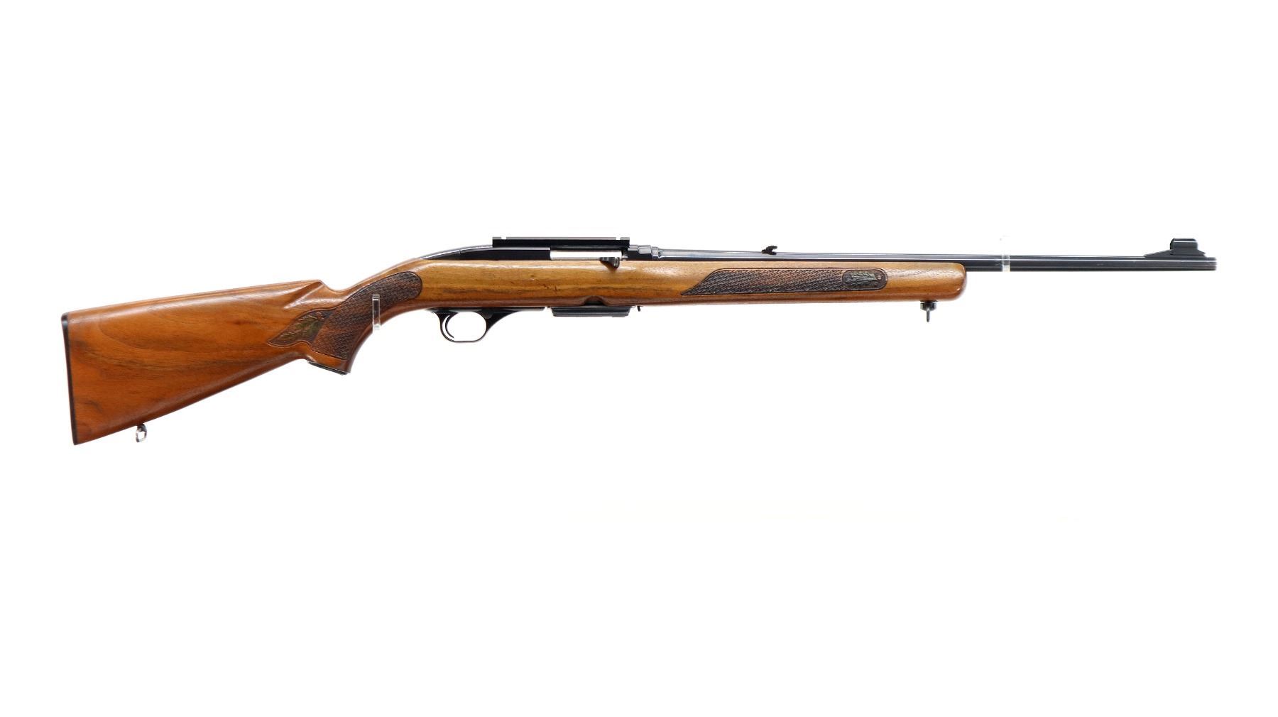 Main Description: Manufactured 1967. Consignor states: has Occasional Ejection Problems. Blade front sight with hood and ramp, adjustable folding u notched rear sight, blued finish, receiver drilled and tapped with one piece scope base installed, grooved cocking handle. One piece wood stock, Basketweave checkered forearm and pistol grip, checkered black polymer butt plate, steel grip cap, sling swivels.