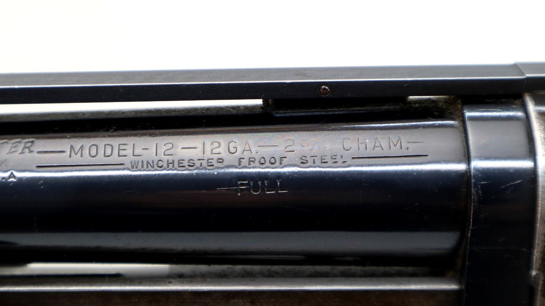 Main Description: Manufactured 1957. White front bead, metal has been reblued with pitting underneath, vent rib. Two piece wood stocks, grooved forearm, pistol grip cracked on right side, checkered black polymer butt plate which is loose with one replaced screw.