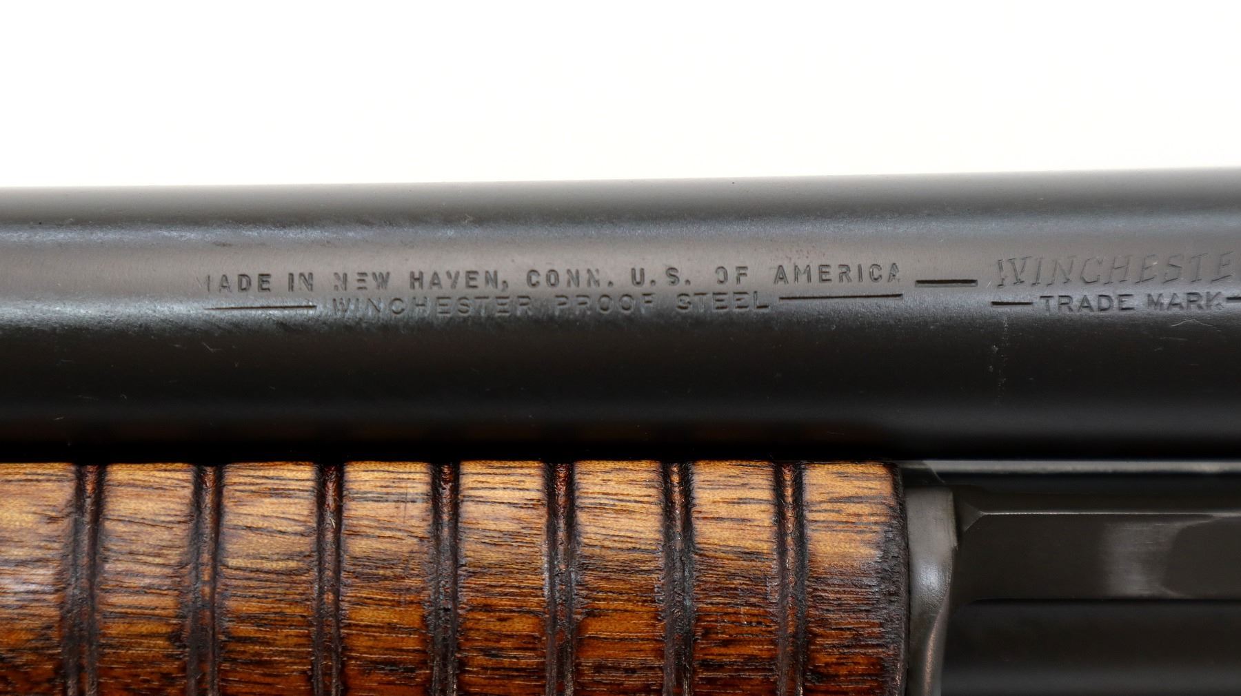 Main Description: Manufactured 1949. Silver bead, metal has been refinished with Satin blueing, round barrel. Two piece wood stocks, grooved forearm, pistol grip, small crack on left side, checkered black polymer butt plate.